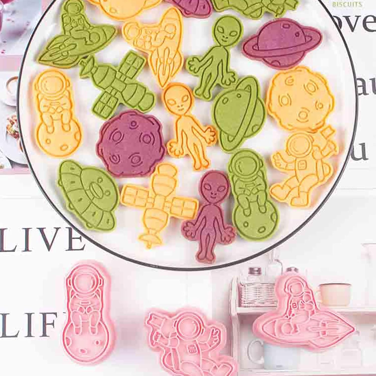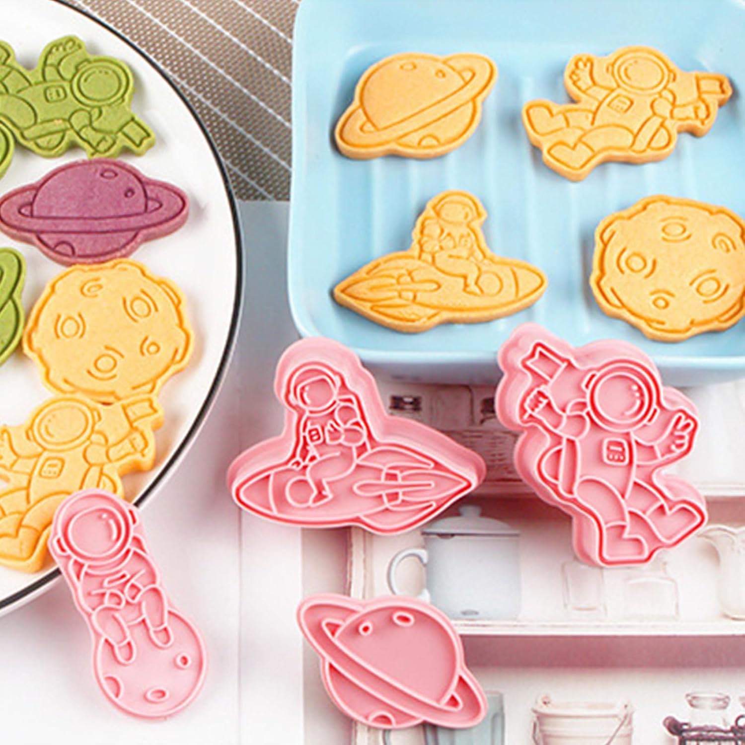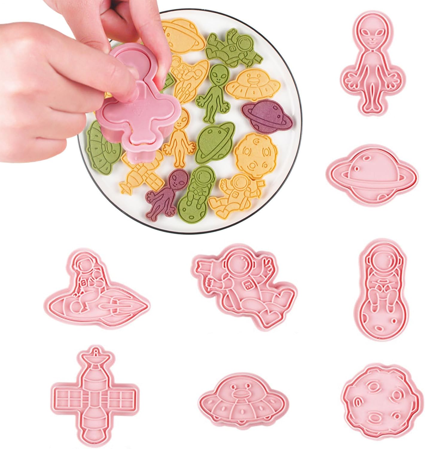 VARI STILI: Con questi stampi per biscotti puoi realizzare deliziosi e adorabili biscotti in 8 forme diverse con astronauti, alieni, astronavi e altro ancora. Questi stampi sono perfetti per realizzare diversi stili di biscotti. Uso durevole: nessuna deformazione, insapore e sicuro per la salute e il nostro stampo per biscotti è dotato di materiale PP durevole per uso alimentare. La superficie liscia e i bordi lo rendono facile da usare, pulire e riporre. Configurazione rapida: crea biscotti da forno in pochi secondi! Premi lo stampo per biscotti sull'impasto per ottenere forme perfette senza arrotolare o tagliare. Ottieni un'esperienza di cottura rapida e senza problemi con questo pratico strumento. Prepara i tuoi dessert: prepara creazioni divine con questo straordinario stampo per biscotti. Divertiti a preparare cibi fai-da-te, deliziosi pasticcini, muffin e deliziosi dessert nel comfort di casa tua. Migliora le tue abilità culinarie e delizia le tue papille gustative con prelibatezze fatte in casa. Semplifica la tua cottura: diventa creativo con i tuoi biscotti con questo stampo per biscotti rigenerante. Un must per gli appassionati di pasticceria e gli chef. Questo è un gadget da cucina di cui tutti hanno bisogno per la propria cucina di casa.