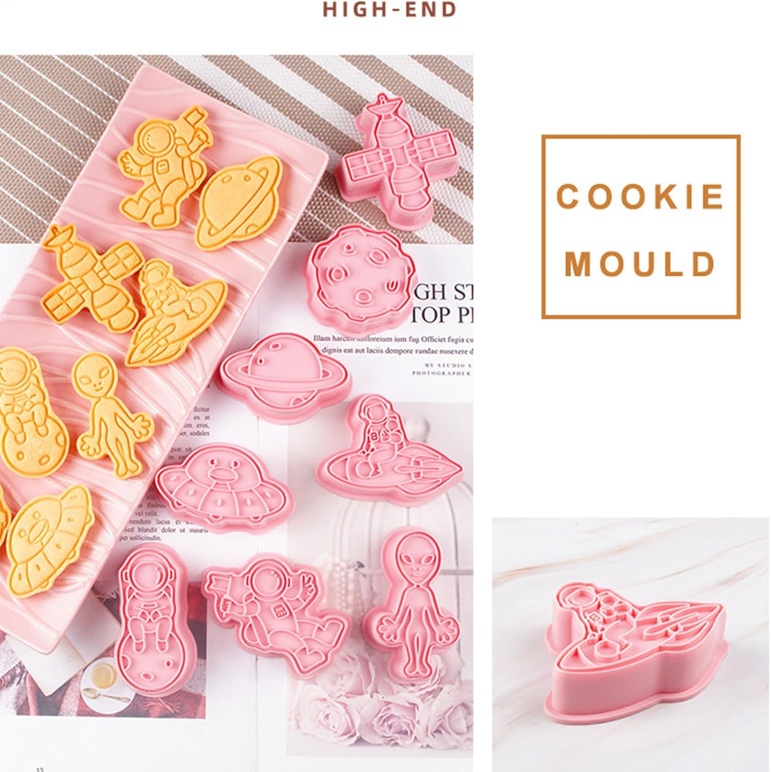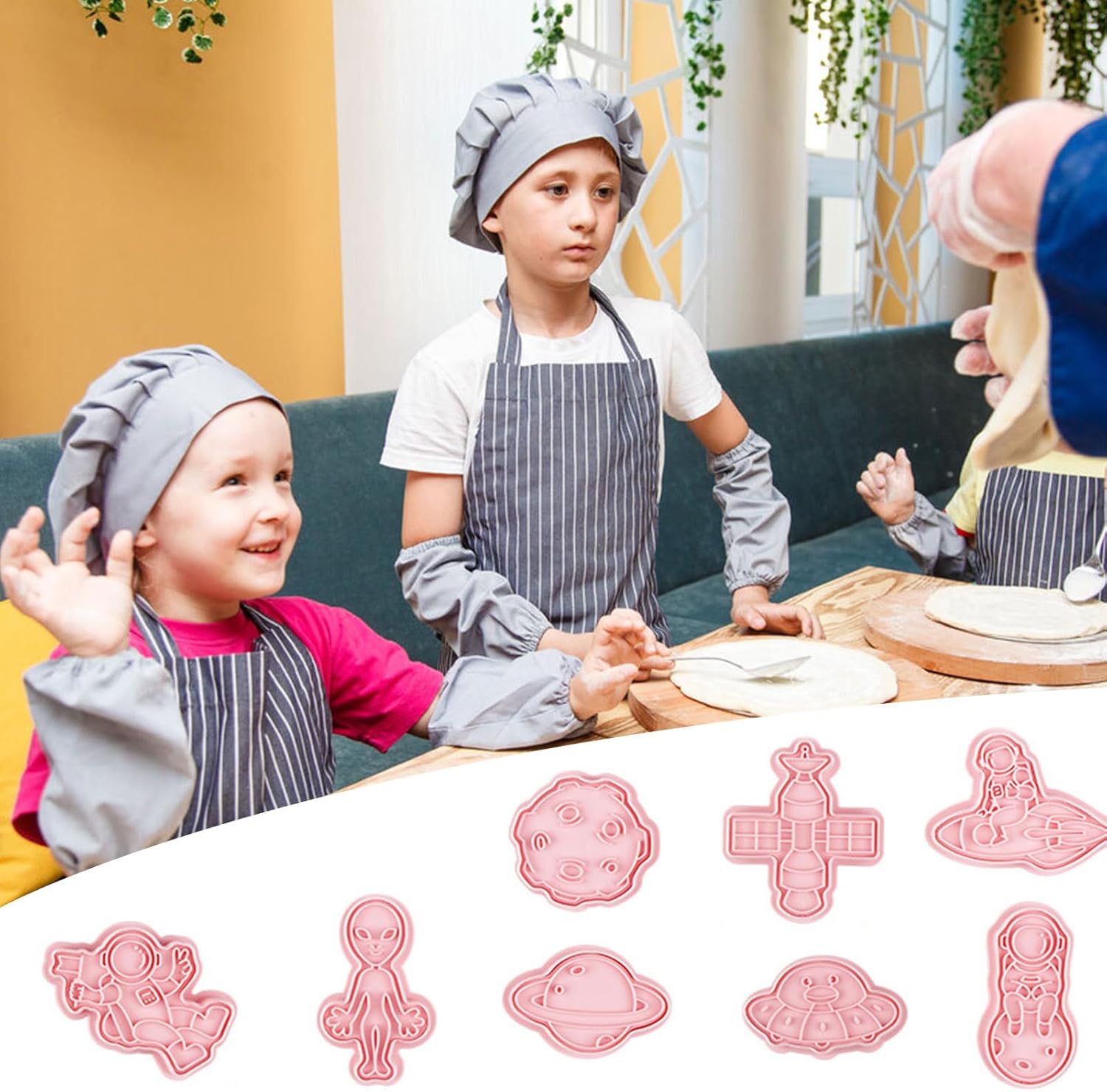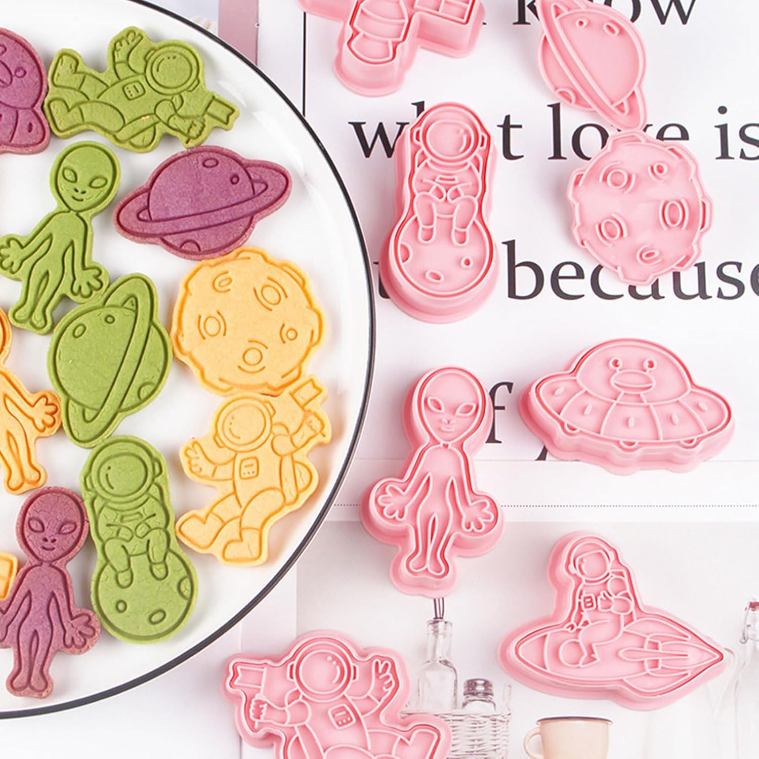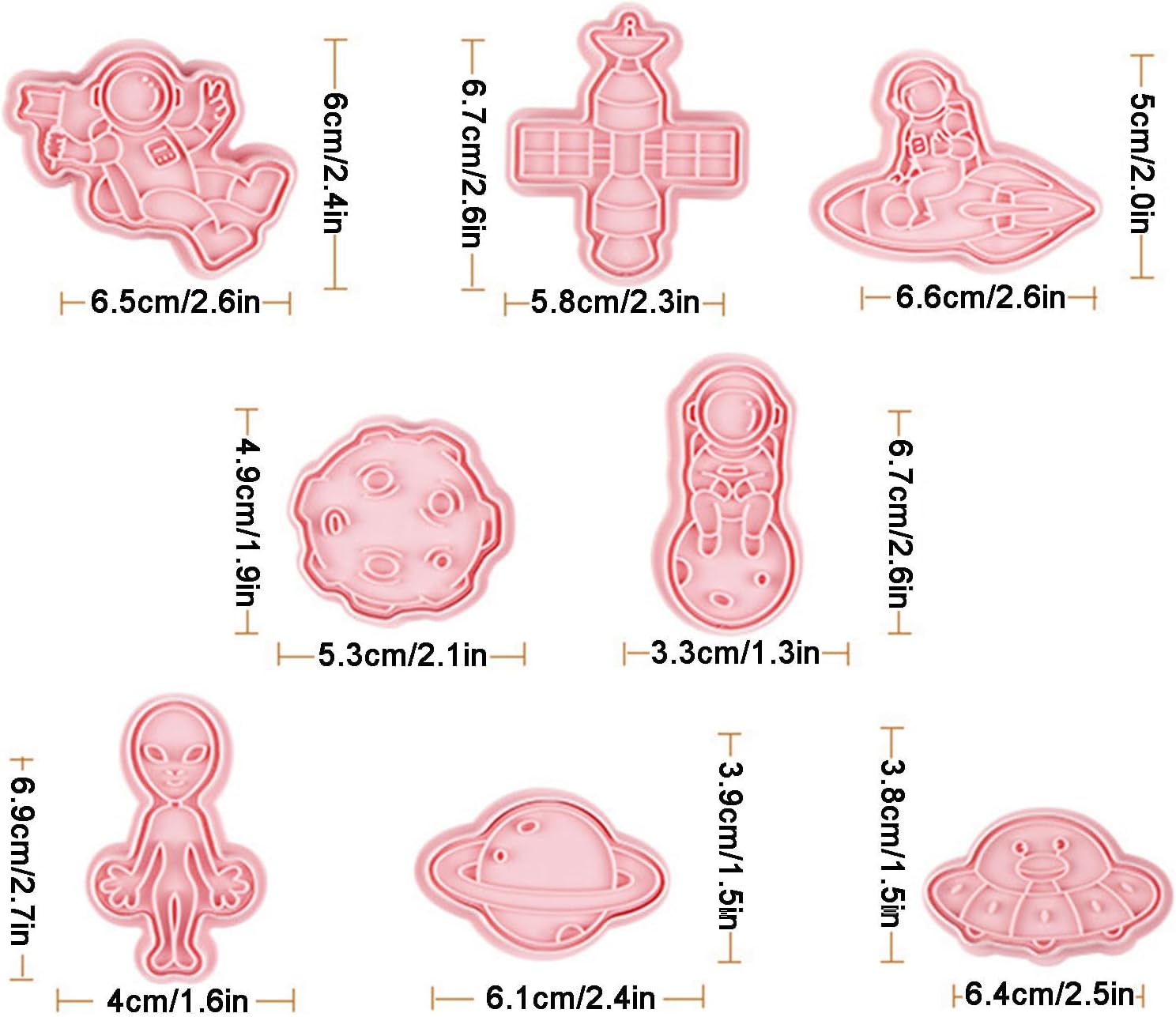 VARI STILI: Con questi stampi per biscotti puoi realizzare deliziosi e adorabili biscotti in 8 forme diverse con astronauti, alieni, astronavi e altro ancora. Questi stampi sono perfetti per realizzare diversi stili di biscotti. Uso durevole: nessuna deformazione, insapore e sicuro per la salute e il nostro stampo per biscotti è dotato di materiale PP durevole per uso alimentare. La superficie liscia e i bordi lo rendono facile da usare, pulire e riporre. Configurazione rapida: crea biscotti da forno in pochi secondi! Premi lo stampo per biscotti sull'impasto per ottenere forme perfette senza arrotolare o tagliare. Ottieni un'esperienza di cottura rapida e senza problemi con questo pratico strumento. Prepara i tuoi dessert: prepara creazioni divine con questo straordinario stampo per biscotti. Divertiti a preparare cibi fai-da-te, deliziosi pasticcini, muffin e deliziosi dessert nel comfort di casa tua. Migliora le tue abilità culinarie e delizia le tue papille gustative con prelibatezze fatte in casa. Semplifica la tua cottura: diventa creativo con i tuoi biscotti con questo stampo per biscotti rigenerante. Un must per gli appassionati di pasticceria e gli chef. Questo è un gadget da cucina di cui tutti hanno bisogno per la propria cucina di casa.