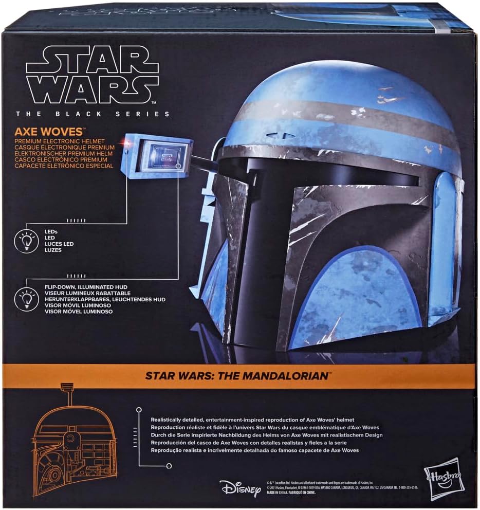 CASCO ELETTRONICO PREMIUM: con decorazioni dettagliate e design ispirato alla serie, questo casco a grandezza naturale è un'iconica aggiunta a qualsiasi collezione di Star Wars "STAR WARS: THE MANDALORIAN": questo casco elettronico premium di Axe Woves della Star Wars The Black Series è ispirato alla serie live-action "Star Wars: The Mandalorian" su Disney+ TELEMETRO ILLUMINATO CON HEADS-UP DISPLAY (HUD): basta premere un pulsante per abbassare il telemetro e attivare dei LED che lampeggiano "per la caccia" e il display heads-up illuminato da LED VESTIBILITÀ REGOLABILE: questo casco ispirato a "The Mandalorian" dispone di una fascia di sostegno regolabile AXE WOVES: abile guerriero e corsaro, Axe Woves viaggia per la galassia come mercenario mandaloriano REALIZZA UNA COLLEZIONE EPICA: cerca altri articoli per roleplay premium della serie Star Wars The Black Series, come la collezione di spade laser Force FX (venduti separatamente, secondo disponibilità)