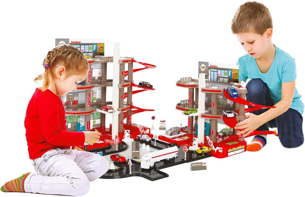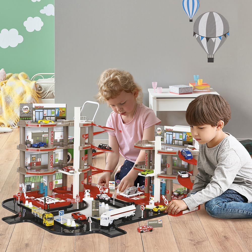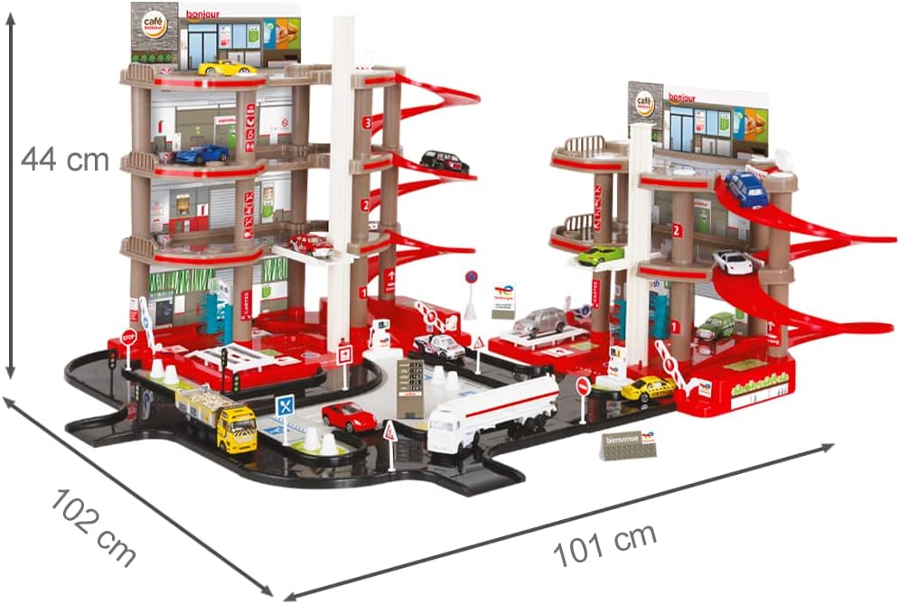 Doppio garage TOTAL a 4 piani con stazione di servizio completa di 3 piani Contiene 2 stazioni di lavaggio, 2 officine di riparazione, 2 ascensori e 2 metri di pista, perfetto per ospitare le vostre piccole auto (attenzione, non incluse) Questo garage realistico permette di immergersi per ore in storie piene di colpi di scena I suoi molteplici accessori consentono una rigiocabilità quasi infinita Dimensioni: 102 x 101 x 44 cm Progettazione francese & fabbricazione europea