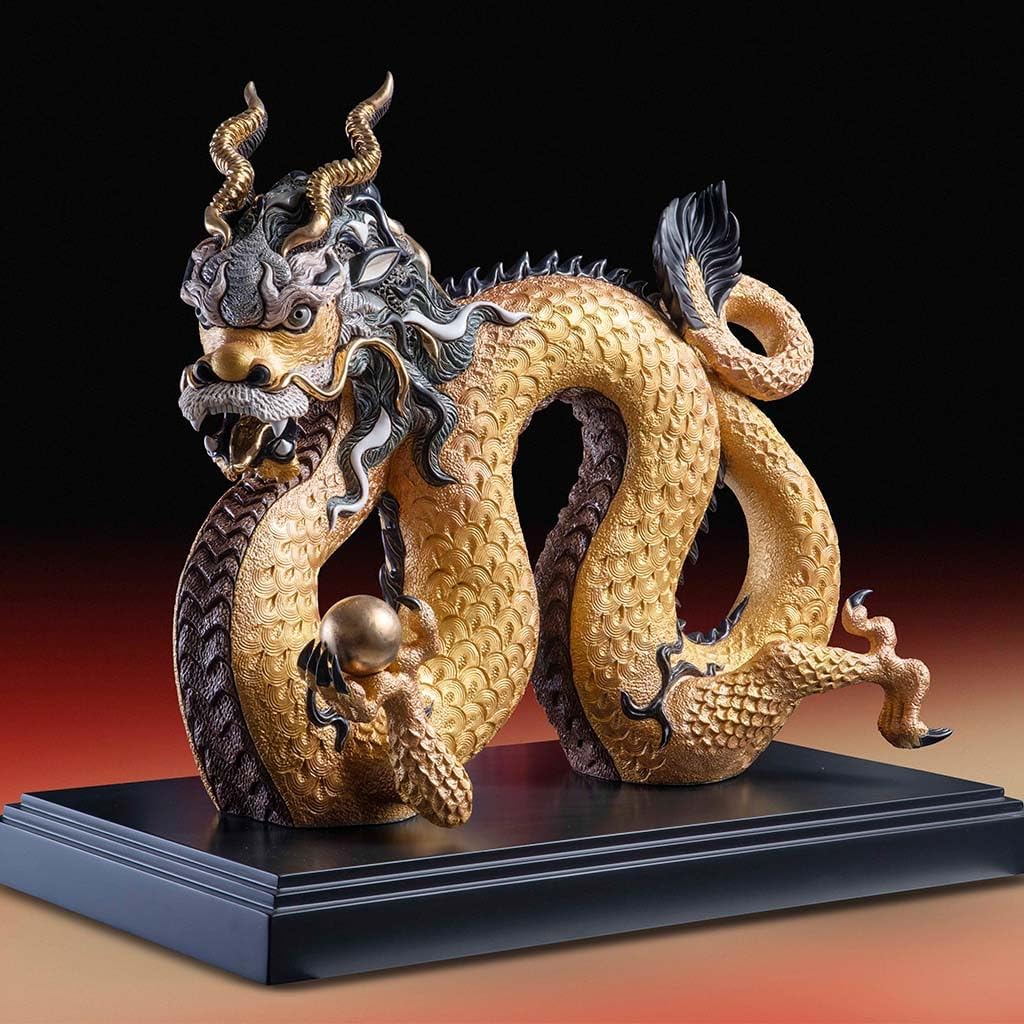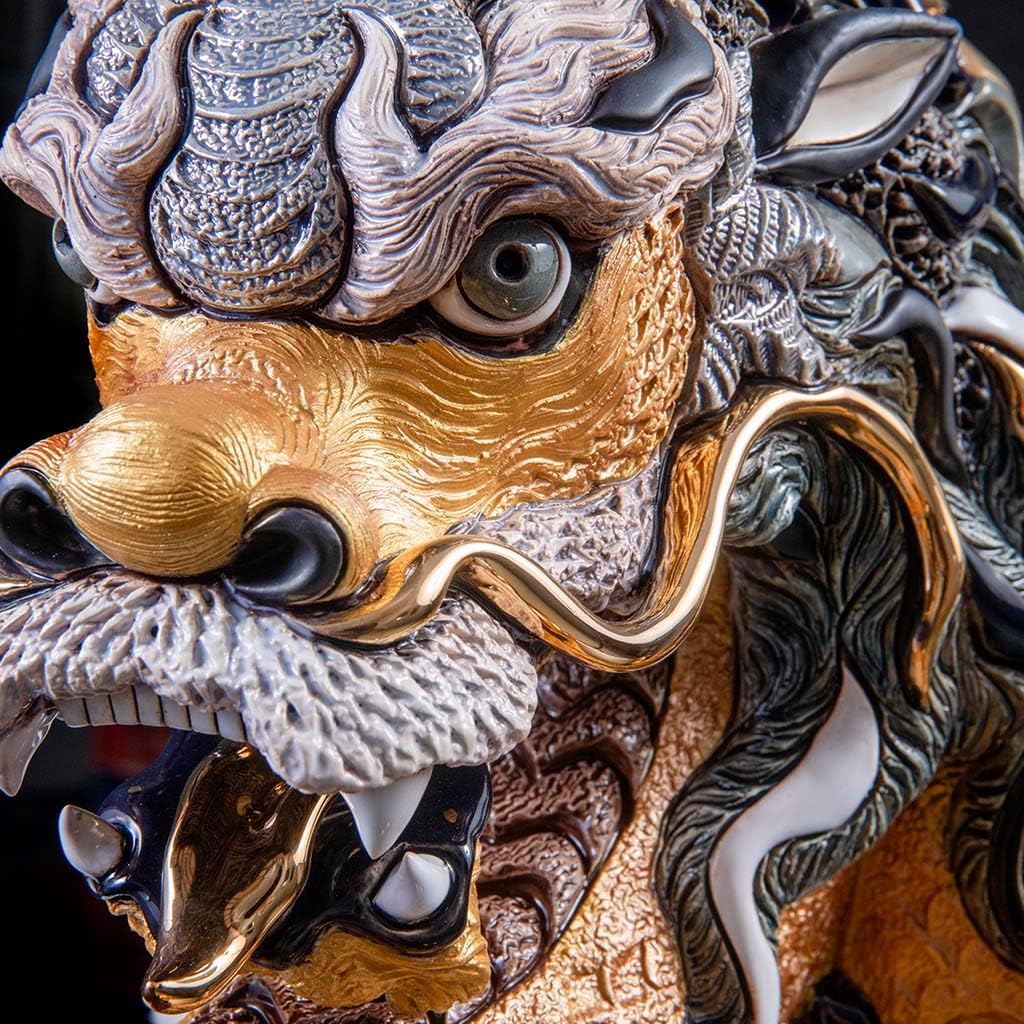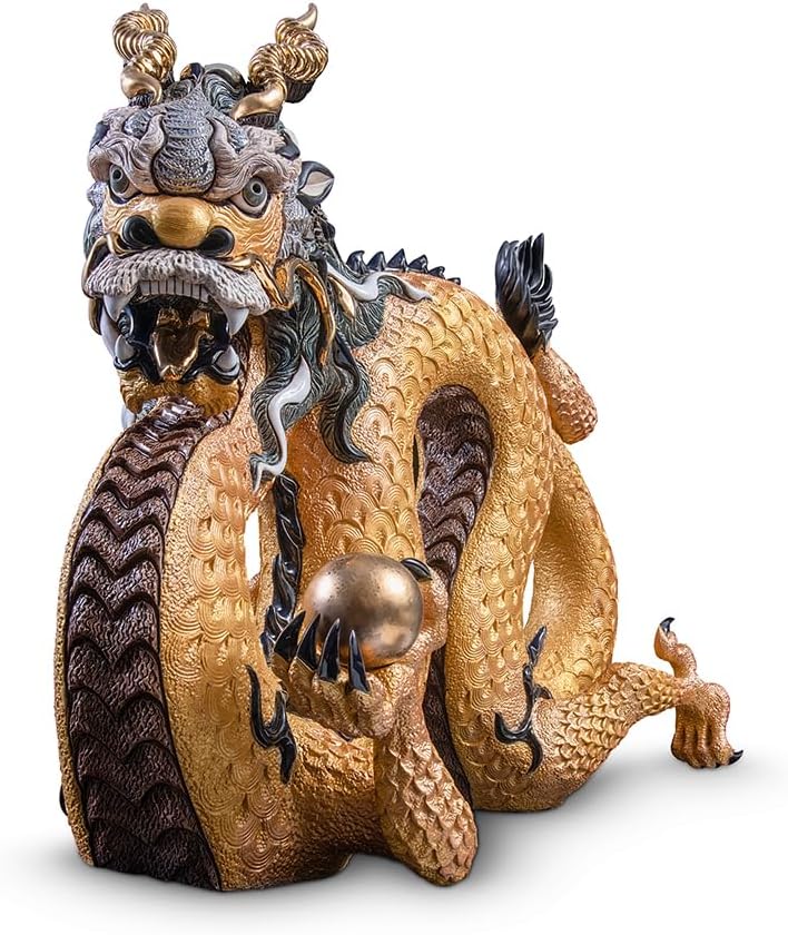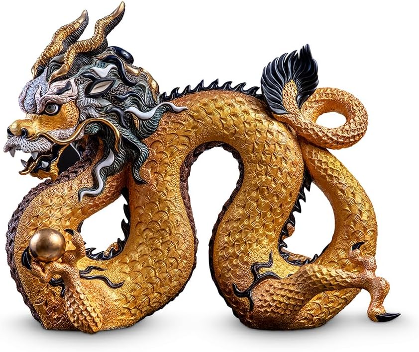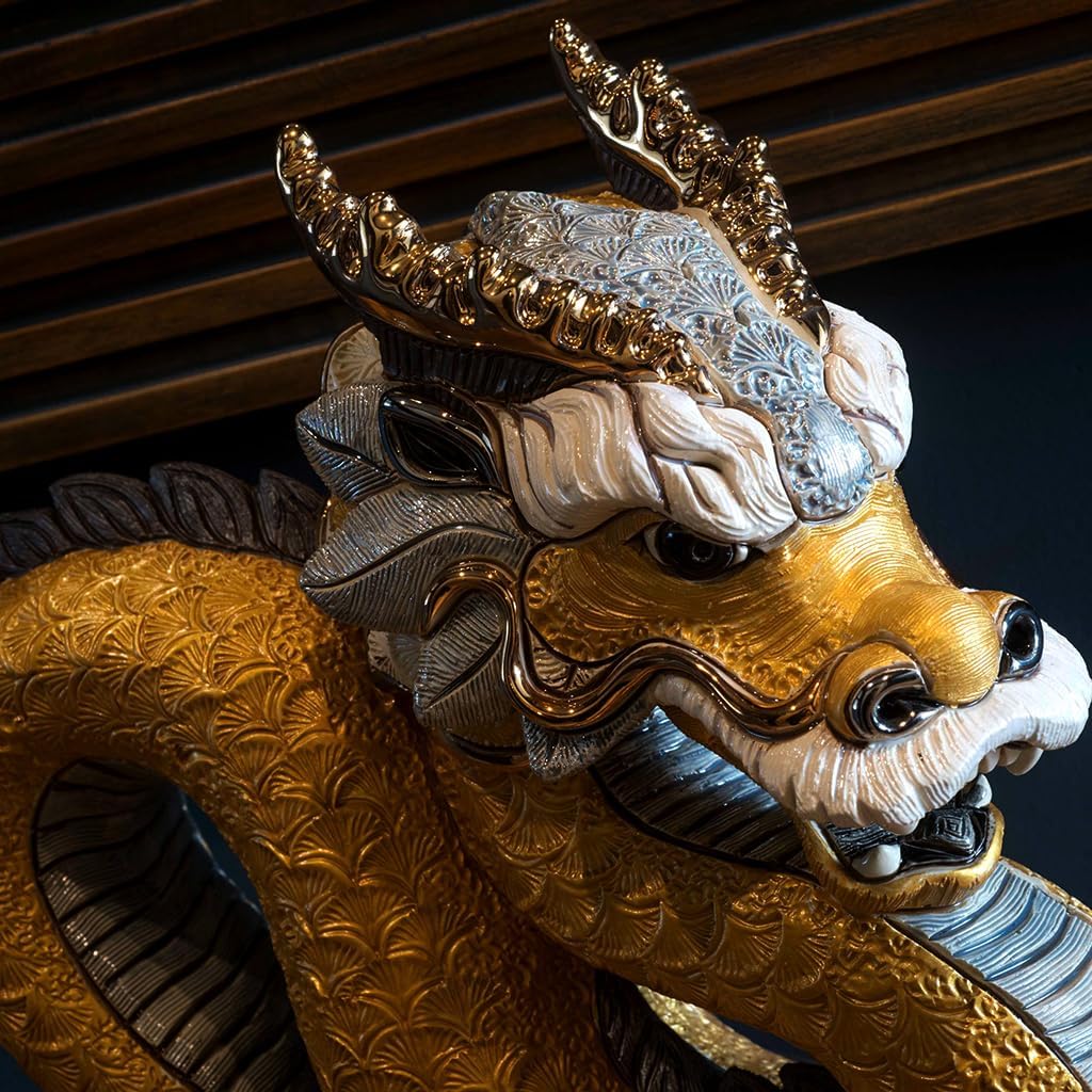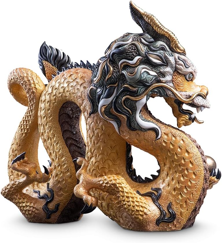 Scopri le figurine artigianali della collezione Exquisite De Rosa Questo nuovo drago cinese re in edizione limitata è realizzato con la massima artigianalità, il pezzo più complesso e dettagliato mai creato da De Rosa! Migliora l'arredamento della tua casa con l'eleganza senza tempo delle figurine fatte a mano De Rosa Collection. Ogni pezzo è meticolosamente realizzato da abili artigiani, mescolando tecniche tradizionali con design contemporaneo per creare splendide opere d'arte. Creare la scultura del drago cinese con dettagli intricati è stato davvero un processo entusiasmante che ha richiesto oltre 2 anni. Dalla modellazione del pezzo originale, concettualizzare la posa, le dimensioni e l'aspetto generale del drago alla sua cottura finale nel forno... il design richiede una meticolosa attenzione ai dettagli, quindi pazienza, abilità e passione per il fatto a mano sono la chiave per creare con successo una scultura così complessa e dettagliata. Come ogni dettaglio di questo pezzo mozzafiato, ogni singola scala sulla pelle del drago è meticolosamente scolpita a mano dal nostro artista più abile con una mano ferma e un occhio per la precisione. Per ottenere il risultato desiderato, l'abbellimento del drago combina finiture lucide e satinate. La finitura lucida aggiunge una superficie riflettente e lucida, mentre la finitura satinata fornisce un aspetto liscio e leggermente opaco. Questa combinazione crea un contrasto visivamente sorprendente e migliora l'estetica generale. Viene fornito con la base in legno laccato. La creazione di questa scultura di drago comporta una combinazione di competenza artistica, dettagli intricati e tecniche specializzate. Il risultato è una magnifica opera d'arte che incarna il potere, la prosperità e la buona fortuna associati a questa mitica creatura. I draghi nella mitologia cinese sono considerati tremendamente significativi che significano fortuna, forza e potere. I cinesi si consideravano discendenti dei draghi, specialmente degli antichi imperatori, e i draghi sono stati lo spirito dominante che ha guidato la cultura cinese. Dall'antica rappresentazione mitologica, i draghi cinesi si sono fatti strada verso feste e funzioni moderne e vengono celebrati ovunque nei paesi dell'Asia orientale come Cina, Corea, Giappone, Mongolia e Thailandia. I draghi sono associati a cinque elementi della terra e chiamati Acqua, Legno, Fuoco, Terra e Draghi metallici. I draghi trovano la quinta posizione nel cerchio zodiacale e gli anni prendono il nome dal drago come altri simboli zodiacali. Le persone nate in Dragon Year sono considerate sicure di sé, ambiziose, leader, sane e amorevoli. Perché scegliere la collezione De Rosa? Artigianato unico: ogni creazione delle Collezioni De Rosa è il risultato di un processo artigianale unico di altissima qualità tecnica e artistica. Ogni statuetta è scolpita e dipinta a mano; assicurandosi che non ci siano due soggetti scolpiti esattamente allo stesso modo. Intagliato a mano e dipinto a mano in Uruguay, le nostre sculture sono accentate con platino, oro e smalti vibranti. Materiali di alta qualità: realizzate in ceramica di alta qualità e ornate con smalto vivace e metalli preziosi, queste statuette sono costruite per durare. Eccellenza artistica: i dettagli intricati e i colori ricchi riflettono la passione e la dedizione degli artigiani, rendendo ogni statuetta un vero capolavoro. Decorazione versatile: perfette per qualsiasi stanza della tua casa, queste statuette aggiungono un tocco di raffinatezza e fascino al tuo spazio abitativo. Perfetto per collezionisti e donatori di regali Che tu sia un appassionato collezionista o che cerchi il regalo perfetto, le figurine della collezione De Rosa sono una scelta senza tempo. La loro bellezza e artigianalità li rendono una preziosa aggiunta a qualsiasi collezione.