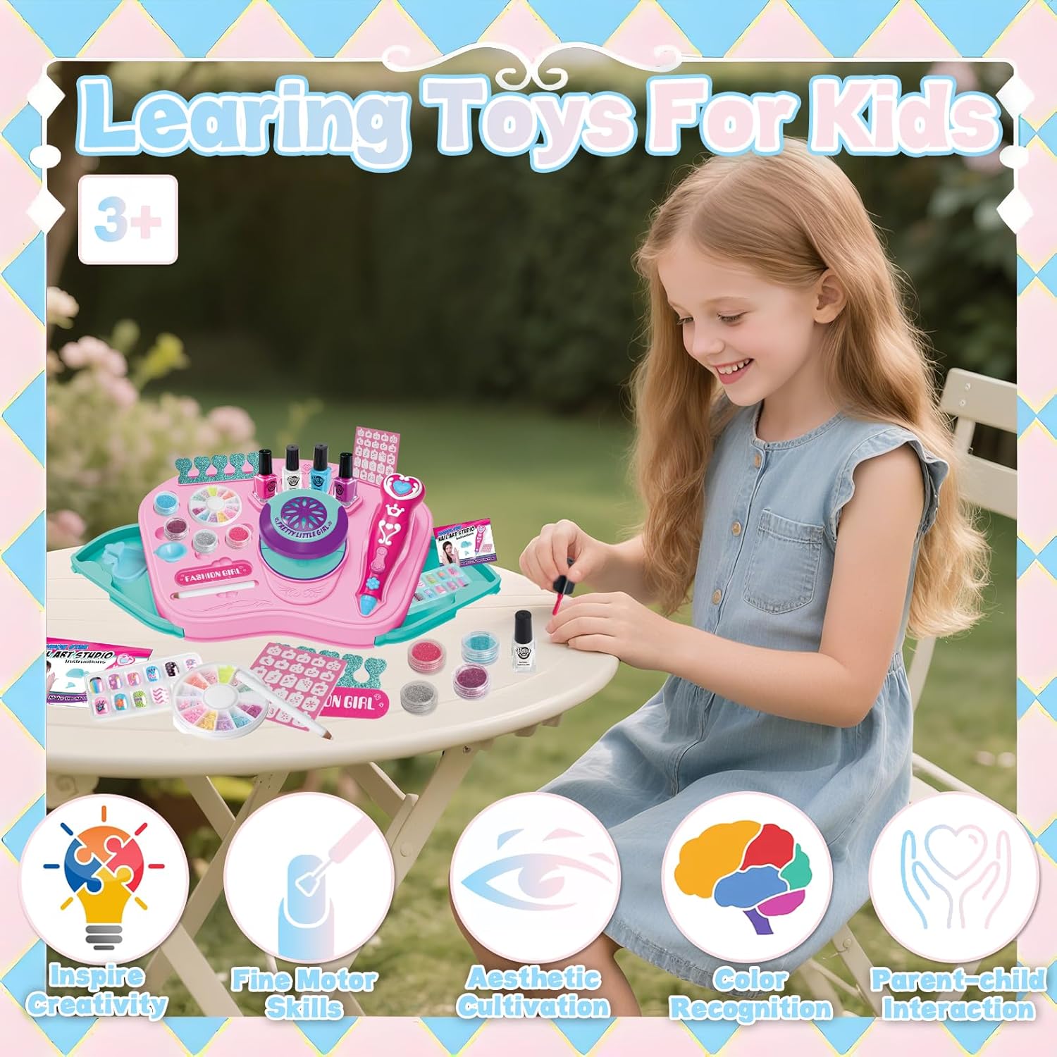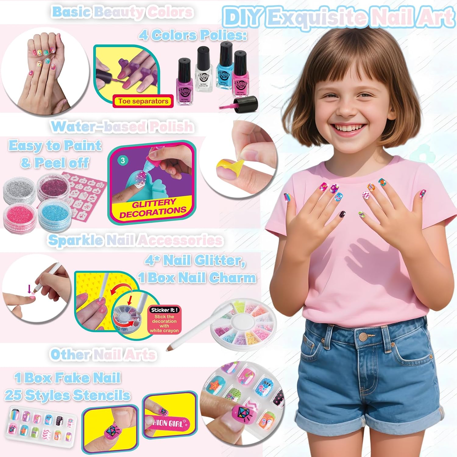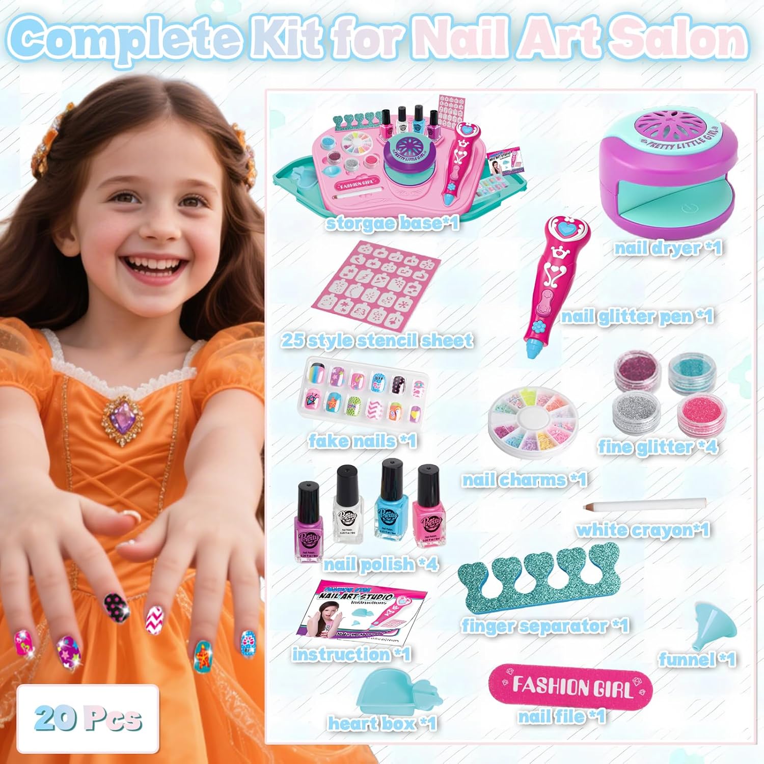 Studio per nail art tutto in uno: questo kit per nail art da 20 pezzi viene fornito completo di 1 base portaoggetti, 1 asciuga unghie, 1 penna per unghie glitterata, 4 smalti colorati, 1 separatore per dita, 1 lima per unghie, 1 scatola di ciondoli colorati per unghie, 1 foglio di fustelle per unghie, 4 glitter, 1 scatola di unghie finte, 1 imbuto, 1 matita bianca e 1 scatola blu a forma di cuore. Accompagna le bambine attraverso tutti i passaggi fondamentali dell'esperienza di un salone di bellezza. Set di bellezza adatto ai bambini: realizzati con ingredienti delicati e materiali di alta qualità, questi smalti per unghie a base d'acqua per bambini si asciugano rapidamente e sono facili da staccare o lavare. Non c'è bisogno di solventi aggressivi! L'asciuga unghie emette solo aria a temperatura ambiente, quindi non c'è rischio di bruciarsi le manine. Questo set di smalti per ragazze permette ai bambini di esplorare la loro curiosità e creare secondo il loro cuore senza alcun danno. Scintillante divertimento per le unghie fai-da-te: più che semplicemente disegnare le unghie con gli smalti, è un'attività di design fai-da-te alla moda! Le ragazze possono creare innumerevoli stili di nail art basati sulle proprie idee, e ogni look unico mostra la loro creatività personale. Questo set di smalti per bambini alimenta l'immaginazione infinita e incoraggia i bambini a fare brainstorming e progettare unghie vivaci e accattivanti. Gioca e impara tutto in uno: il nostro set di smalti per bambini aiuta le ragazze ad accendere la loro immaginazione e sviluppare abilità estetiche attraverso la nail art fai-da-te. Inoltre, è perfetto per giocare con mamma o papà e promuovere il legame tra genitori e figli mentre creano! Conservazione portatile e ordinata: include una comoda base portaoggetti per mantenere tutti gli accessori organizzati e facili da riporre. Ideale per il gioco a casa, i viaggi, i saloni di bellezza o il divertimento in camera da letto. Questo set di smalti per ragazze è un regalo fantastico per compleanni, Natale, feste per bambini, giochi di ruolo e altro ancora. Unisciti al divertimento del salone di bellezza oggi stesso!