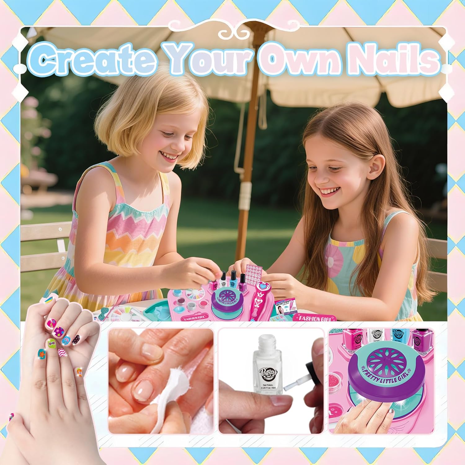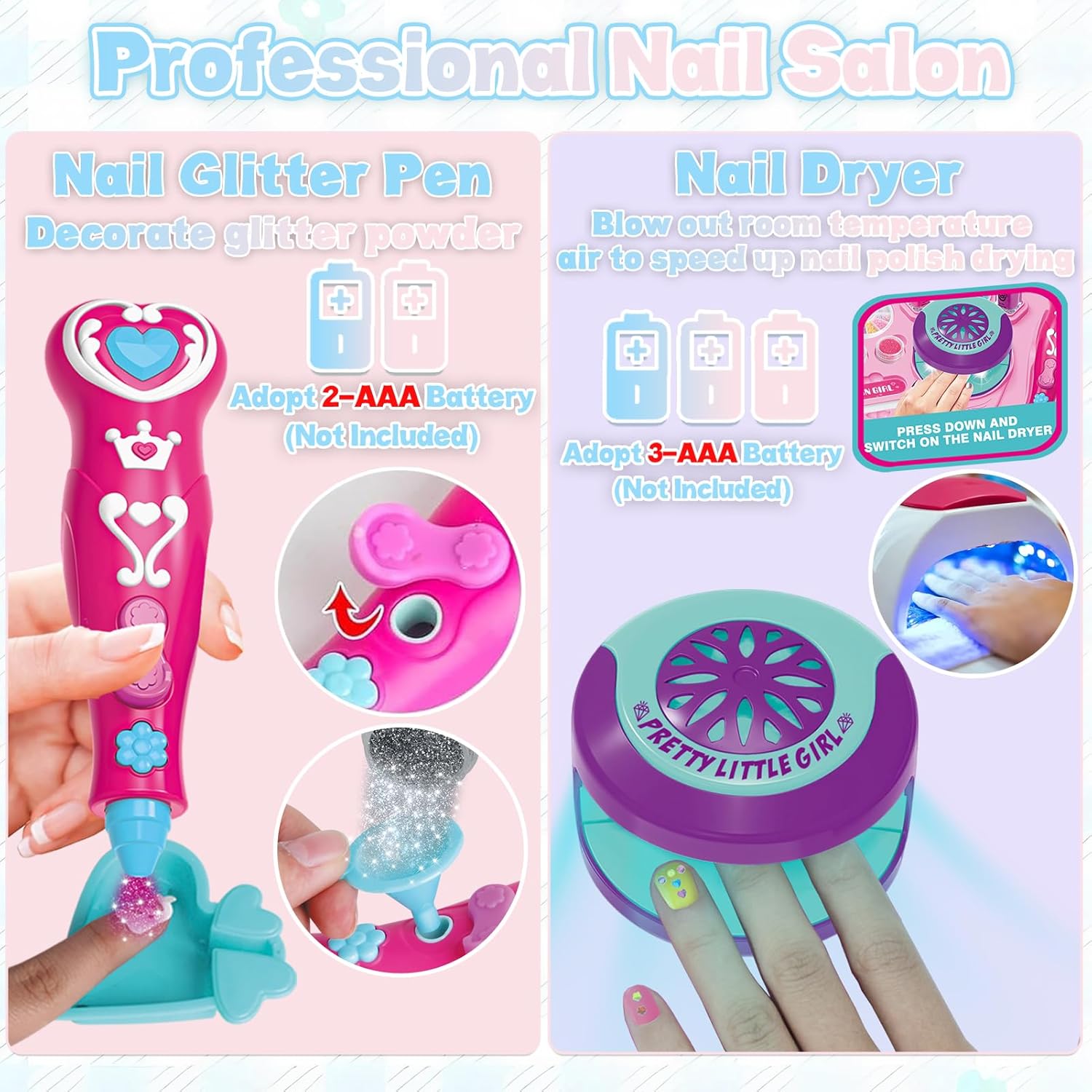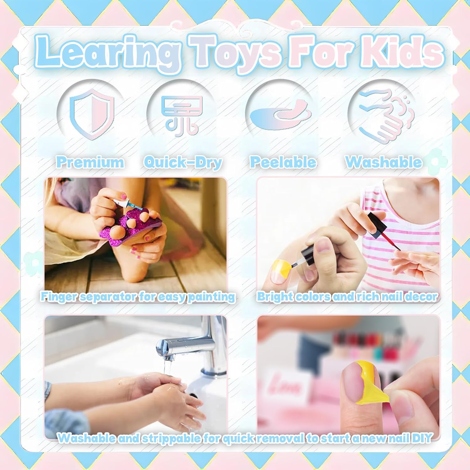 Studio per nail art tutto in uno: questo kit per nail art da 20 pezzi viene fornito completo di 1 base portaoggetti, 1 asciuga unghie, 1 penna per unghie glitterata, 4 smalti colorati, 1 separatore per dita, 1 lima per unghie, 1 scatola di ciondoli colorati per unghie, 1 foglio di fustelle per unghie, 4 glitter, 1 scatola di unghie finte, 1 imbuto, 1 matita bianca e 1 scatola blu a forma di cuore. Accompagna le bambine attraverso tutti i passaggi fondamentali dell'esperienza di un salone di bellezza. Set di bellezza adatto ai bambini: realizzati con ingredienti delicati e materiali di alta qualità, questi smalti per unghie a base d'acqua per bambini si asciugano rapidamente e sono facili da staccare o lavare. Non c'è bisogno di solventi aggressivi! L'asciuga unghie emette solo aria a temperatura ambiente, quindi non c'è rischio di bruciarsi le manine. Questo set di smalti per ragazze permette ai bambini di esplorare la loro curiosità e creare secondo il loro cuore senza alcun danno. Scintillante divertimento per le unghie fai-da-te: più che semplicemente disegnare le unghie con gli smalti, è un'attività di design fai-da-te alla moda! Le ragazze possono creare innumerevoli stili di nail art basati sulle proprie idee, e ogni look unico mostra la loro creatività personale. Questo set di smalti per bambini alimenta l'immaginazione infinita e incoraggia i bambini a fare brainstorming e progettare unghie vivaci e accattivanti. Gioca e impara tutto in uno: il nostro set di smalti per bambini aiuta le ragazze ad accendere la loro immaginazione e sviluppare abilità estetiche attraverso la nail art fai-da-te. Inoltre, è perfetto per giocare con mamma o papà e promuovere il legame tra genitori e figli mentre creano! Conservazione portatile e ordinata: include una comoda base portaoggetti per mantenere tutti gli accessori organizzati e facili da riporre. Ideale per il gioco a casa, i viaggi, i saloni di bellezza o il divertimento in camera da letto. Questo set di smalti per ragazze è un regalo fantastico per compleanni, Natale, feste per bambini, giochi di ruolo e altro ancora. Unisciti al divertimento del salone di bellezza oggi stesso!
