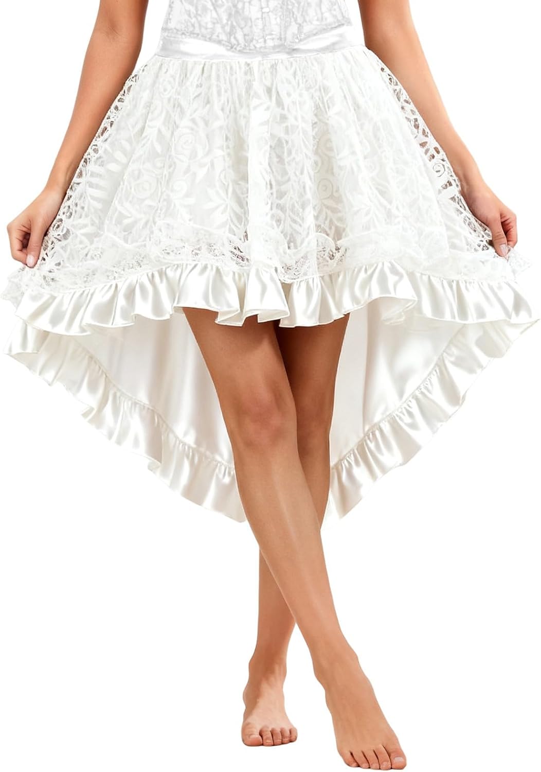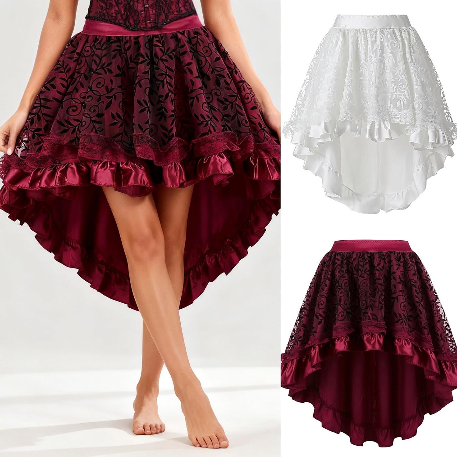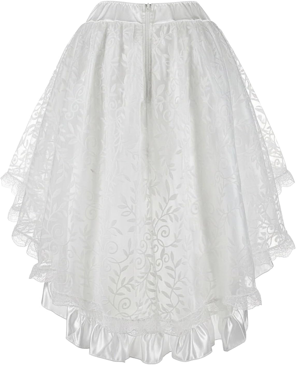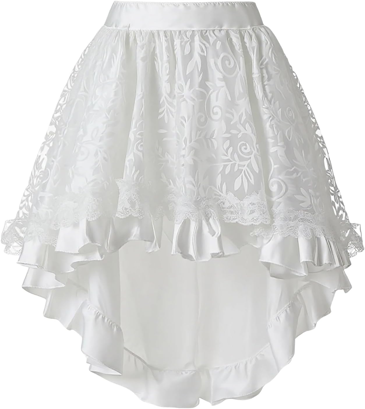 Questa gonna steampunk da donna è una gonna a corsetto di Halloween con caratteristiche gotiche, decorazione in pizzo, stile vintage punk, vita alta, dettagli increspati, forma asimmetrica, lunga lunghezza, elemento rinascimentale, design vittoriano e caratteristiche medievali. È adatto per Halloween, cosplay, feste, eventi medievali, carnevale, nonché come abbigliamento steampunk e gonna festiva.