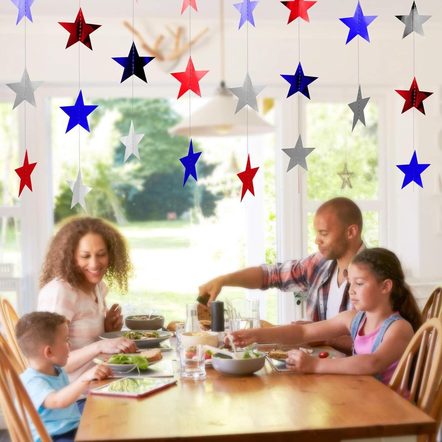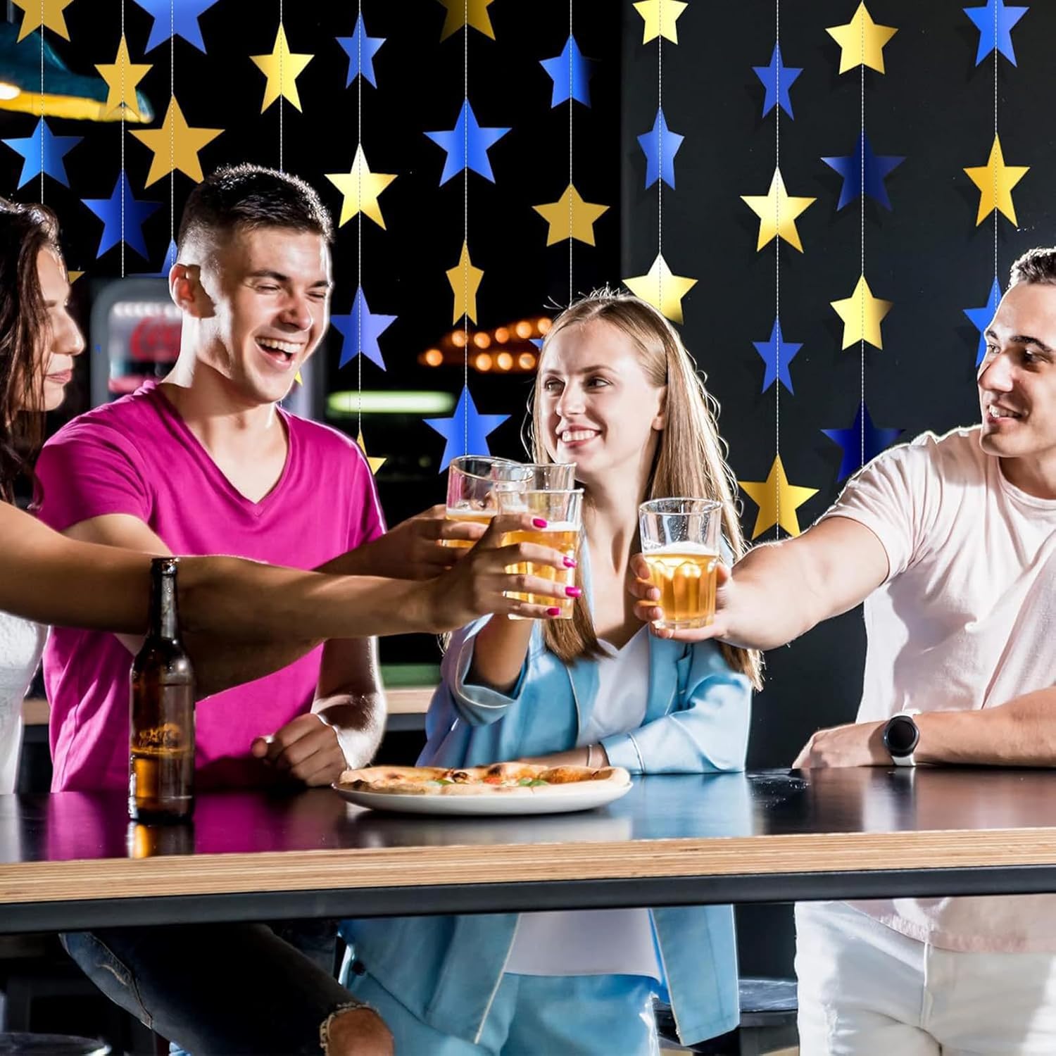 Ghirlande di stelle multicolori creano decorazioni accattivanti per le celebrazioni festive. Questi ornamenti pendenti sono realizzati in materiale cartaceo e presentano disegni prefabbricati per una facile installazione su pareti e soffitti. per organizzatori di eventi, amanti delle vacanze e genitori che cercano forniture per feste per riunioni di famiglia o eventi scolastici. Trasforma feste di compleanno, ricevimenti di matrimonio, lauree ed eventi stagionali con questi accessori decorativi. Queste stelle presentano colori resistenti allo sbiadimento per composizioni ornamentali festive sostenibili.