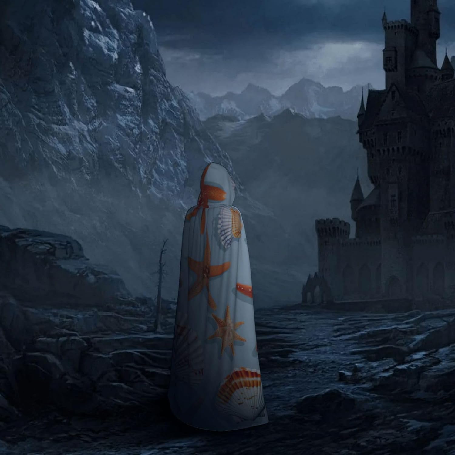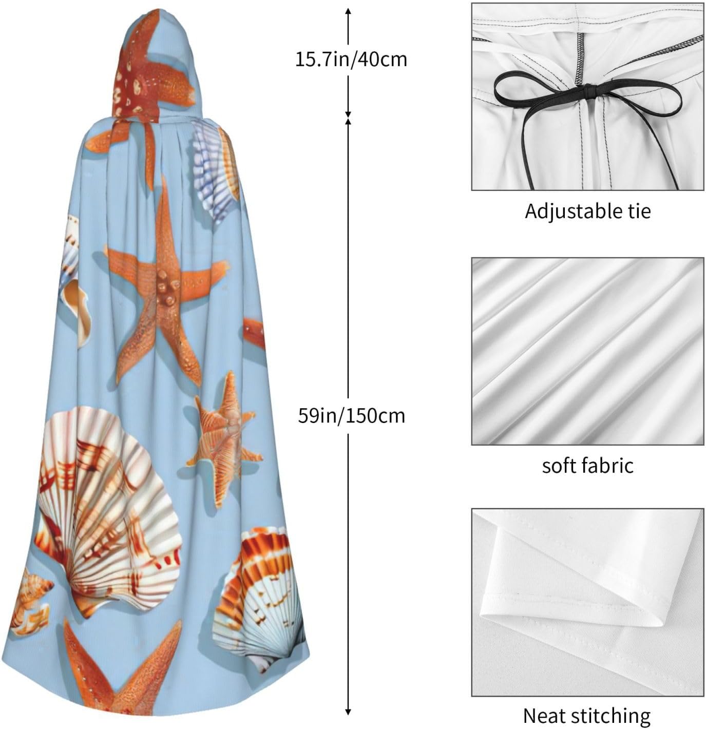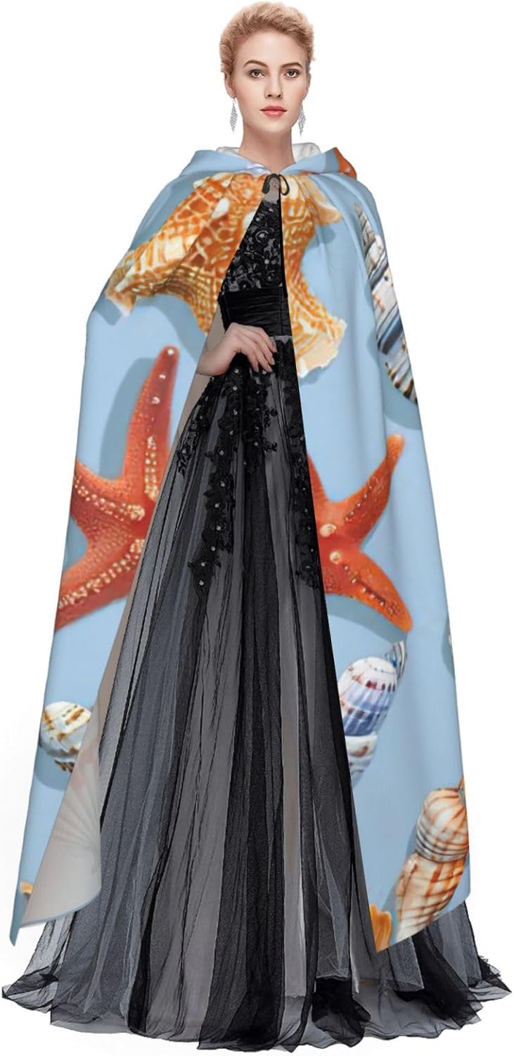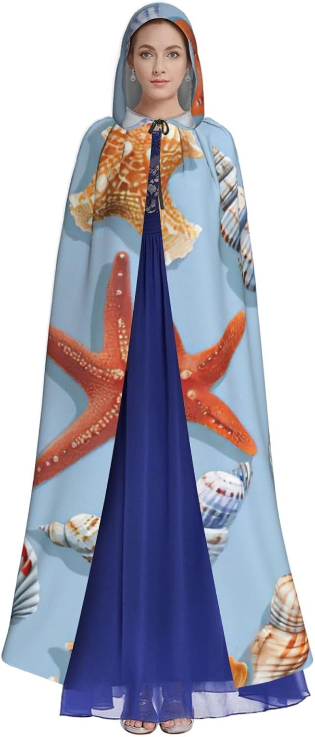 Stella marina e conchiglia modello stampa mantello con cappuccio unisex per adulti Halloween lunghezza intera mantello uomo mantello con cappuccio costume