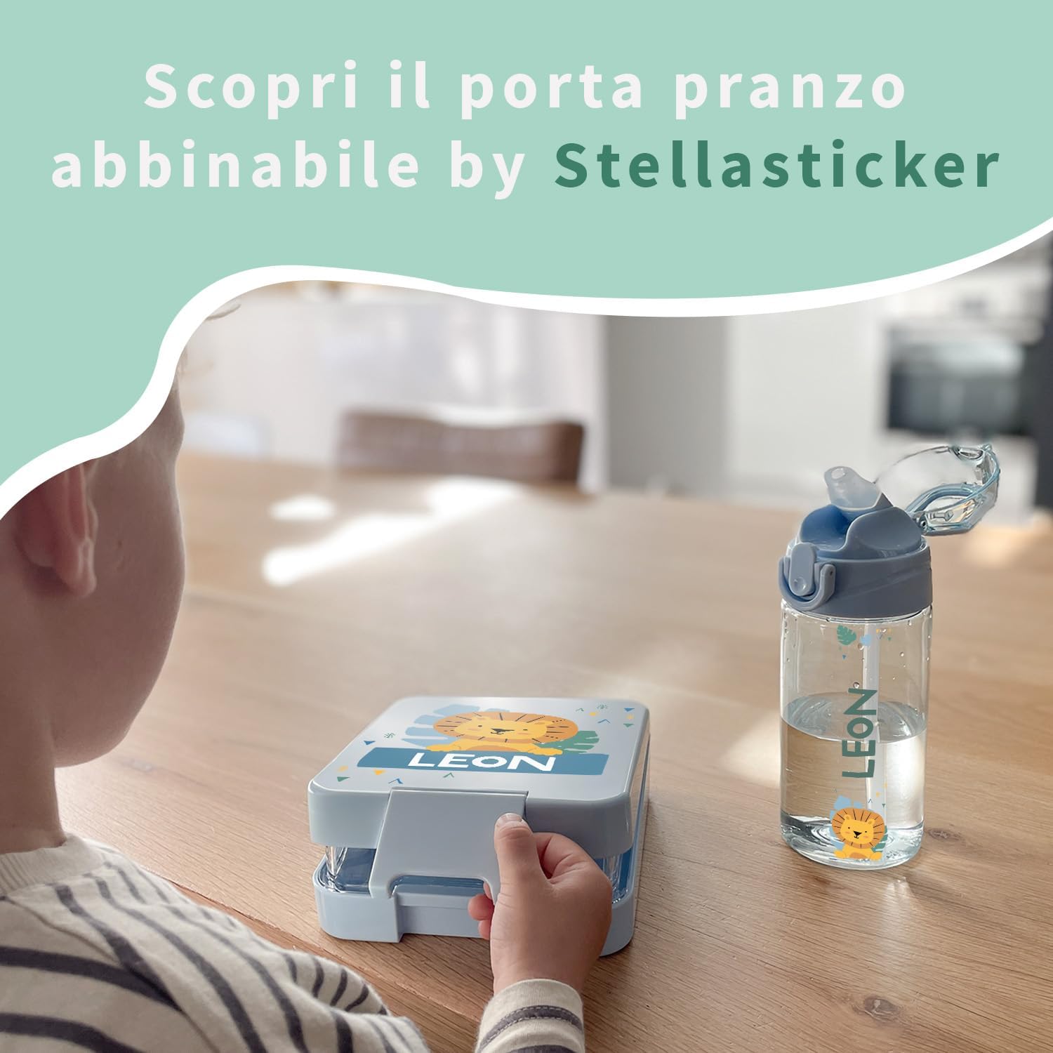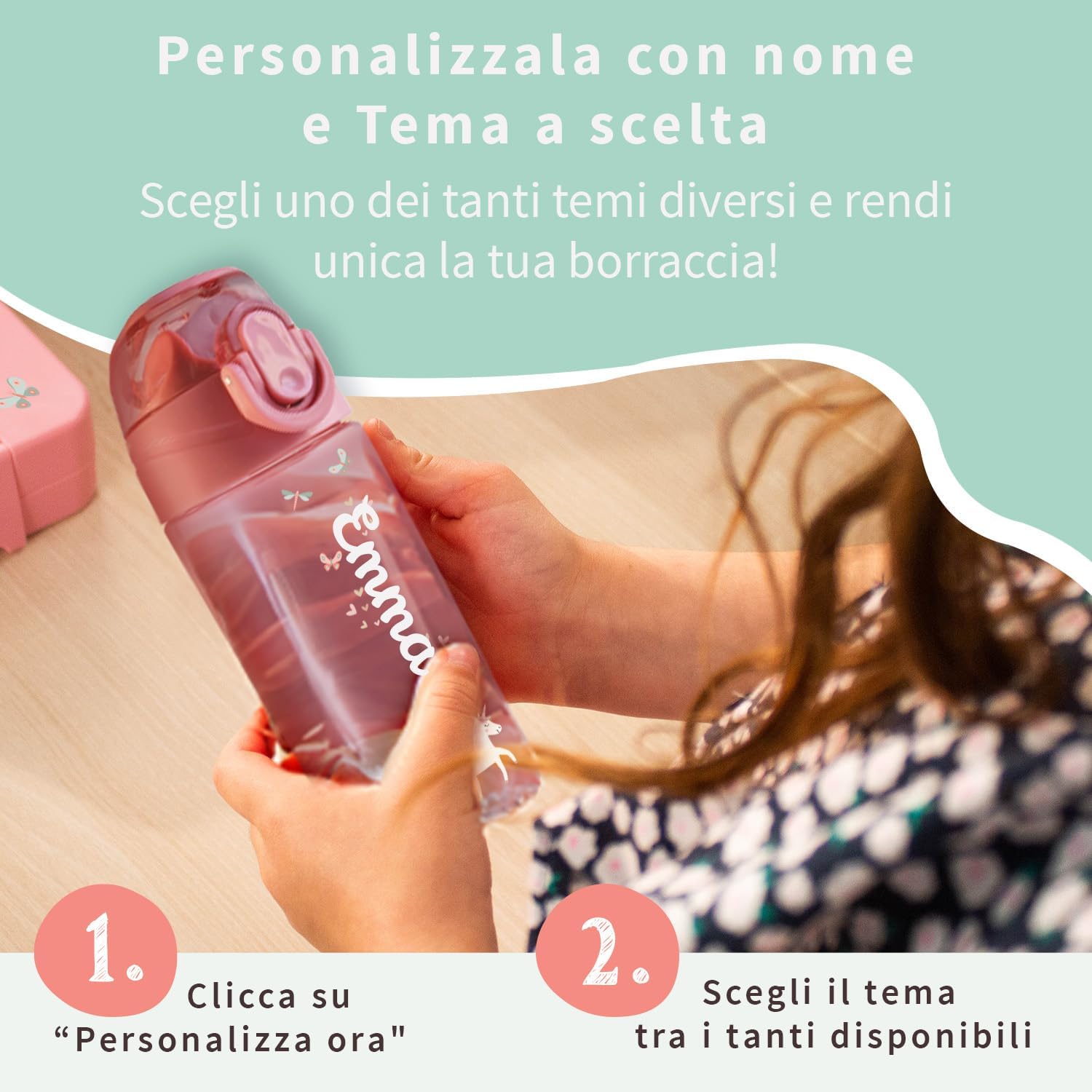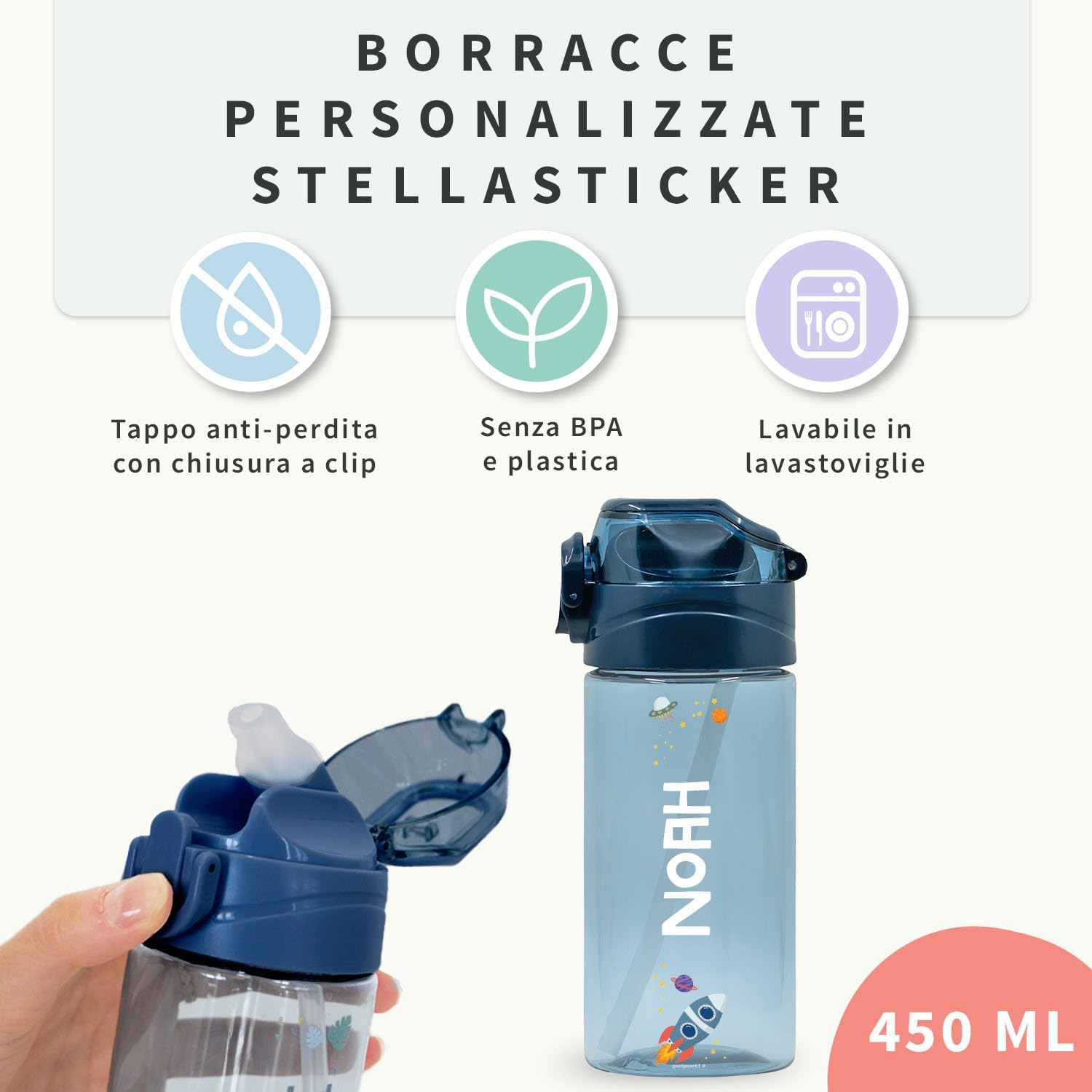 BORRACCIA PERSONALIZZATA PER BAMBINI – La nostra borraccia con nome e cannuccia è perfetta per scuola, asilo e attività sportive. Grazie alla personalizzazione con nome e simbolo, ogni bottiglia è unica e facile da riconoscere. DESIGN UNICO E COLORATO – Ogni borraccia bambini personalizzata è a prova di perdite e disponibile in diversi colori vivaci. Un regalo pratico e allegro che fa sorridere ogni bambino! ANTI-PERDITA E FACILE DA USARE – Dotata di coperchio con chiusura a clip e cannuccia integrata, la borraccia è completamente a prova di perdite. Si apre e si usa con una sola mano, perfetta per i più piccoli. FACILE DA PULIRE – La cannuccia in silicone rimane ben salda alla parte superiore, evitando che si perda o si sporca. Dopo l’uso, basta risciacquare con acqua calda o mettere in lavastoviglie per una pulizia pratica e veloce. Se si danneggia, nessun problema, ci sono i pezzi di ricambio. MATERIALI SICURI E CERTIFICATI – Realizzata in Tritan di alta qualità, la bottiglia è 100% priva di BPA, PVC e ftalati. Conforme agli standard FDA, LFGB e EU1935/2004. Capacità: 450 ml – dimensioni: 7 × 18,5 cm.