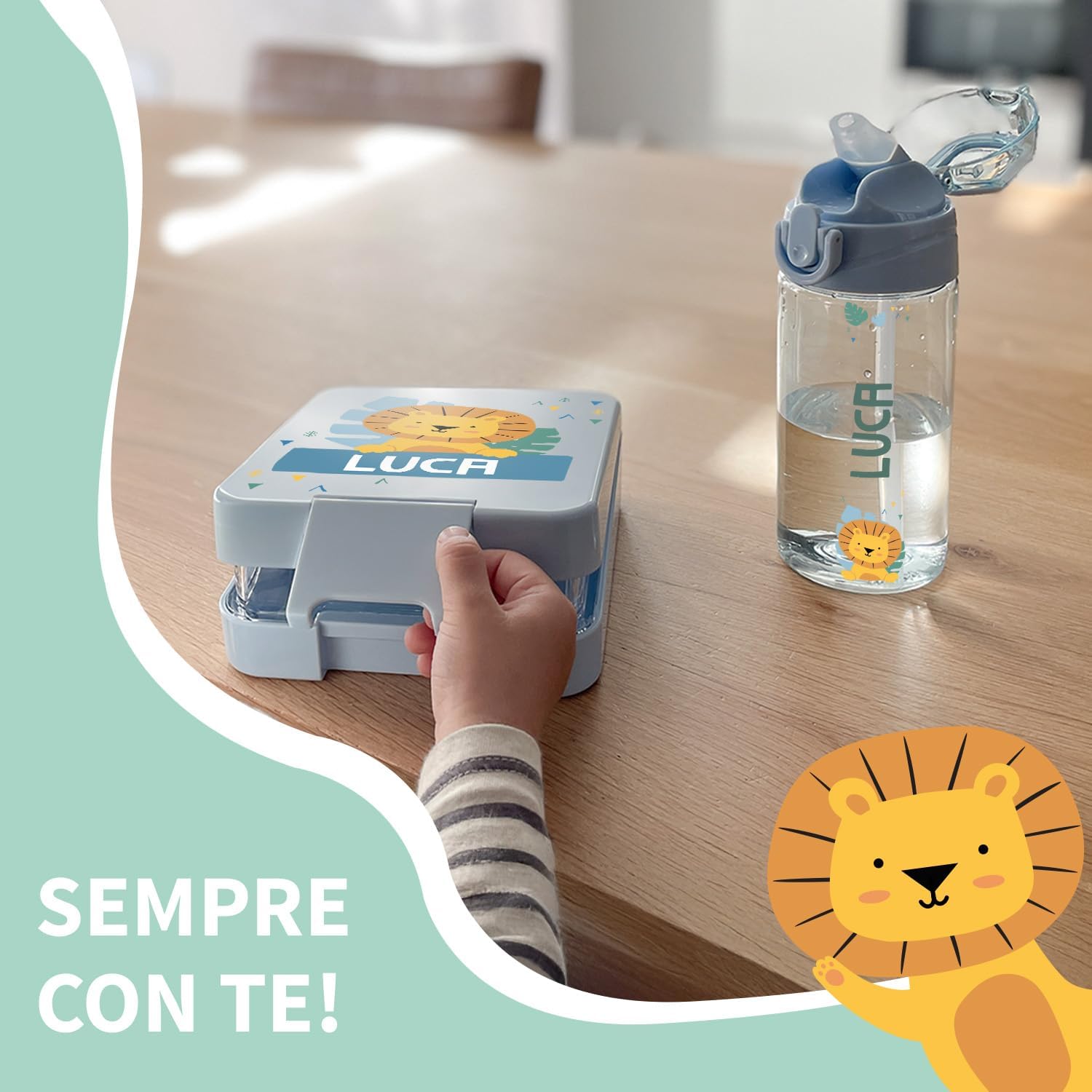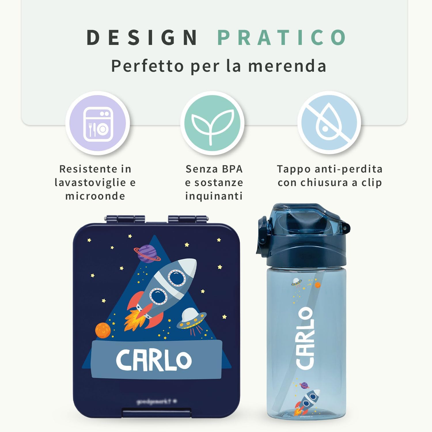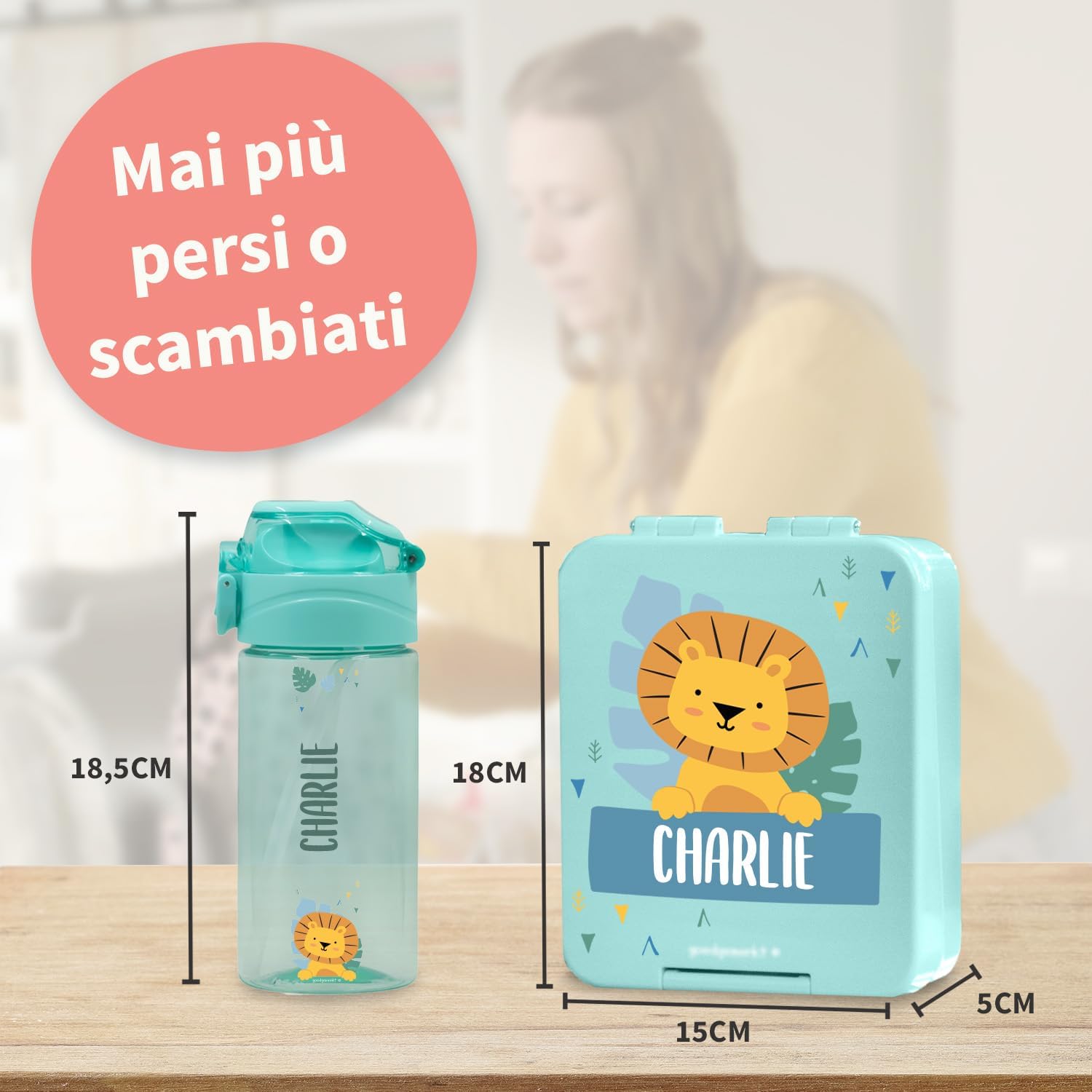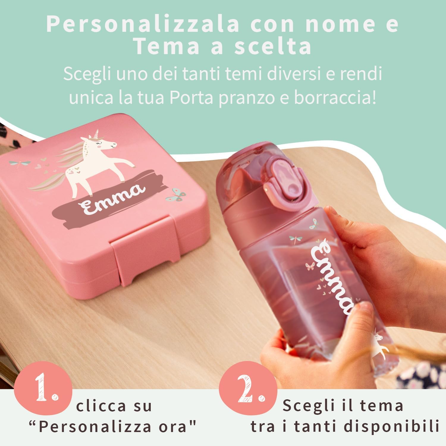 Borraccia personalizzata - La nostra pratica borraccia con cannuccia per bambini è perfetta per la scuola, l'asilo e lo sport. Grazie al design personalizzato, la nostra borraccia per bambini rimane inconfondibile ed evita la confusione nella vita quotidiana. Pratico portapranzo - Grazie ai pratici scomparti rimovibili, il portapranzo personalizzato con nome e motivo mantiene gli spuntini e i cibi sempre freschi e separati. Che si tratti di scuola, gite o asilo nido, il portapranzo è il compagno ideale per i viaggi! Personalizzabile - Personalizzate la borraccia e il cestino per il pranzo dei vostri bambini con un nome, diversi motivi e colori. È inoltre possibile aggiungere testi come cognomi o numeri di telefono per evitare fastidiose confusioni. Sicuro al 100% e privo di sostanze nocive - Il nostro biberon per bambini con cannuccia e il porta merenda per bambini con nome e motivo sono realizzati in materiale privo di BPA e completamente privo di ftalati o melamina. Senza sostanze nocive, è sicuro per i bambini. Informazioni sul prodotto - Il portapranzo personalizzato per bambini e la borraccia per bambini sono adatti al microonde e alla lavastoviglie fino a 50°. Si consiglia di lavarli nel cestello superiore della lavastoviglie.