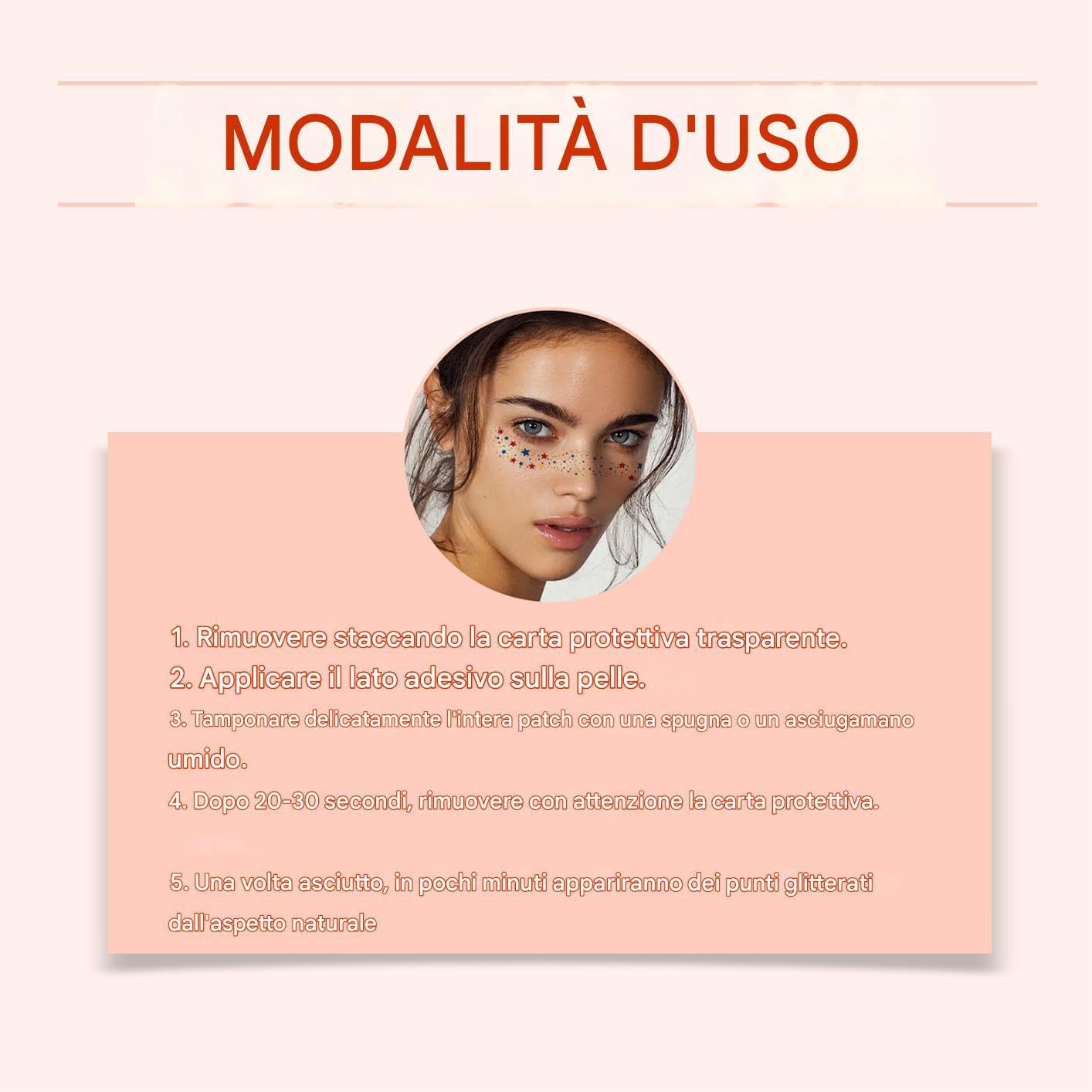 Glitter Impermeabile: Esprimiti con adesivi decorativi scintillanti e sostenibili che offrono delicate transizioni di luce e resistenza all'acqua, garantendo design accattivanti con effetti brillanti che persistono per ore Protezione Cutanea: Formula non irritante e adesivo morbido sono concepiti per adattarsi a tutti i tipi di pelle senza causare rossori o fastidi durante l'applicazione Densità Regolabile: Realizza design pronti per il ruolo con cerotti trucco viso adatti ad outfit casual e formali, caratterizzati da posizionamento flessibile e possibilità stilistiche diversificate per migliorare l'aspetto con facilità Upgrade Istantaneo Dettagli: I cerotti a stelle aggiungono brillantezza immediata al tuo trucco, essenziali per eventi a tema migliorando la versatilità per diversi usi scenici Effetto Beauty Immediato: Pensazione di bellezza rapida per stili di vita moderni. Il design accessibile elimina la necessità di strumenti, mentre l'uso umido semplificato dona trasformazioni eleganti in modo immediato e senza complicazioni.