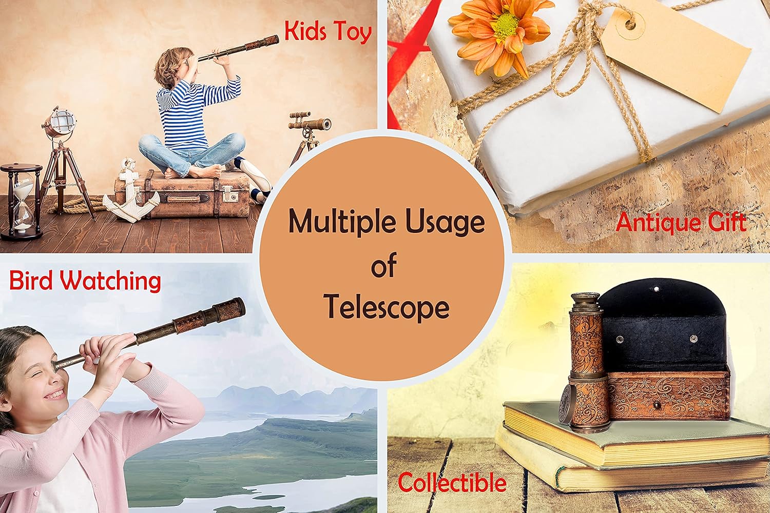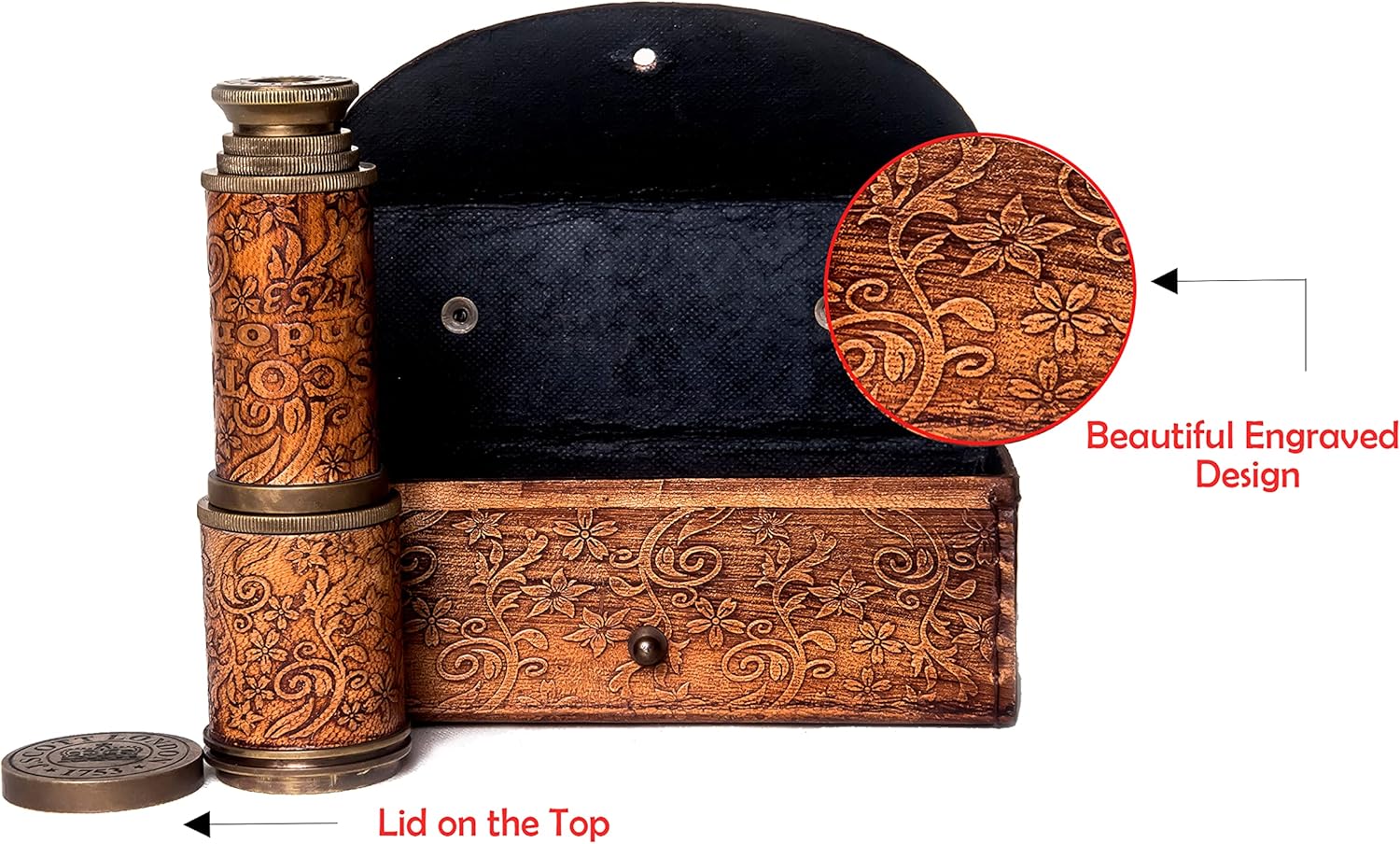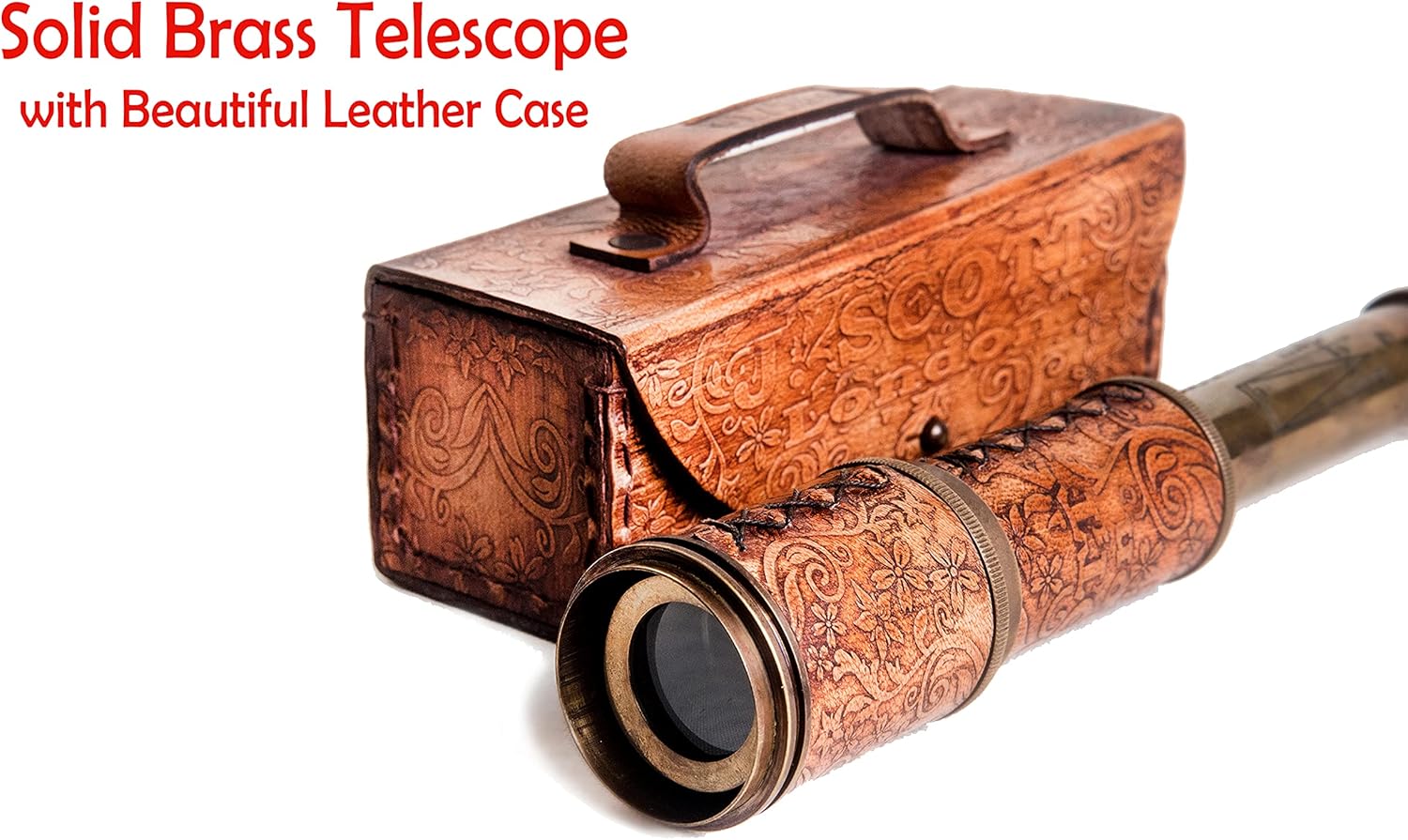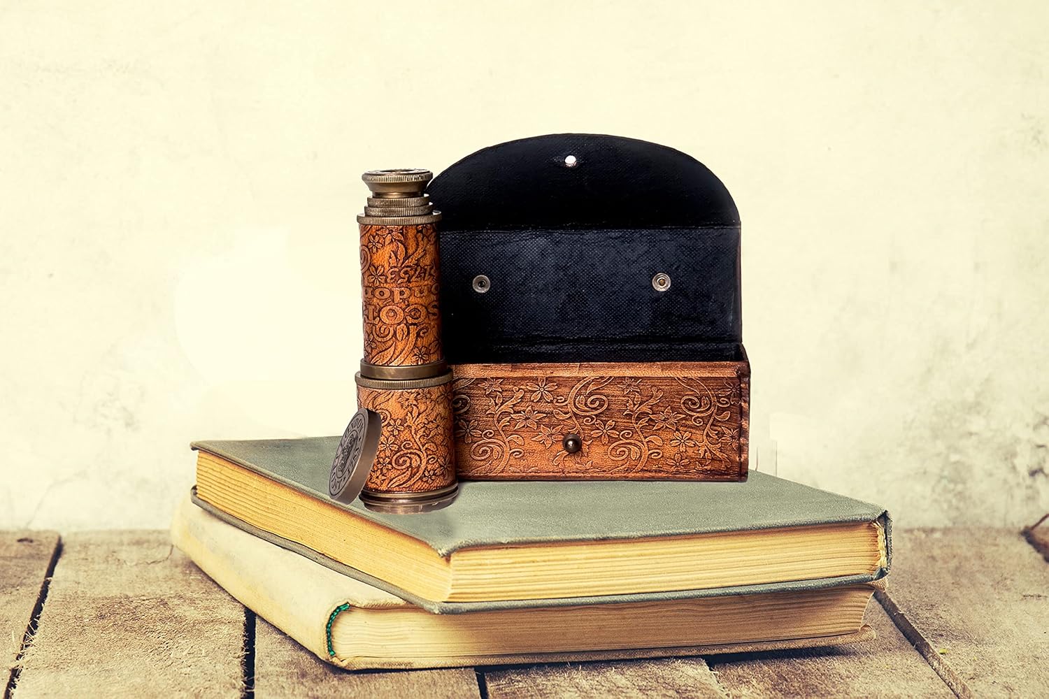 Design unico realizzato in ottone massiccio brillante con pelle completamente intagliata. Si tratta di un bellissimo telescopio completamente realizzato a mano ed è molto utile in viaggio. Il regalo perfetto per viaggiatori, collezionisti nautici e decorazione per la casa. Poiché si tratta di un prodotto fatto a mano, possono verificarsi lievi variazioni di colore e peso, ma la qualità dei prodotti sarà super fine. 100% realizzato a mano da artigiani indiani di Roorkee Instruments Handicraft.