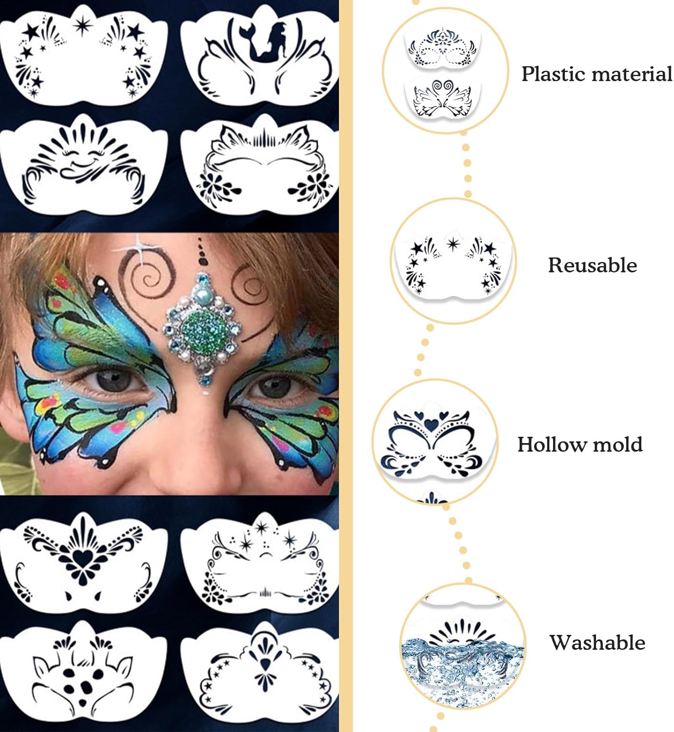 Materiali di Alta Qualità: Stencil è realizzato in plastica PET flessibile. Questo materiale è pieghevole ed elastico, consentendogli di adattarsi ai contorni del viso senza risultare rigido. I bordi di truccabimbi sono finemente lucidati per un tocco delicato, adatti al contatto diretto con la pelle e sicuri sia per adulti che per bambini. Questo elimina il rischio di graffi e allergie che possono derivare da materiali di qualità inferiore. Vari Motivi: Questo set di stencil bambini include 16 modelli da 20×12 cm, con una varietà di motivi, tra cui stampe animalier (farfalle, cervi, unicorni, volpi e sirene), forme (petali, stelle, cuori, lacrime e altro) e raffinati bordi decorativi, perfetti per feste, festival ed eventi a tema. Facile da Usare: Fase 1: Applicare stencil per pittura al viso. Fase 2: Utilizzare un piumino da cipria o un pennello da trucco per applicare il colore e picchiettare o spennellare sui ritagli del modello. Fase 3: Staccare con cura stencil truccabimbi per rivelare il tuo splendido design. Dai principianti agli esperti creativi, tutti possono iniziare rapidamente e creare facilmente disegni facciali professionali. Lavabile e Riutilizzabile: Dopo l'uso, è sufficiente immergere e risciacquare con acqua tiepida e sapone per rimuovere facilmente le macchie e ripristinare la pulizia dell'face painting. Non c'è bisogno di preoccuparsi di sprecare un singolo utilizzo; l'uso ripetuto non deformerà il motivo né romperà il modello. L'stencil trucco viso può essere utilizzato per attività creative a lungo termine come Halloween e feste di vario tipo, rendendo ogni esperienza di pittura divertente ed economica. Applicazioni: l'vernice faccia stencil è estremamente utile per Halloween, feste di compleanno, progetti scolastici, feste in maschera, cosplay, carnevali e altro ancora. Inoltre, l'stencil per la pittura del viso può essere utilizzato non solo sui volti, ma anche su carta, legno, finestre, pareti e altri oggetti artigianali. Con un solo tratto, trasforma oggetti ordinari in opere d'arte, aprendo una varietà di possibilità creative.