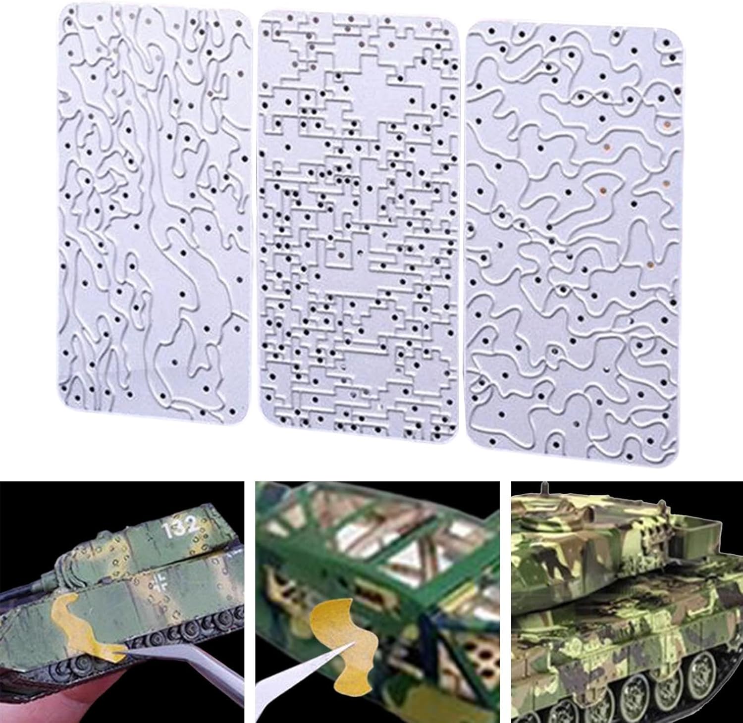 Kit di strumenti per modellismo per hobby: accessori pratici per vernici per modellismo fai da te, ideali per hobbisti e professionisti che cercano precisione nella costruzione di modelli o nell'artigianato Materiale robusto: gli stencil per nastro adesivo sono realizzati in metallo, i tagli di precisione consentono tagli fini per creare complicati motivi di mascheratura Modelli di pittura: stencil riutilizzabili che ti consentono di decorare il tuo modellino di veicolo per hobby in pochi minuti e rendere i tuoi modelli più attraenti Multiuso: ideale per la pittura di modelli. Consente di creare rapidamente forme e disegni personalizzati, garantendo bordi puliti e risultati professionali. Gli stencil con motivi sono adatti anche per lavori fai da te su legno, lino, carta, pavimenti e piastrelle. Il set contiene tre piastre metalliche riutilizzabili (90 x 46 mm ciascuna) e offre flessibilità per vari progetti di modellismo e hobby