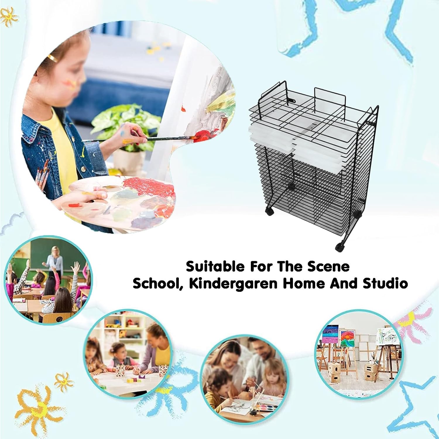 RUOTE MOBILI ----- Ci sono 4 ruote piroettanti sul rack artistico for l'aula, che può essere facilmente spostato su qualsiasi superficie liscia e piana, nel frattempo, è dotato di freni for mantenerlo fermo, che sarà stabile for sostenere i tuoi lavori artistici COSTRUZIONE ROBUSTA ----- Lo stendibiancheria è realizzato in metallo, resistente e di lunga durata RACCOGLITORI for L'ASCIUGATURA ARTISTICA ----- L'asciugatura non è mai stata così facile, gli stendibiancheria offrono molto spazio for posizionare in modo semplice e sicuro nuove creazioni di artisti, come stampe a getto d'inchiostro, tele, acquerelli o dipinti acrilici, poster e altre opere d'arte, for tenerli lontani essere macchiato o spiegazzato POSTI APPLICABILI ----- Molto adatto for asili nido, aule scolastiche, centri di prima educazione, case o studi e altri luoghi in cui è necessaria la pittura a olio secca FACILE DA ASSEMBLARE ----- Non sono necessari strumenti aggiuntivi for assemblare il supporto artistico, basta collegare insieme i telai superiore e inferiore, installare le rotelle, una persona può assemblare facilmente