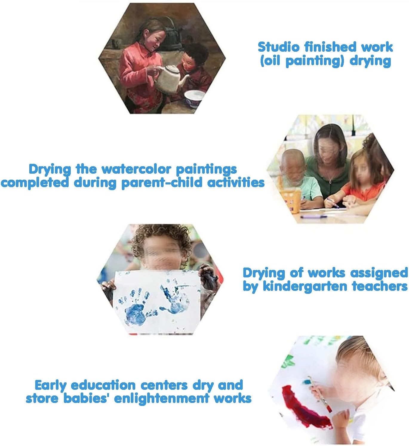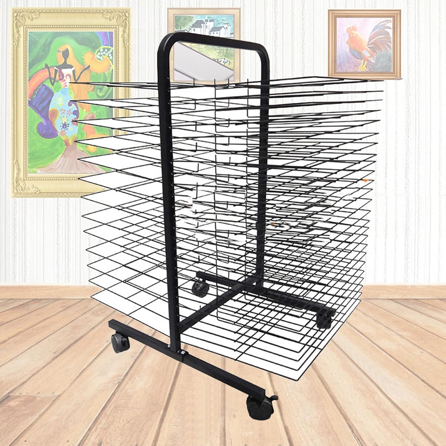 RUOTE MOBILI ----- Ci sono 4 ruote piroettanti sul rack artistico for l'aula, che può essere facilmente spostato su qualsiasi superficie liscia e piana, nel frattempo, è dotato di freni for mantenerlo fermo, che sarà stabile for sostenere i tuoi lavori artistici COSTRUZIONE ROBUSTA ----- Lo stendibiancheria è realizzato in metallo, durevole e di lunga durata, con una distanza di 2/4,5 cm tra i rack for garantire che l'arte rimanga pulita RACCOGLITORI for L'ASCIUGATURA ARTISTICA ----- L'asciugatura non è mai stata così semplice, gli stendibiancheria offrono molto spazio for posizionare in modo semplice e sicuro nuove creazioni di artisti, come stampe a getto d'inchiostro, tele, acquerelli o dipinti acrilici, poster e altre opere d'arte, for tenerli lontani essere macchiato o spiegazzato POSTI APPLICABILI ----- Molto adatto for asili nido, aule scolastiche, centri di prima educazione, case o studi e altri luoghi in cui è necessaria la pittura a olio secca FACILE DA ASSEMBLARE ----- Non sono necessari strumenti aggiuntivi for assemblare il supporto artistico, basta collegare insieme i telai superiore e inferiore, installare le rotelle, una persona può assemblare facilmente