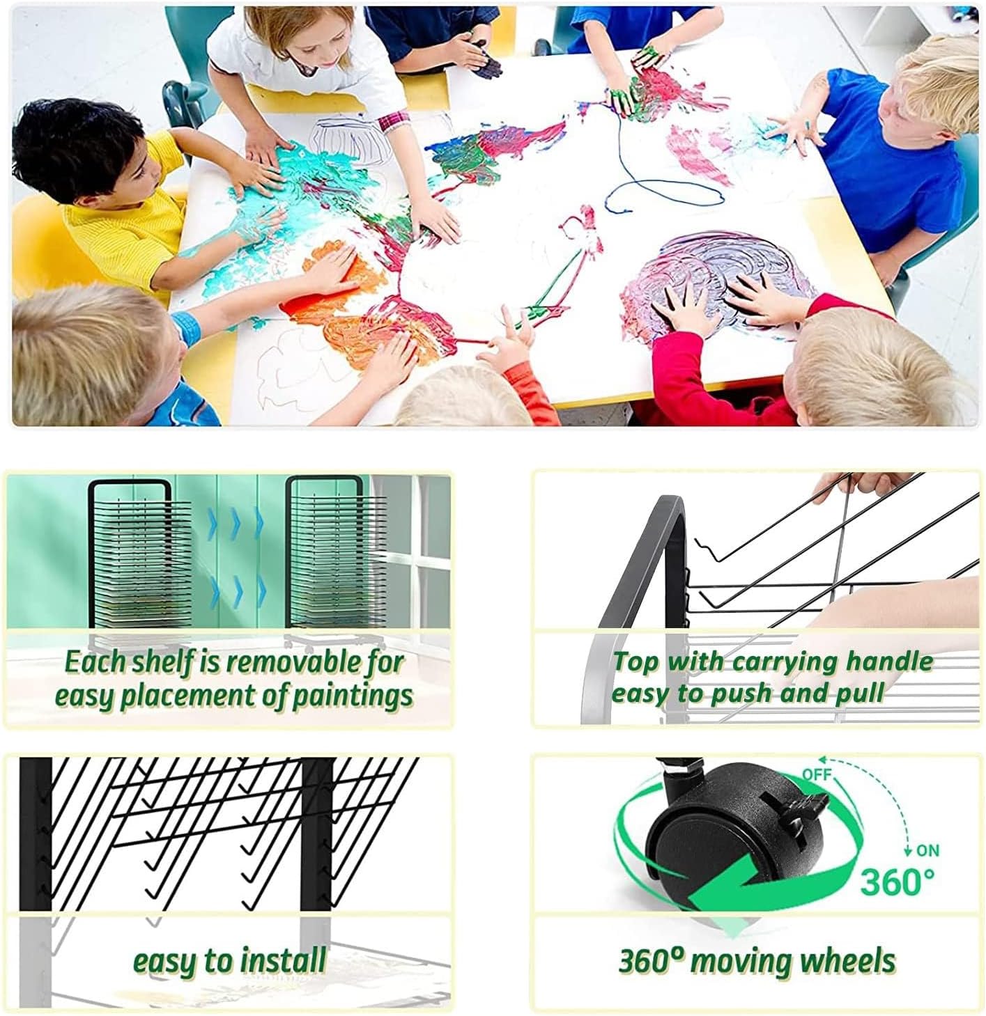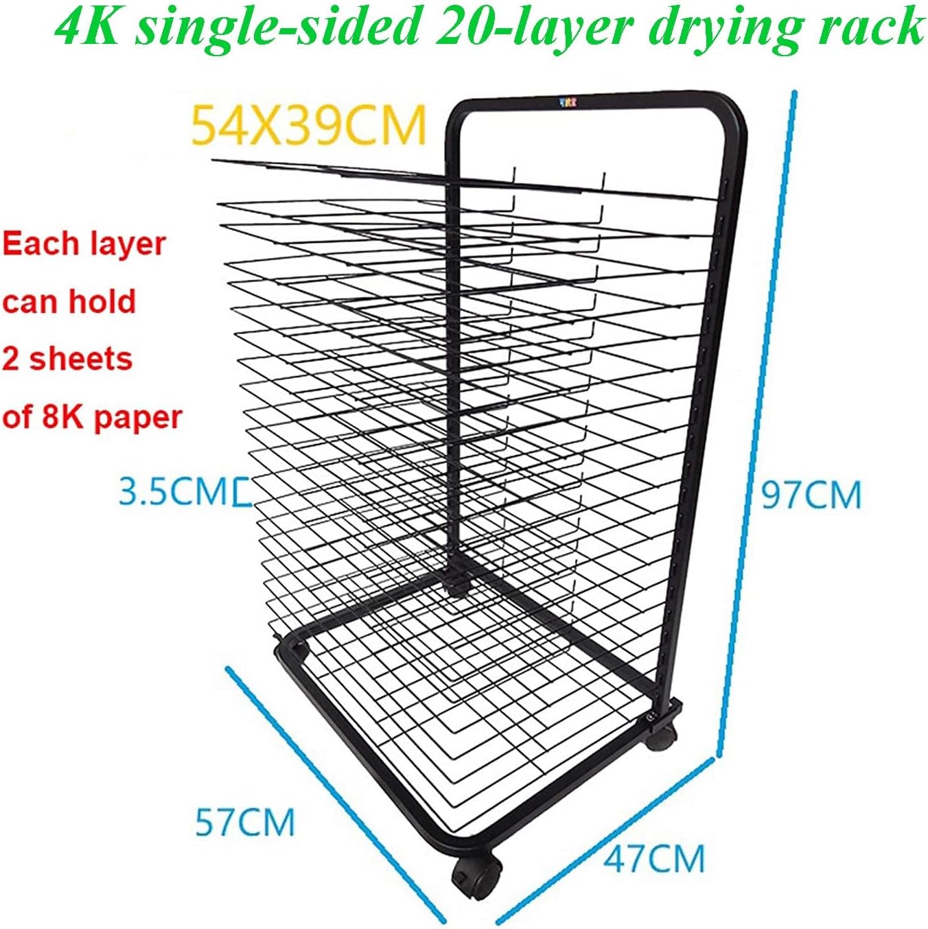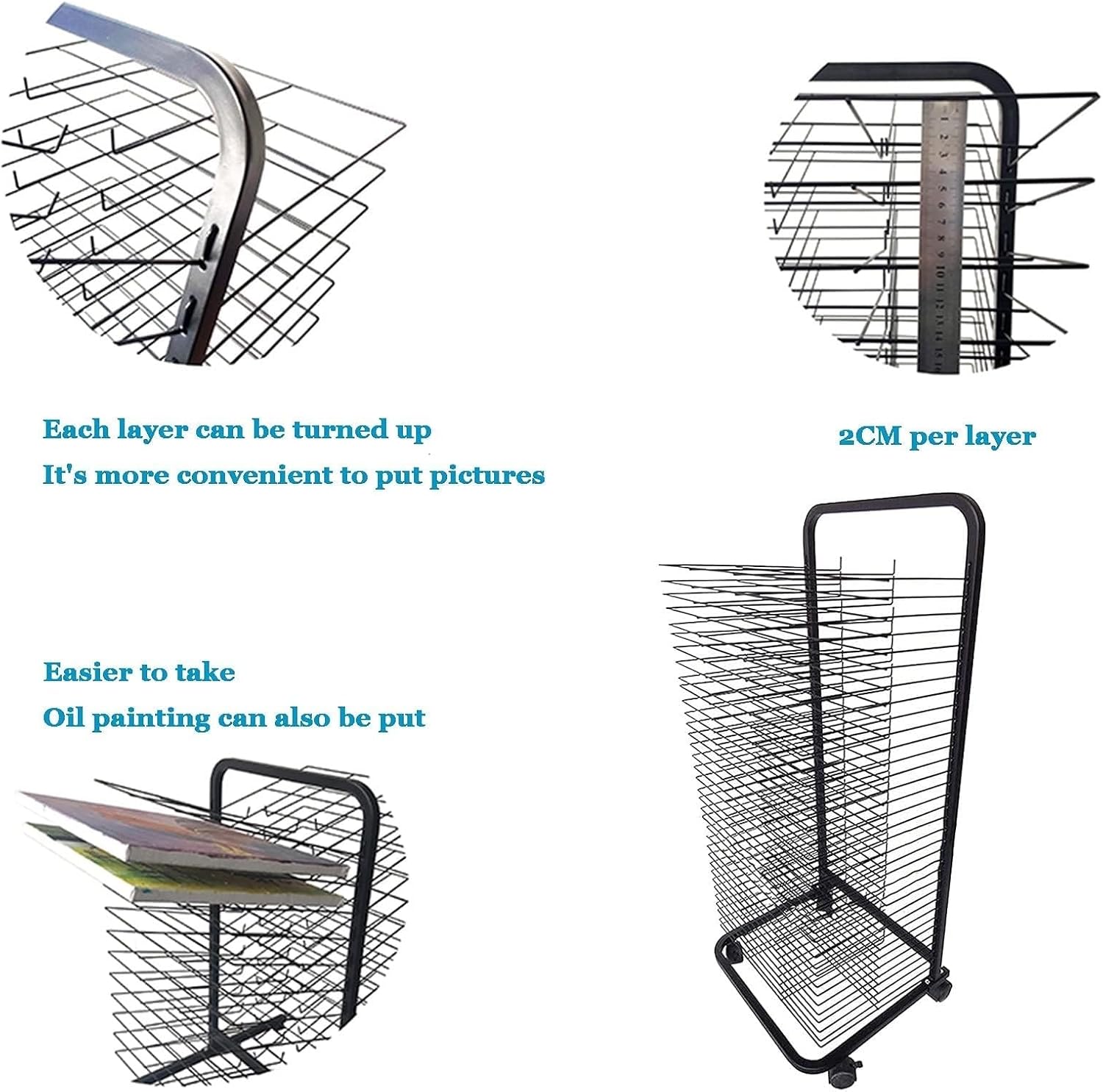 Materiale robusto: questo stendino artistico for aule presenta una robusta struttura in metallo saldato, la struttura in acciaio può resistere a un uso intenso, con una capacità di carico massima di 12 libbre, il nostro stendino artistico in metallo può aiutarti a conservare i tuoi dipinti, schizzi e altre opere d'arte progetti puliti e organizzati! Spaziatura ragionevole: il rack for quadri ha 20 strati, con una spaziatura di 3,5 cm tra gli strati e una maggiore spaziatura sugli scaffali. Perfetto for asili nido e corsi d'arte, aule d'arte o studi. Asciuga facilmente le tue opere d'arte: dì addio ai capolavori sporchi e dai il benvenuto alle opere d'arte pulite e asciutte. Il nostro stendino in metallo può aiutarti a mantenere i tuoi dipinti, schizzi e altri progetti artistici ordinati e organizzati! Mobilità combinata con stabilità: il nostro rack è progettato con cura con 4 rotelle, incluse due ruote bloccabili. Sposta facilmente la tua stazione di asciugatura garantendo al tempo stesso una stabilità solida durante l'uso. Ampia applicazione: lo stendino artistico for aule è perfetto for piccoli fogli di carta, poster di dimensioni standard e carta for acquerello di dimensioni imperiali, con spazio di asciugatura sufficiente for ospitare un'intera classe di dipinti o una serie di stampe.