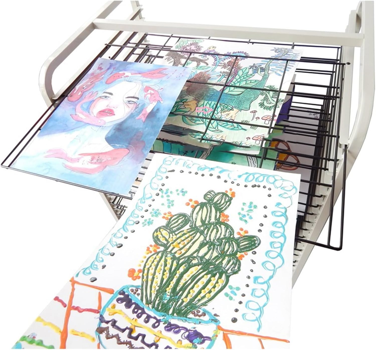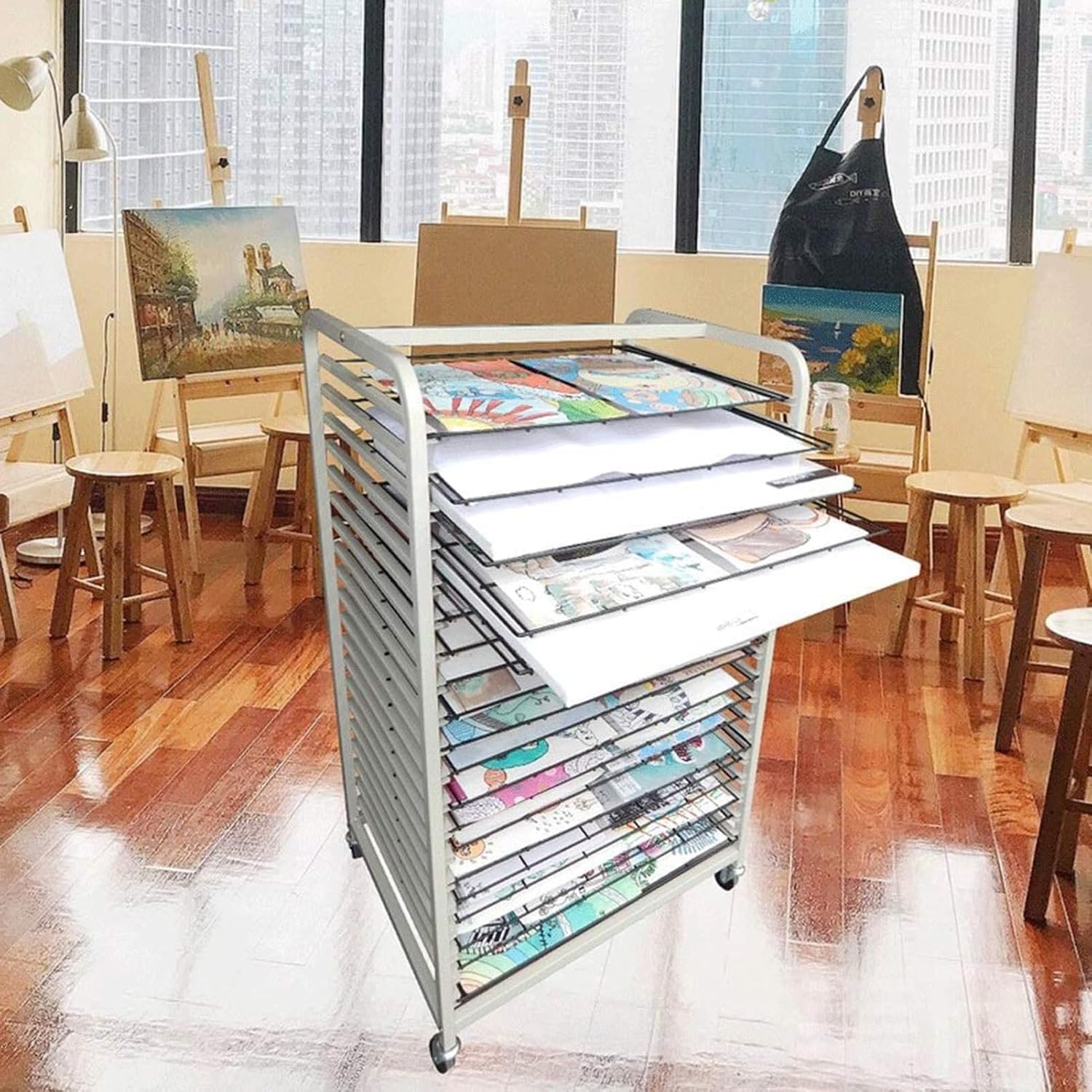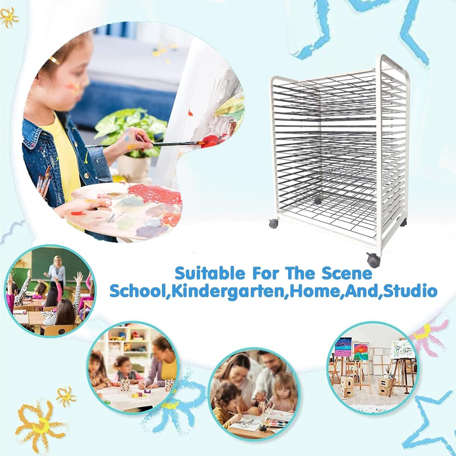 RUOTE MOBILI ----- Ci sono 4 ruote piroettanti sul rack artistico for l'aula, che può essere facilmente spostato su qualsiasi superficie liscia e piana, nel frattempo, è dotato di freni for mantenerlo fermo, che sarà stabile for sostenere i tuoi lavori artistici COSTRUZIONE ROBUSTA ----- Lo stendibiancheria è realizzato in metallo, durevole e di lunga durata, con una distanza di 3 cm tra i rack for garantire che l'arte rimanga pulita RACCOGLITORI for L'ASCIUGATURA ARTISTICA ----- L'asciugatura non è mai stata così facile, gli stendibiancheria offrono molto spazio for posizionare in modo semplice e sicuro nuove creazioni di artisti, come stampe a getto d'inchiostro, tele, acquerelli o dipinti acrilici, poster e altre opere d'arte, for tenerli lontani essere macchiato o spiegazzato POSTI APPLICABILI ----- Molto adatto for asili nido, aule scolastiche, centri di prima educazione, case o studi e altri luoghi in cui è necessaria la pittura a olio secca FACILE DA ASSEMBLARE ----- Non sono necessari strumenti aggiuntivi for assemblare il supporto artistico, basta collegare insieme i telai superiore e inferiore, installare le rotelle, una persona può assemblare facilmente