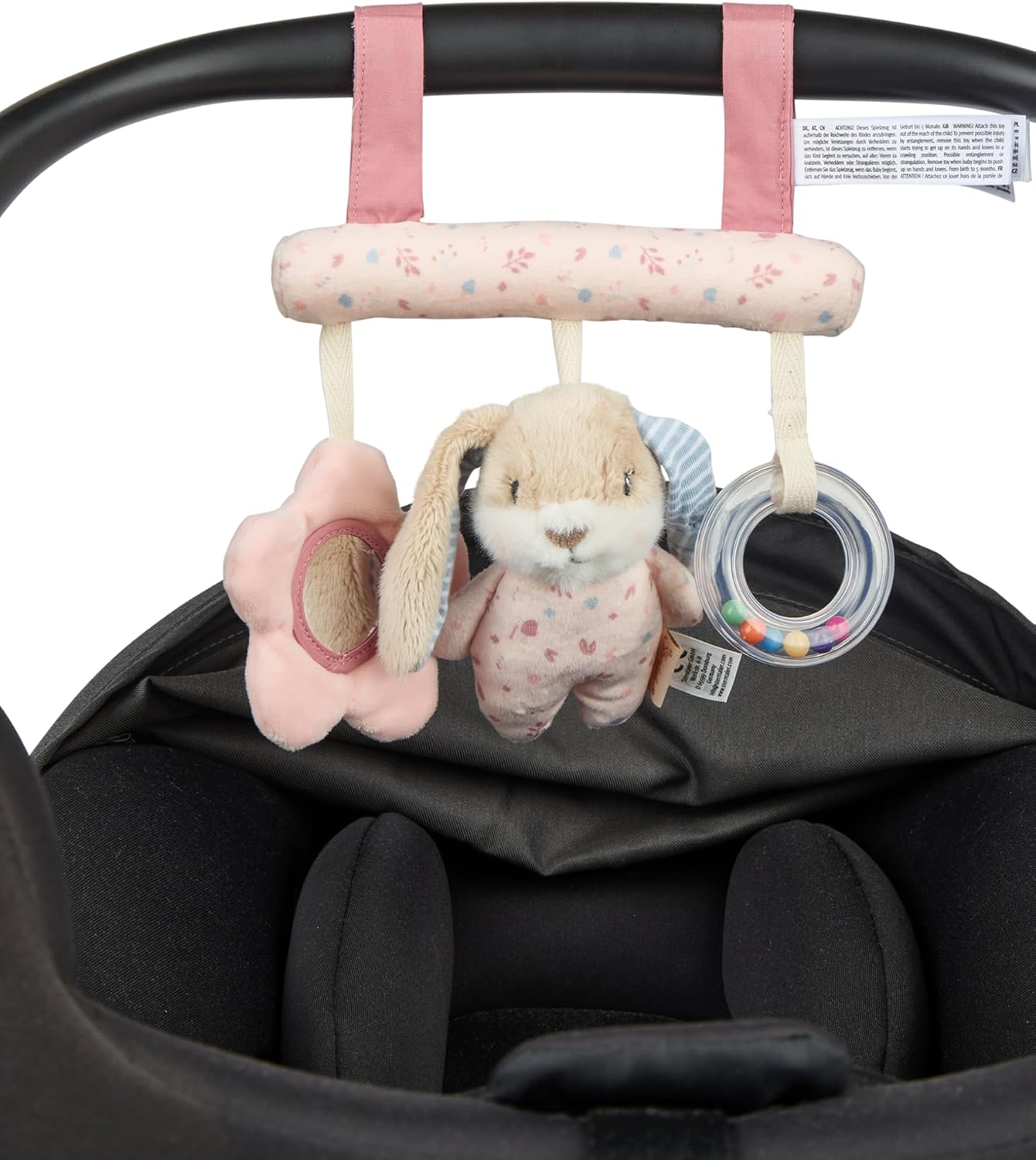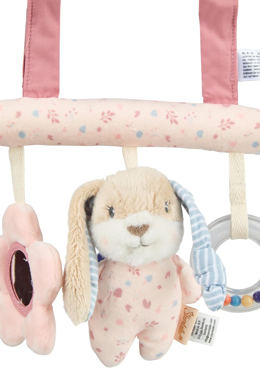 Giocattolo da appendere coniglietto Hanni /// con per attaccarlo al lettino, al passeggino o simili. Sonaglio, pellicola a specchio e anello sonaglio