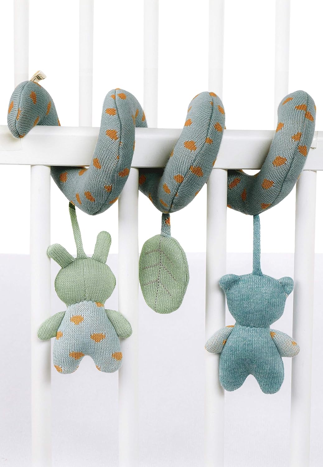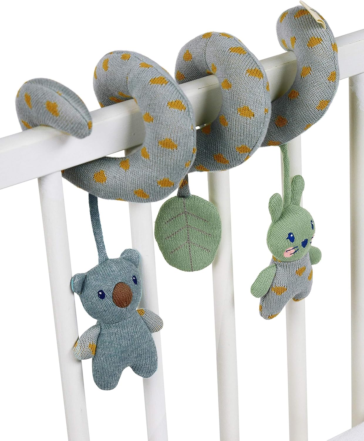 Il divertimento è dato per certo con questo gioco a spirale lavorato a maglia con il coniglietto Kinni ed il koala Kalla in cotone, in verde e blu Grazie alla pratica forma a spirale, il giocattolo può essere utilizzato in vari modi Posizionabile in diversi luoghi: culla, box, passeggino o seggiolino auto per bambini
