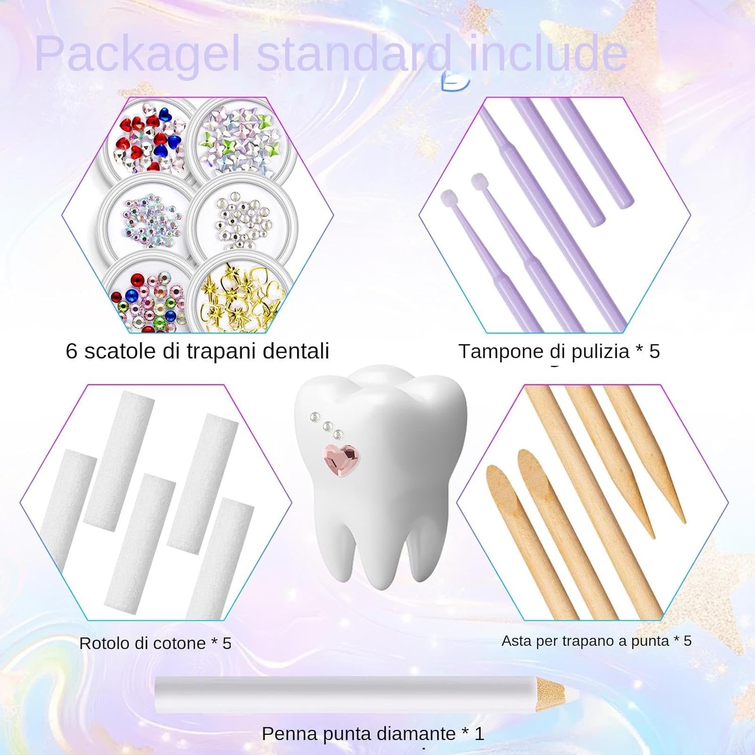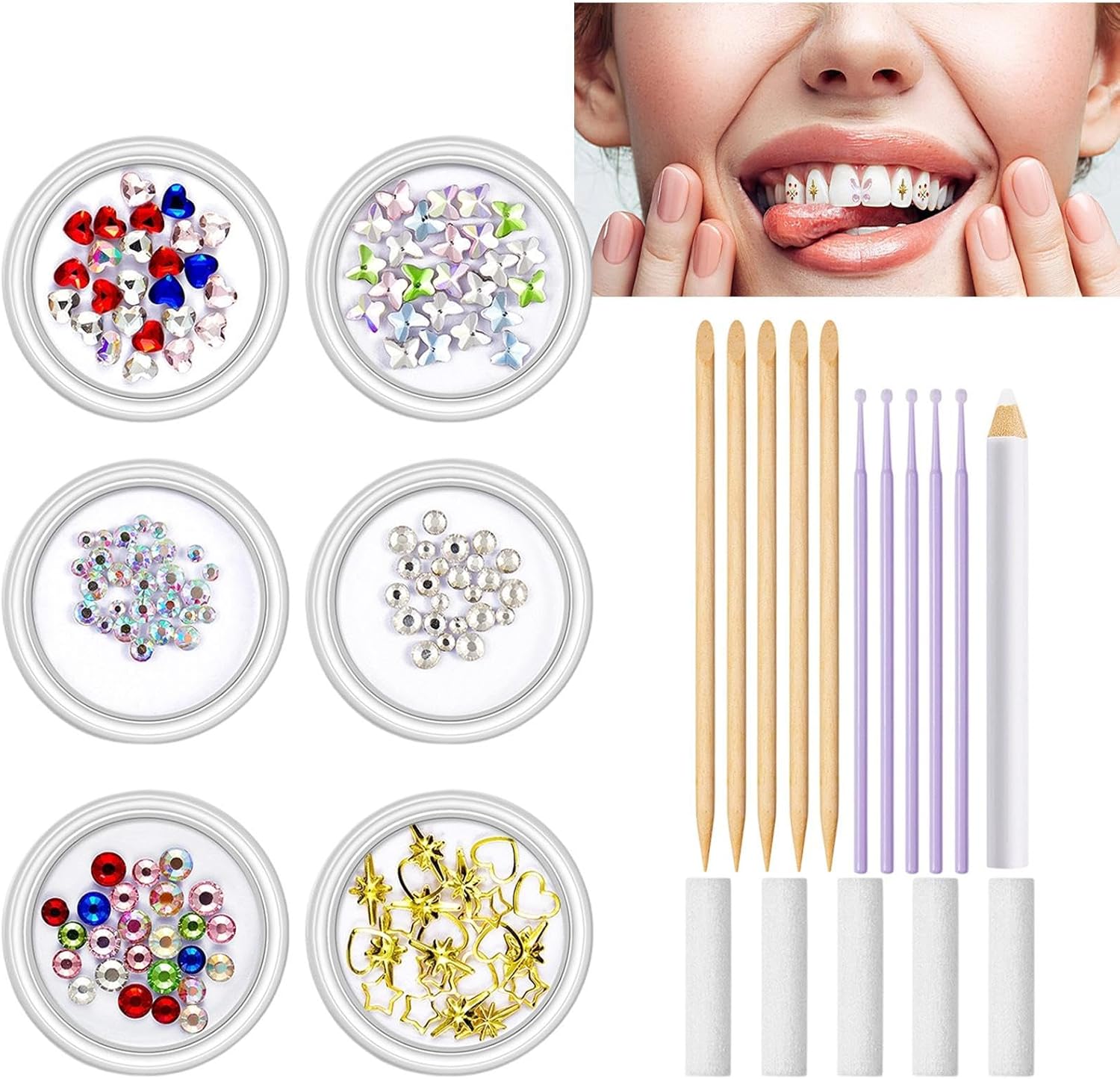 Processo Semplice: Applicazione semplificata delle decorazioni dentali grazie al kit definitivo. Facilità d'uso garantita con risparmio di e denaro. Comodità d'uso: Ottieni denti scintillanti in modo istantaneo applicando le gemme dentali senza sforzo. Progettate per un uso rapido e senza competenze, garantiscono un'esperienza anche ai nuovi utenti che cercano un tocco di stile. Resistente: Realizzati in , questi gioielli dentali garantiscono comfort quotidiano con sicura, resistenti all'usura e facili da pulire per utilizzi ripetuti mantenendo brillantezza Adatti a Ogni Momento: 6 stili diversi di cristalli dentali che aggiungono fascino, perfetti per look quotidiani o occasioni speciali immortalate nelle foto Aspetto speciale:Raggiungi un look eccezionale con design senza adatto a vari contesti; include strumenti per posizionamento preciso e comfort continuo nell'uso quotidiano o festivo