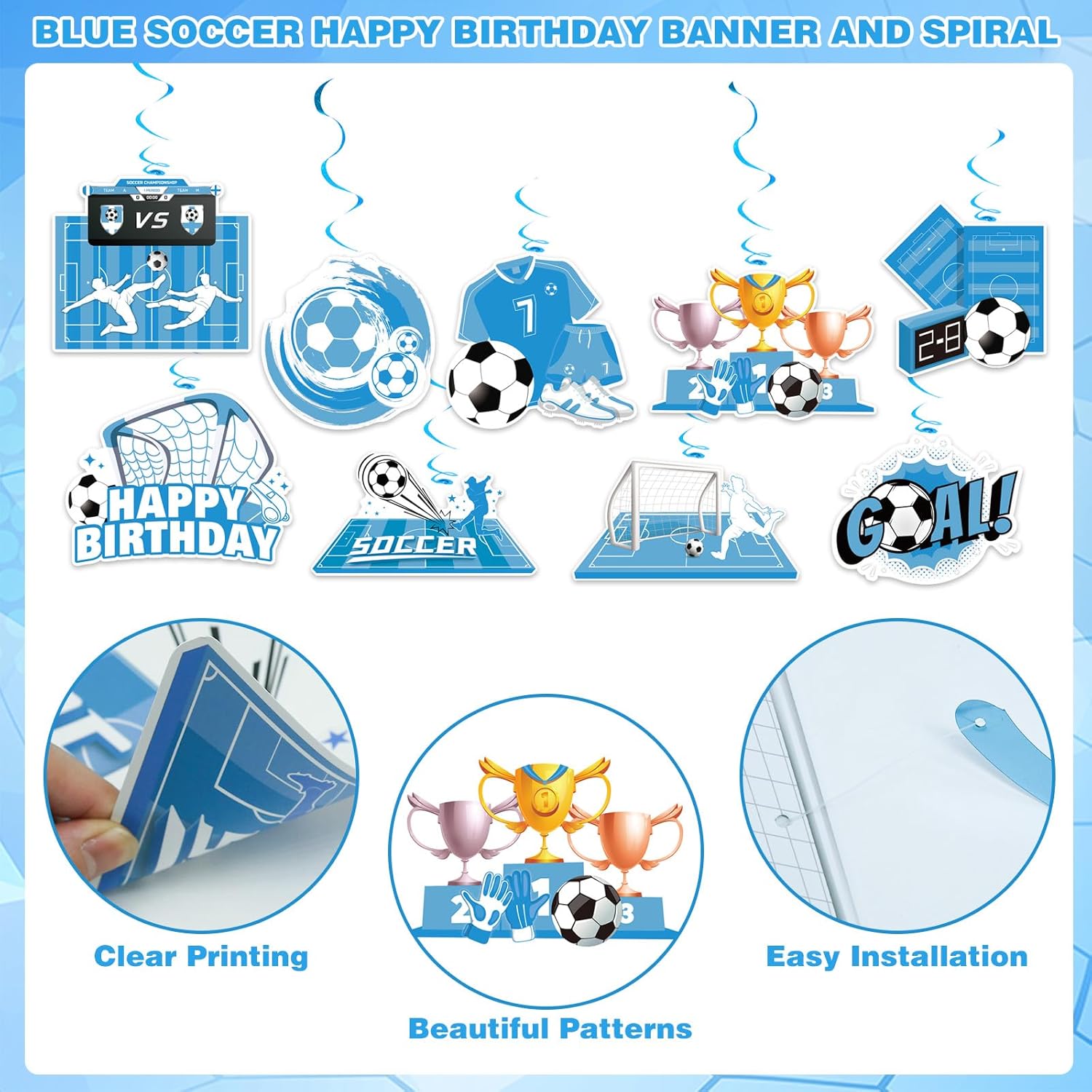 【Materiale di alta qualità】I nostri prodotti per decorazioni per feste di compleanno a tema calcio sono realizzati in cartoncino di alta qualità e realizzati nella nostra fabbrica utilizzando tecnologie moderne. Questo striscione e spirale di buon compleanno a tema calcio blu è ben fatto e può essere riutilizzato più volte, con una lunga durata e comodo da riporre. Il nostro striscione e spirale di buon compleanno a tema calcio blu è molto buono, anche se utilizzato all'aperto, le. 【Caratteristiche】I nostri prodotti decorativi sono progettati da designer professionisti con un'estetica artistica estremamente elevata. Il modello di aspetto utilizza il classico elemento sportivo del calcio e il colore è blu brillante. Lo stile attentamente progettato è sia vivace che carino e può fungere da splendido paesaggio nel luogo dell'evento. Puoi anche scegliere di assemblare decorazioni per feste di calcio con la tua famiglia per aumentare le attività genitore-figlio e sublimare. 【Facile da usare】Questo set di prodotti decorativi è semplice e facile da usare e facile da montare. È necessaria una sola persona per installarlo, il che consente di risparmiare molto tempo e manodopera. I nostri prodotti per decorazioni per feste a tema calcio possono essere facilmente uniti insieme e poi decorati nel posto che ti serve. Lo striscione e la spirale di buon compleanno con pallone da calcio blu possono essere facilmente appesi in qualsiasi spazio tu voglia aggiungere. 【Ampie applicazioni】Le nostre decorazioni per feste a tema calcio sono ampiamente utilizzate e possono decorare qualsiasi tipo di evento vivace. Questo striscione e spirale di buon compleanno con pallone da calcio blu possono decorare eventi di feste di compleanno per ragazzi e uomini adulti, così come eventi con lo sport come tema. Possono essere appesi a qualsiasi parete o soffitto al chiuso e possono anche fungere da sfondo per la fotografia di eventi, lasciando a te e alla tua famiglia dei bei ricordi. 【Cosa otterrai】Riceverai un set di decorazioni a tema sportivo, tra cui uno striscione e una spirale di buon compleanno con pallone da calcio blu, con quantità e dimensioni sufficienti per soddisfare i requisiti di decorazione del tuo evento e possono facilmente creare una scena vivace e felice per te. Se hai domande durante il processo di acquisto, faccelo sapere e ti risponderemo il prima possibile. La tua soddisfazione è la nostra convinzione.