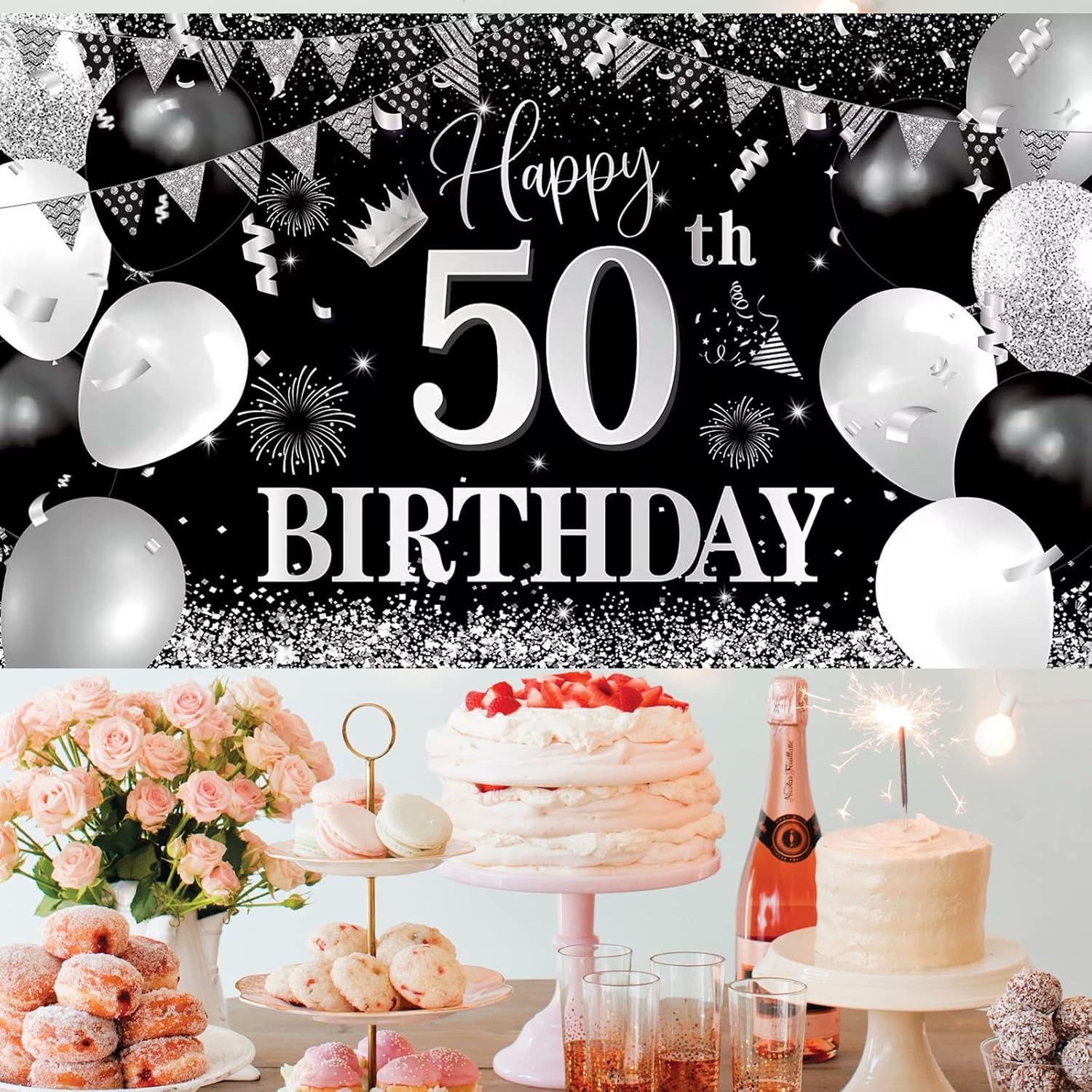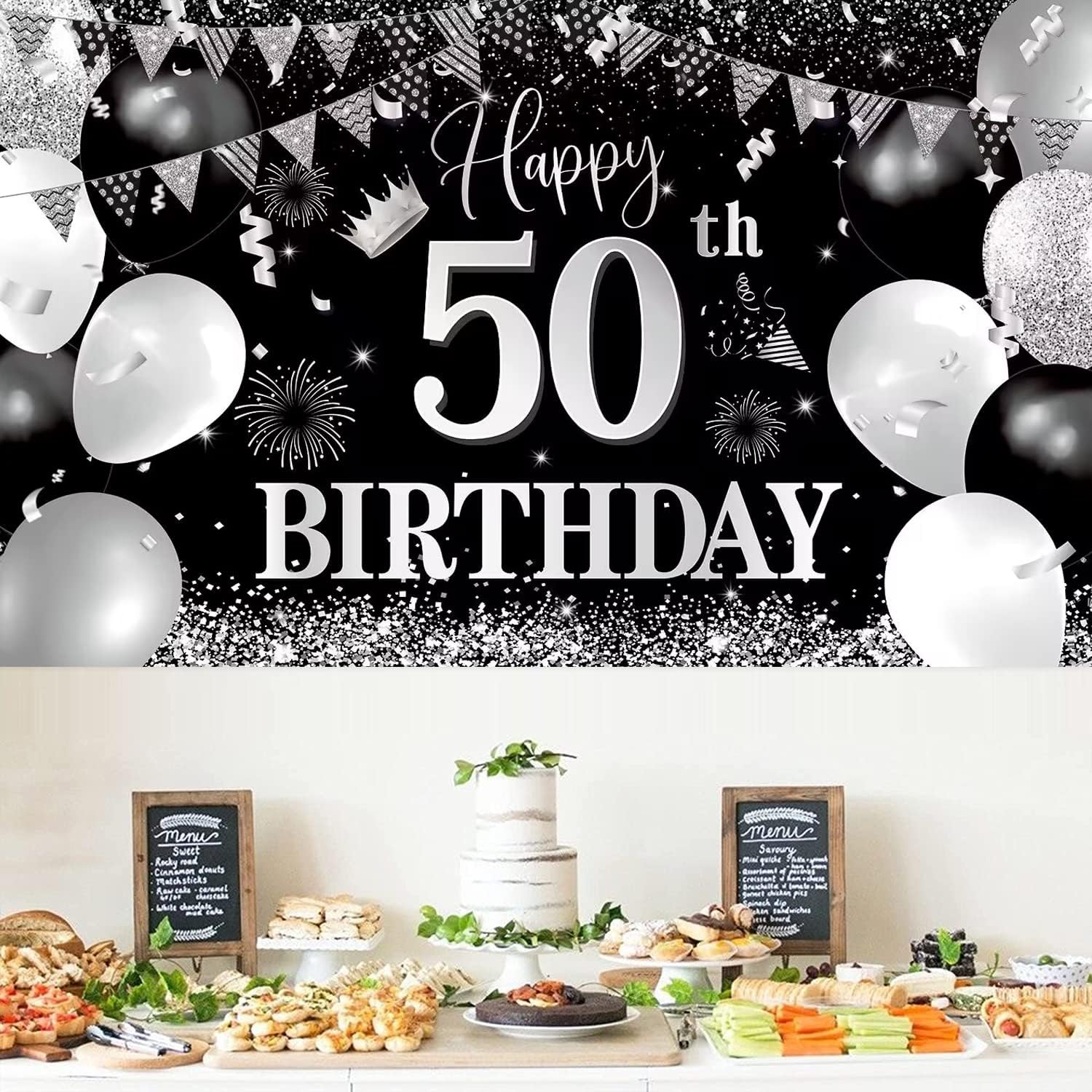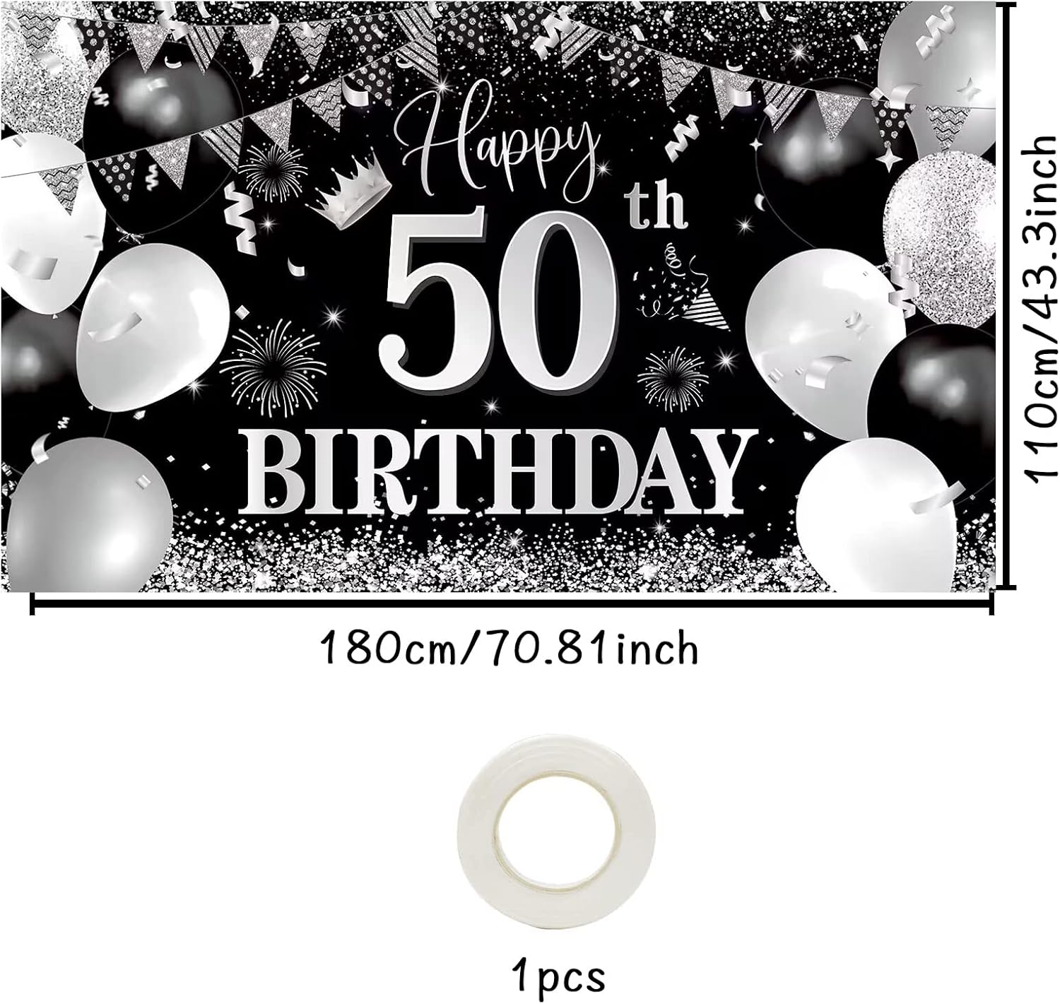 Striscione grande di buon compleanno per il 50esimo compleanno: lo striscione di compleanno nero argento misura 70,8 x 43,3 pollici/ 210 x 110 cm. Abbastanza grande per decorazioni e fotografie per feste di compleanno, aggiungendo un tocco in più alla tua festa di compleanno. Design innovativo: striscione per il cinquantesimo compleanno. Il design è principalmente in nero e argento. Un numero di Happy 50 Birthday di grandi dimensioni, palloncini, striscioni triangolari, fuochi d'artificio e motivi di coriandoli. Materiali: lo striscione per il 50° compleanno nero argento è realizzato in tessuto di poliestere. Lavabile, resistente al colore, riutilizzabile. Foto fantastiche possono essere scattate nell'ambientazione del compleanno. Facile da appendere: lo striscione per il 50° compleanno nero argento ha anelli in ottone sui quattro angoli. Facilmente fissabile tramite 4 fori agli angoli e fissabile a parete, mensole, patio, veranda, soggiorno, recinzioni, cabina fotografica. Decorazione di sfondo per il 50° compleanno: festa a tema di compleanno, decorazione per anniversario, fotografia di compleanno, decorazione blu per feste per uomini e ragazze. Ideale per uso interno ed esterno e fare.
