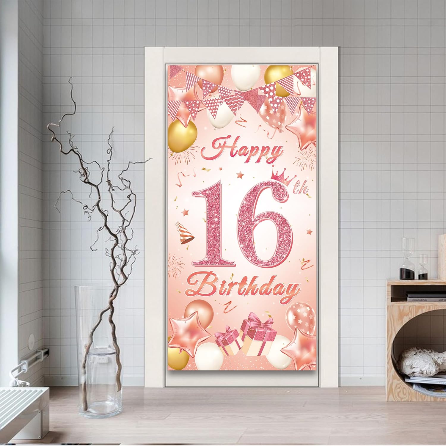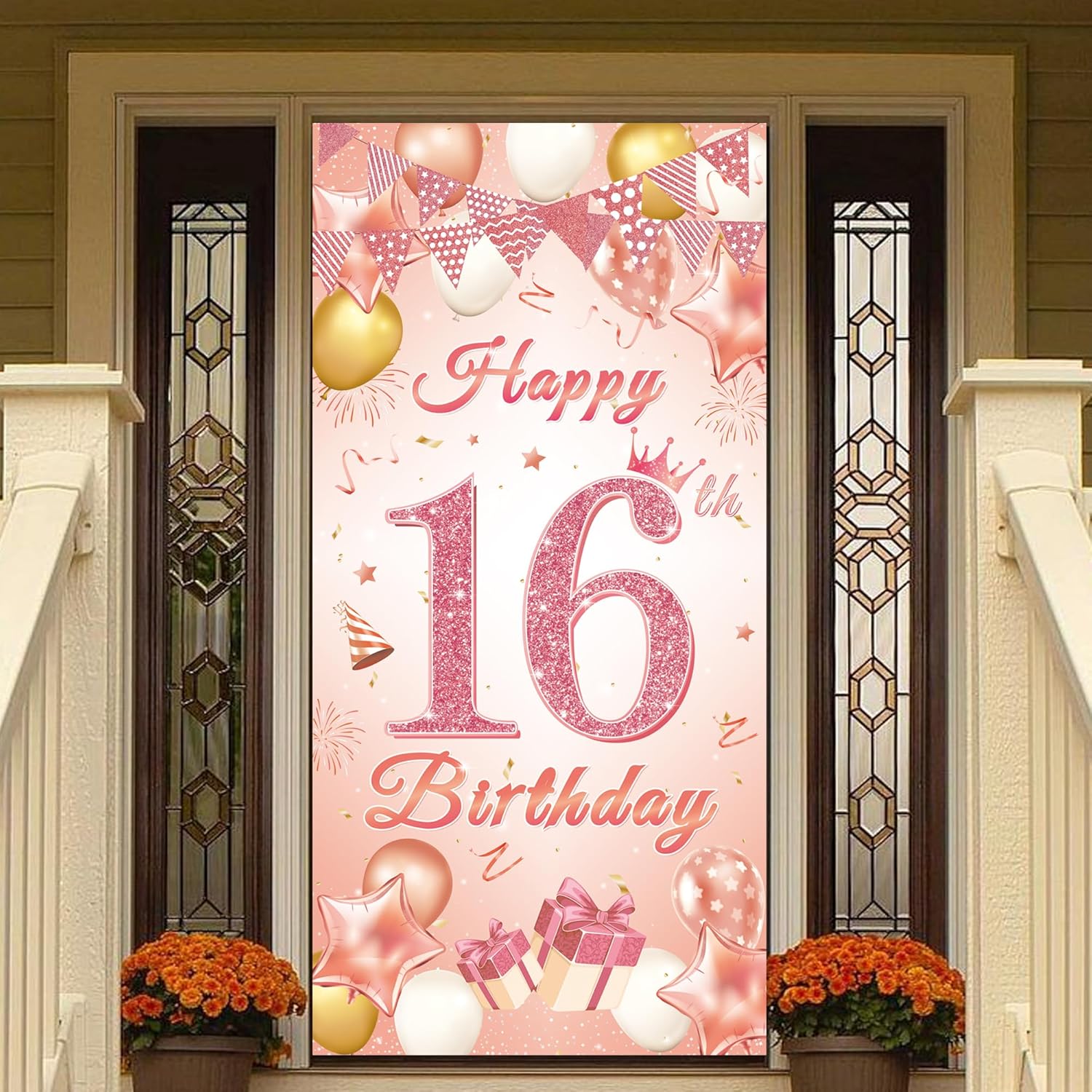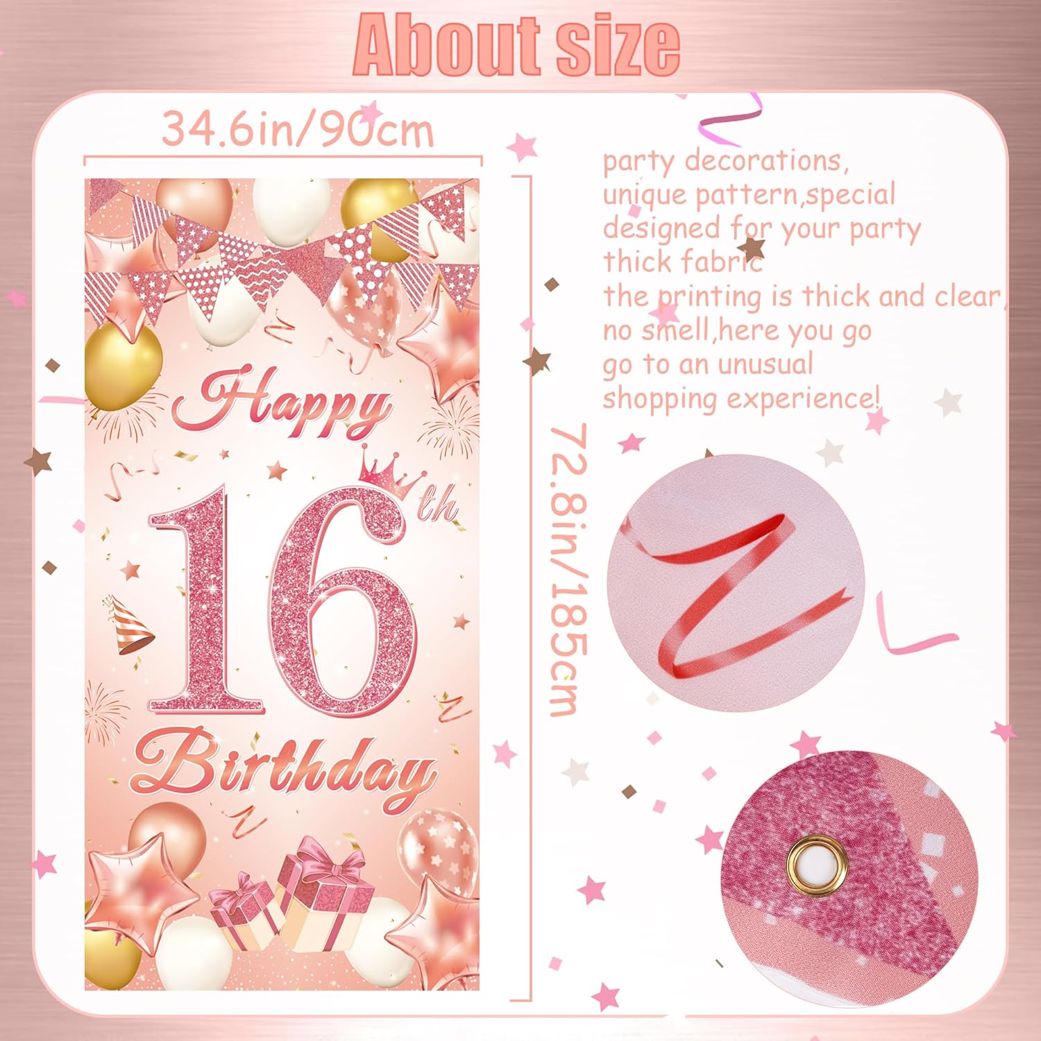 Decorazioni per il 16° compleanno ragazze: riceverai 1 grande tessuto per banner felice per il 16° compleanno in oro rosa (185 x 90 cm), un'ottima scelta per la festa di 16° compleanno di una ragazza Banner per 16° compleanno per ragazze: questo banner per porta di compleanno in oro rosa ben progettato è abbinato a saluti, scatole regalo, ghirlande triangolari, corone, cappelli di compleanno, stelle, coriandoli e altri elementi alla moda per creare un'atmosfera celebrativa. il design generale è pieno di gioia festiva, che è molto adatto per la celebrazione di compleanno di una giovane ragazza Banner per porta per 16° compleanno: questo sfondo decorativo per porte di 16 anni è realizzato con materiali di alta qualità e utilizza una tecnologia di stampa avanzata. I colori sono luminosi, non sbiadiscono facilmente, pieghevoli e riutilizzabili. Il numero 16 di polvere di oro rosa brilla al sole, lasciando una profonda impressione su di te, la tua famiglia e gli amici Decorazioni per il 16° compleanno in oro rosa: la nostra decorazione per il 16° compleanno è molto semplice da usare. devi solo appendere lo sfondo della porta con una corda, che richiede quasi pochissimo tempo, permettendoti di avere più tempo per goderti il momento felice della celebrazione del 16° compleanno con le tue sorelle Banner per porta in oro rosa: utilizzando il nostro banner per porta per 16° compleanno in oro rosa, la tua festa di 16° compleanno sarà un momento impressionante pieno di risate e ricordi. festeggiamo insieme questo giorno speciale e ti auguriamo un buon compleanno