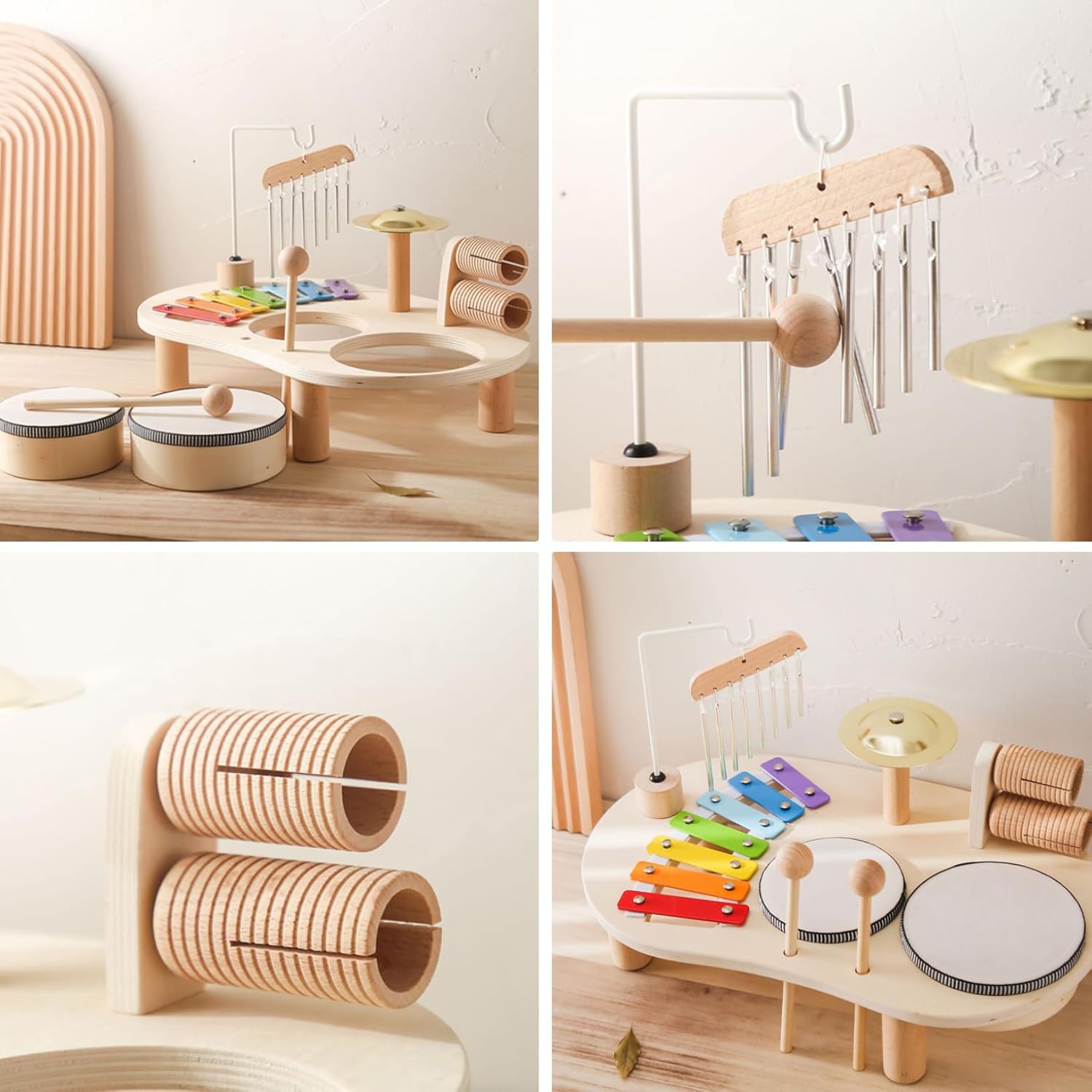 5 in 1: coinvolgi il tuo piccolo nell'affascinante mondo del suono con la nostra batteria per bambini 5 in 1..La collezione comprende un carillon, un piatto, un tamburo, un sonaglio e un clavicembalo, offrendo un set di strumenti altamente suonabili che può stimolare l'interesse dei bambini per la musica. Design compatto: il nostro set di tamburi per bambini è progettato pensando ai più piccoli..Le dimensioni sono compatte, facilitano il gioco dei bambini e, allo stesso tempo, occupano uno spazio minimo in casa..Il suo design a misura di bambino garantisce che sia un giocattolo facile da maneggiare che aiuta il tuo bambino a sviluppare le capacità motorie divertendosi. Facile assemblaggio e conservazione: l'assemblaggio della nostra batteria per bambini è un gioco da ragazzi..Ogni strumento ha il suo slot specifico, semplificando il processo di configurazione..Questa organizzazione ordinata aiuta a riporlo facilmente e riduce al minimo il rischio di perdere parti. Costruzione: questa batteria per bambini è realizzata in legno di qualità, garantendo un giocattolo robusto, durevole e di lunga durata per il tuo bambino..La superficie liscia di ogni strumento è realizzata meticolosamente, priva di sbavature, proteggendo i tuoi piccoli dai graffi durante il gioco. Strumento perfetto e di apprendimento: la batteria per bambini è l'ideale per Natale, compleanni e altre occasioni speciali..Oltre ad essere un regalo delizioso, incoraggia la sensibilità del bambino alla musica e al ritmo..Migliora la coordinazione occhio-mano, il riconoscimento dei colori e la messa a fuoco..Inoltre, l'interazione con questi strumenti aiuta lo sviluppo del cervello, rendendo il momento del gioco un'esperienza di apprendimento benefica.