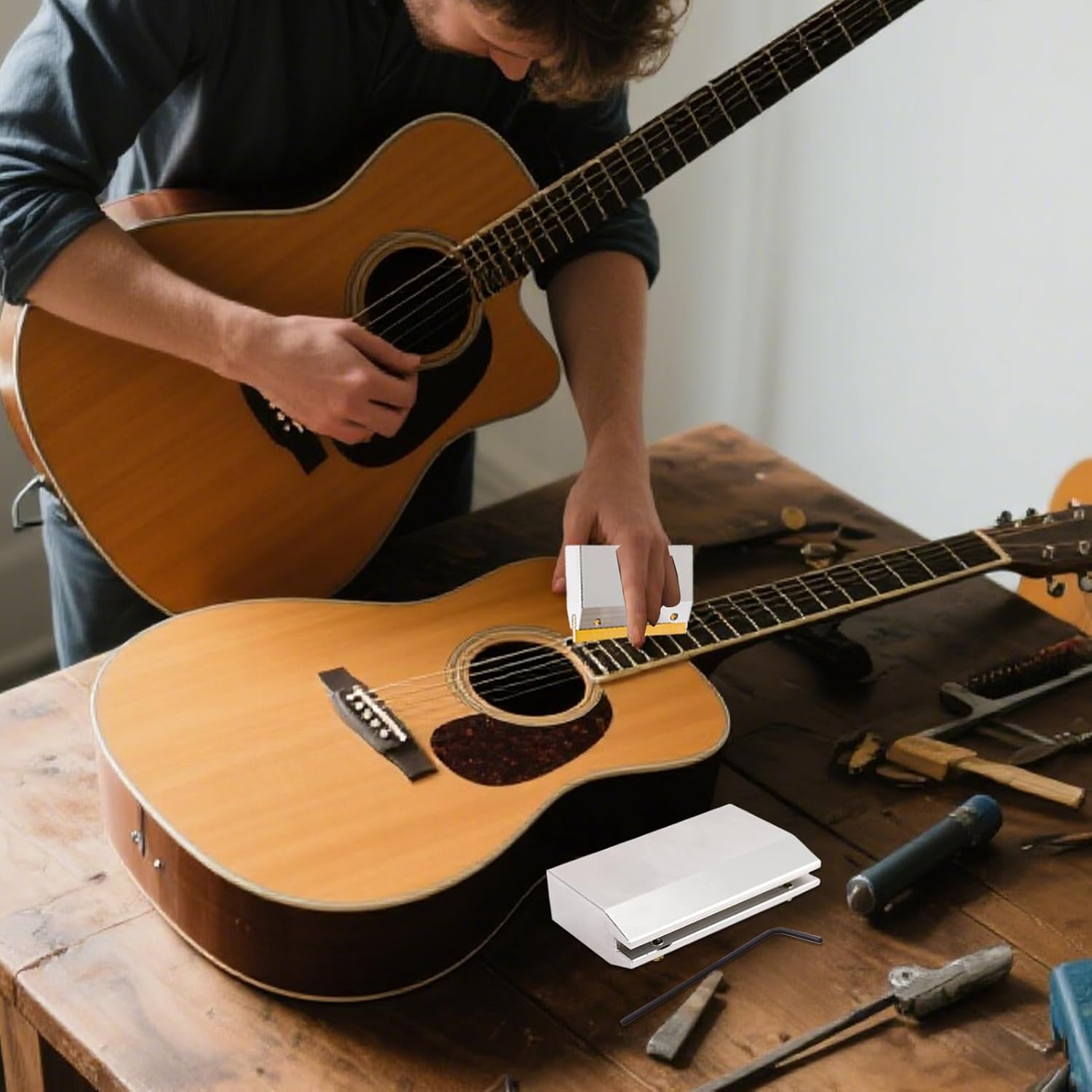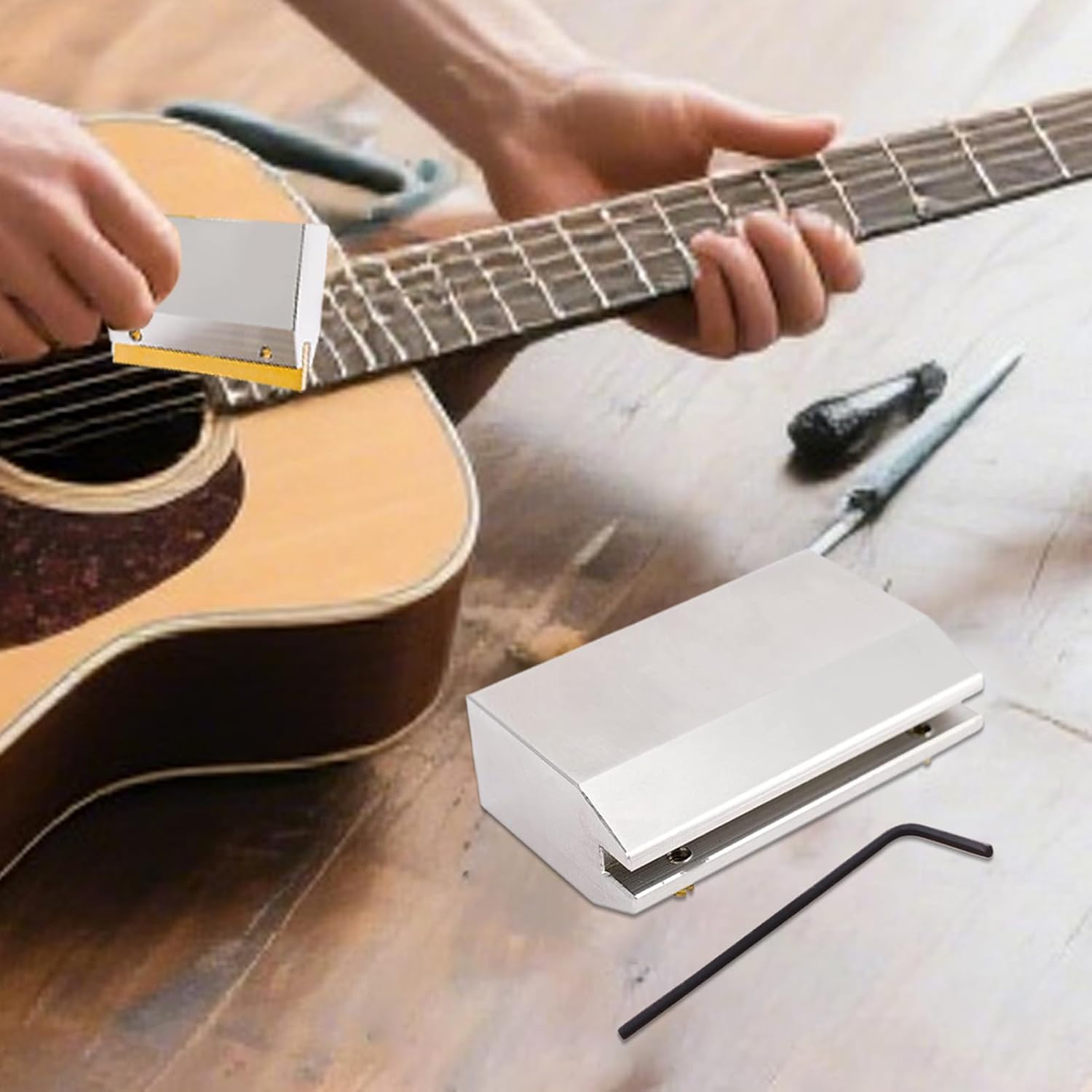 Stabilità di rinforzo: questo strumento di pressione garantisce una vestibilità aderente per una stabilità di lunga durata e un comfort di gioco eccezionale, grazie ad un design meticolosamente progettato per soddisfare le esigenze dei chitarristi. Facile da usare: questo strumento garantisce un serraggio rapido ed efficiente grazie al design innovativo adatto a diversi tipi di chitarre. Supporta varie esigenze di installazione di s fornendo un'esperienza fluida e accessibile agli utenti, indipendentemente dal loro livello di abilità. Distribuzione uniforme della pressione: questa pinza garantisce una distribuzione equilibrata della pressione per un flusso costante delle s proteggendo la chitarra dai danni. Progettato scientificamente, aiuta a prolungare la durata dello strumento durante i lavori di posa o riparazione di s. Ideale per i chitarristi attenti a preservare il loro strumento ottenendo risultati accurati e affidabili con questo strumento indispensabile per il lavoro su it Versatilità Assicurata: questo strumento è progettato per soddisfare varie esigenze di riparazione della chitarra, ideale per musicisti che cercano un assistente affidabile per la sostituzione delle s e le attività di manutenzione. Combinando funzionalità e design incentrato sull'utente, garantisce risultati ottimali, rendendo le attività complesse più accessibili e fluide per gli utenti. Usalo per massimizzare la produttività e il comfort. Design moderno: dotato di impugnatura ergonomica e struttura antiscivolo, questo strumento riduce l'affaticamento aumentando l'efficienza durante i lavori di regolazione della chitarra. Permette un uso prolungato senza tensione muscolare, offrendo una presa comoda adatta alle lunghe sessioni di lavoro sulle s di chitarra.