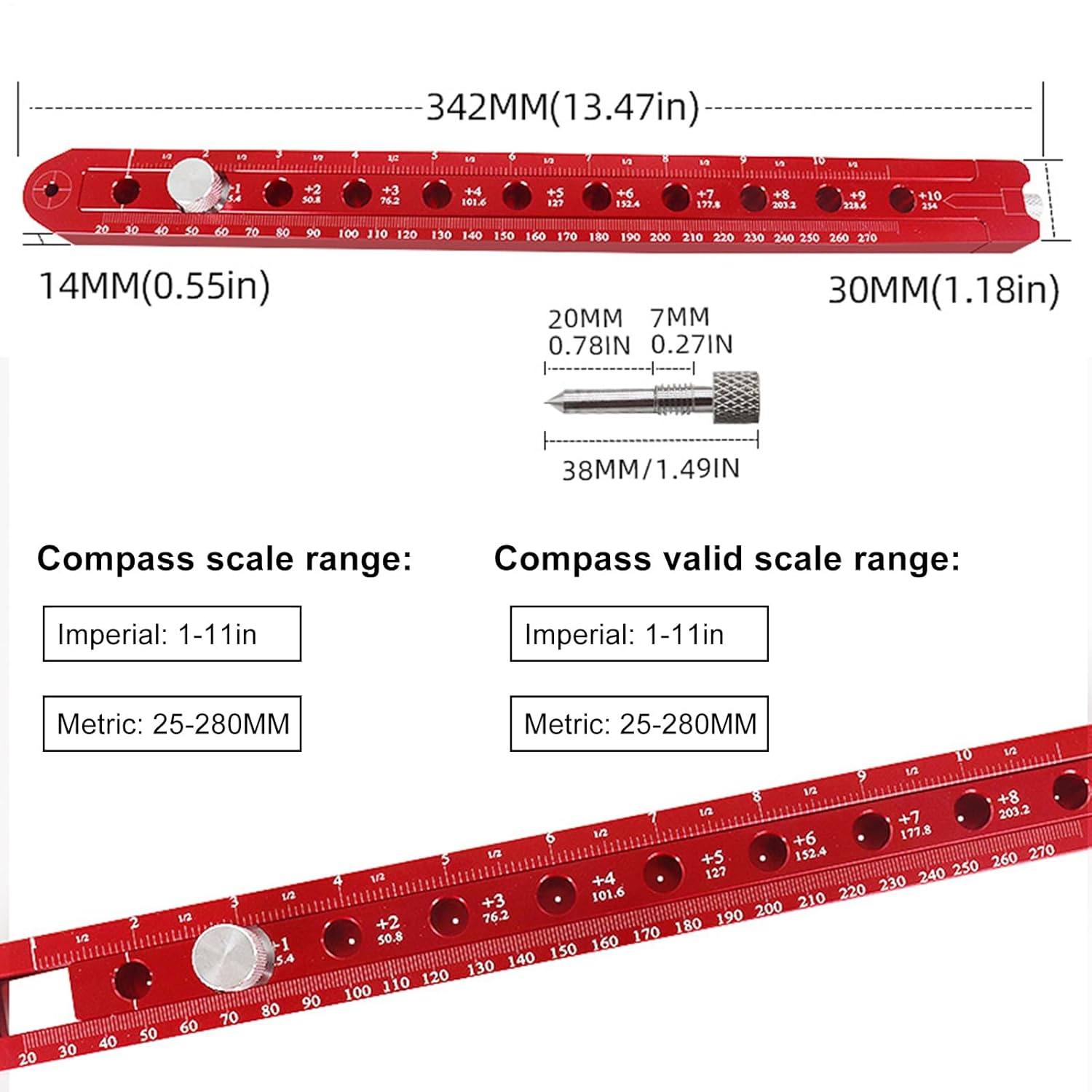 Materiale durevole: realizzato in robusto materiale in lega di alluminio, questo scriber per la lavorazione del legno è costruito per durare e coerentemente prestazioni affidabili nel . Cerchi senza sforzo disegnati: lo scribra bussola per la lavorazione del legno fornisce disegni di precisione facilmente. Con una dimensione del raggio regolabile tra 0-534 mm, disegnare cerchi fino a 1068 mm di diametro. per progetti professionali di lavorazione del legno. Ampia applicazione: assumere facilmente qualsiasi progetto di lavorazione del legno, industriale o decorativo usando il nostro scribra di lavorazione del legno. Dotato di doppie scale per una conversione rapida e facile tra sistemi metrici e imperiali, rendendolo per qualsiasi design fai -da -te o industriale. Facile da trasportare: porta la tua lavorazione del legno al livello successivo con il nostro Scriber: con un design stabile, una regolabile appuntita e una penna fissa che immagazzina alla fine del corpo. Ottieni un taglio, un adattamento e una modellatura precisi ovunque. Precisione migliorata: ottenere risultati ancora più accurati quando si disegnano cerchi sul legno con il nostro scribra di lavorazione del legno. È dotato di un dispositivo sicuro per in posizione la scheda di legno, impedendo qualsiasi deflessione del cerchio ogni volta.