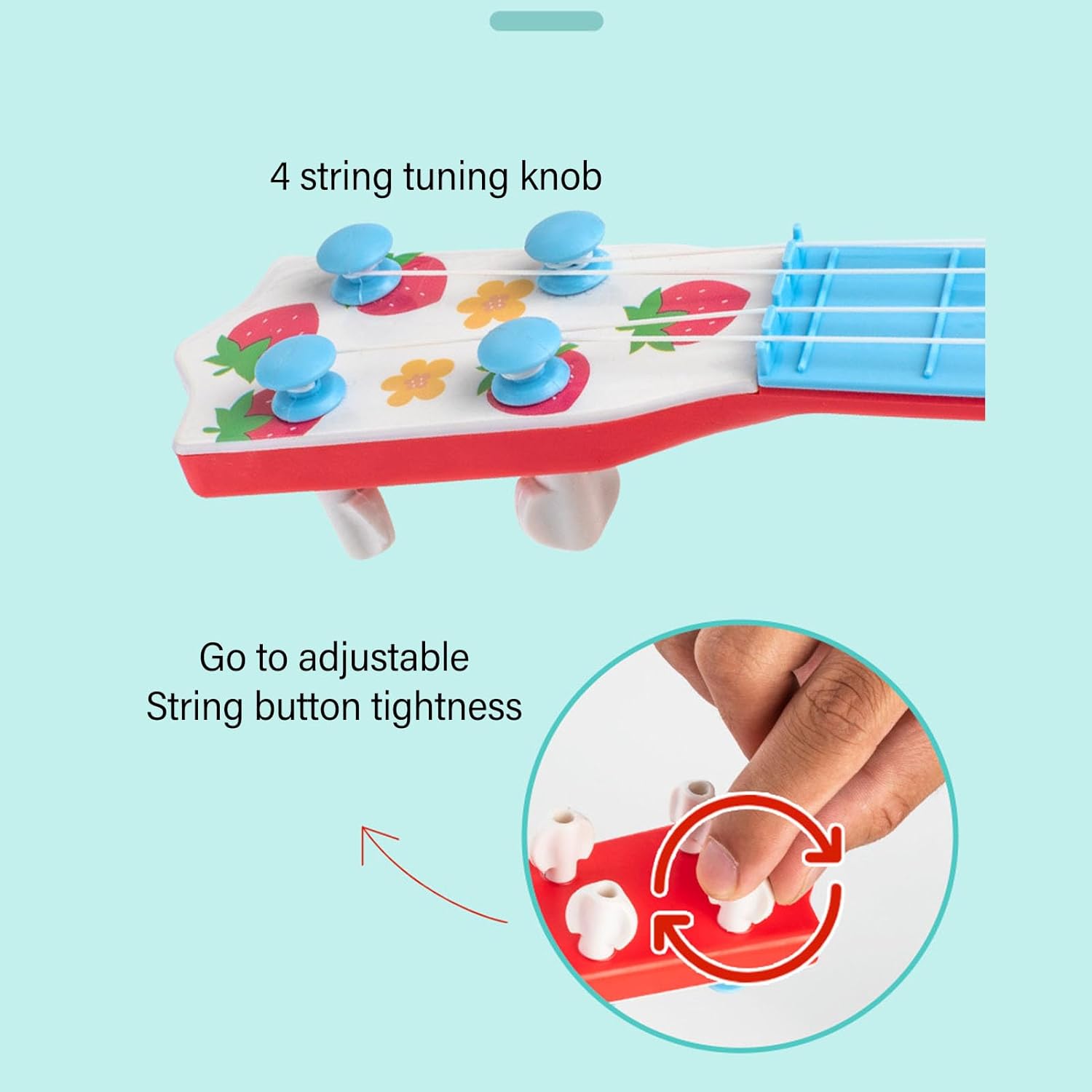 4 corde in nylon al carbonio: infrangibili, completamente suonabili e facili da accordare, insegna ai bambini piccoli il mondo della musica, i ritmi di base, la strimpellatura e altre abilità musicali, promuovendo lo sviluppo dell'orecchio e della creatività. Sviluppa abilità musicali: le corde regolabili e il design realistico del piccolo strumento consentono ai bambini di esplorare il mondo della musica e sviluppare il ritmo e le abilità di gioco. Scelta regalo perfetta: che si tratti di un compleanno, di Natale o di occasioni speciali, l'ukulele giocattolo è un regalo meraviglioso che introduce i bambini alla gioia di fare musica. Incoraggia la creatività e l'espressione: suonare l'ukulele aiuta i bambini ad esprimersi, a liberare la loro creatività, ad acquisire fiducia in se stessi divertendosi con la musica. Sicuro e adatto ai bambini: il giocattolo per ukulele con strumento a corda è realizzato con materiali plastici sicuri che garantiscono la sicurezza del tuo bambino durante il gioco.