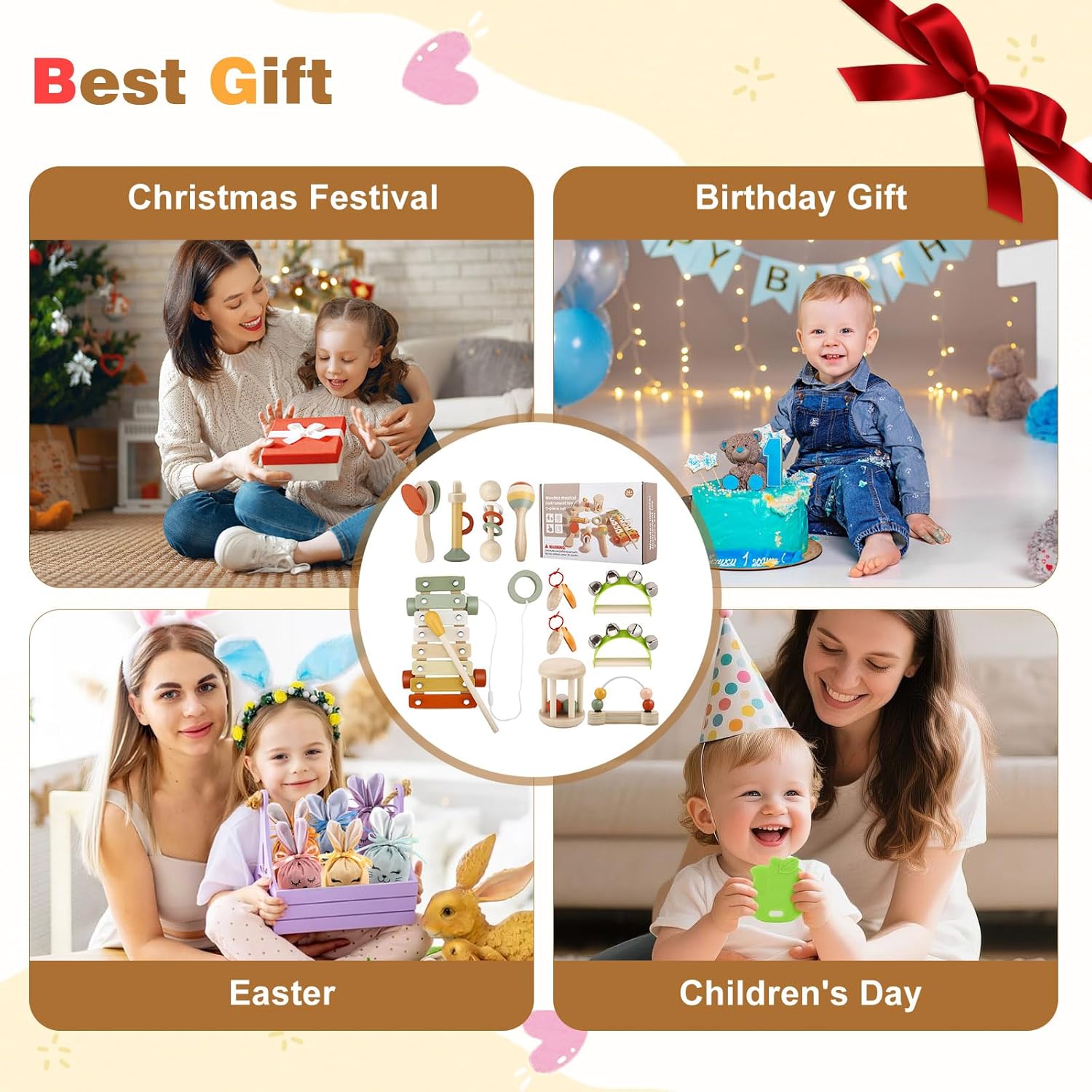 🎵 Set di strumenti musicali per bambini 11 in 1: questo set di strumenti musicali per bambini comprende strumenti musicali, strumenti a percussione, campanelli, strumenti a fiato e altri strumenti musicali. Ogni strumento musicale può produrre suoni piacevoli e favorire lo sviluppo dell'udito del bambino; utilizzando materiali di alta qualità, può anche esercitare la capacità motoria del bambino. 🛡️Sicuro e divertente, stimola il potenziale: questo strumenti musicali bambini 1 anno è appositamente progettato per i bambini di età compresa tra 1 e 3 anni. Il prodotto è realizzato in legno naturale e dispone di certificazione di sicurezza. Garantire che i bambini lo utilizzino non tossico e innocuo, evitando efficacemente i danni causati dalla plastica ai bambini. Fai in modo che i bambini giochino più sicuri e che i genitori si sentano più a loro agio. 🧠 Giocattoli di illuminazione Montessori: questo set di strumenti musicali per bambini è adatto a bambini da 1 a 3 anni. Come primo set per bambini, consente ai bambini di sperimentare ricchi cambiamenti sonori. È un regalo premuroso ed educativo che promuove l'interazione genitore-figlio e porta l'illuminazione musicale ai bambini. 🎨 Colori neutri, si fondono in modo naturale: questo strumenti musicali bambini 1 anno è progettato con colori neutri ed elementi in legno di alta qualità, che lo rendono facile da fondere con vari stili domestici. I toni morbidi e terrosi creano un'atmosfera di gioco tranquilla e concentrata e possono anche essere utilizzati come elegante aggiunta decorativa alla cameretta dei bambini in stile bohémien. 🎁Regalo ideale per la prima educazione: questo set di strumenti è facile da usare e può aiutare i bambini a sviluppare il senso del ritmo, la comprensione della melodia e lo sviluppo sensoriale, migliorando al contempo le capacità motorie, la concentrazione e l'osservazione. È un collegamento importante tra l'interazione genitore-figlio ed è adatto come regalo educativo premuroso per compleanni, Natale e festività importanti.