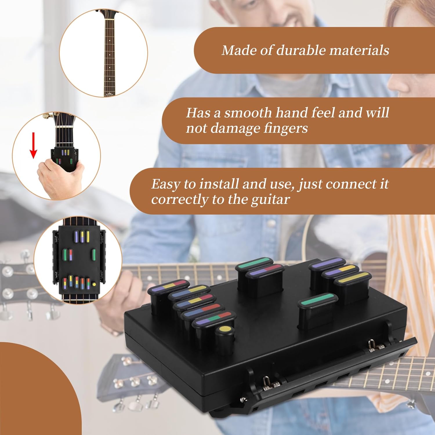 [Strumento di apprendimento rapido] Adulti o bambini, indipendentemente dall'età, possono imparare a suonare la chitarra rapidamente e facilmente. È anche un allenamento perfetto per i principianti nell'apprendimento della chitarra. Lo strumento di apprendimento della chitarra può eliminare il dolore alle si premono le corde. [Amichevole per principianti] Ogni colore dello strumento accordi per chitarra rappresenta un accordo. Premere il pulsante con il colore corrispondente per suonare un accordo specifico. È facile per i principianti capire e ricordare gli accordi di chitarra. [ esperienza di gioco] La diteggiatura si utilizza lo strumento per esercitarsi con la chitarra è la stessa della diteggiatura tradizionale, che non influirà base della diteggiatura. Avrai una esperienza di apprendimento e di gioco. [Materiali di alta qualità] Lo strumento per accordi a un tasto per chitarra è realizzato in materiale durevole, che ha una sensazione morbida e non danneggerà le . La morbida gomma clip impedisce allo strumento per accordi di scivolare via chitarra. [Come usare] Lo strumento per accordi per chitarra è facile da installare e utilizzare, basta collegarlo correttamente alla chitarra. Quindi puoi esercitarti con la chitarra e suonare musica meravigliosa premendo i pulsanti.