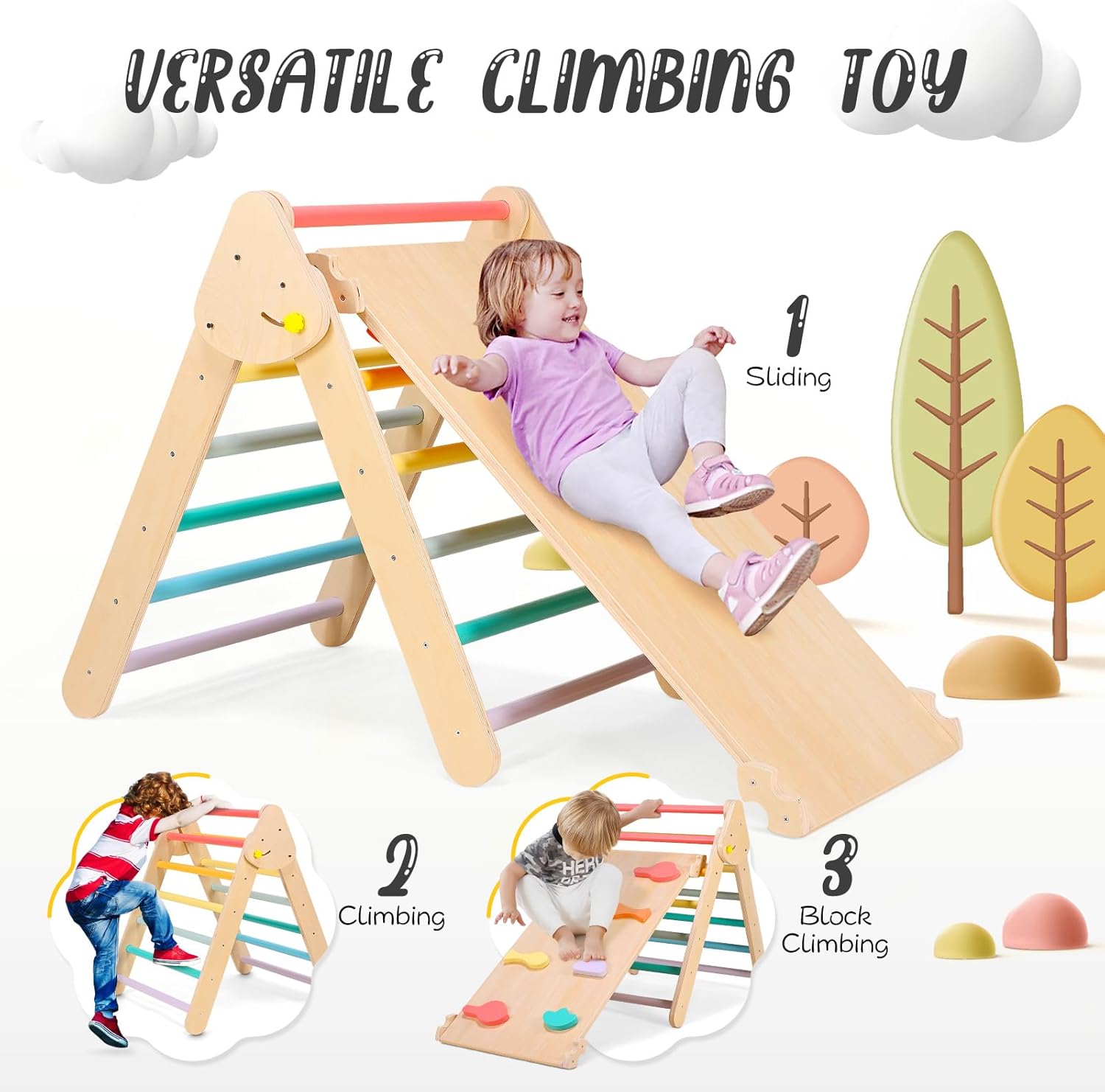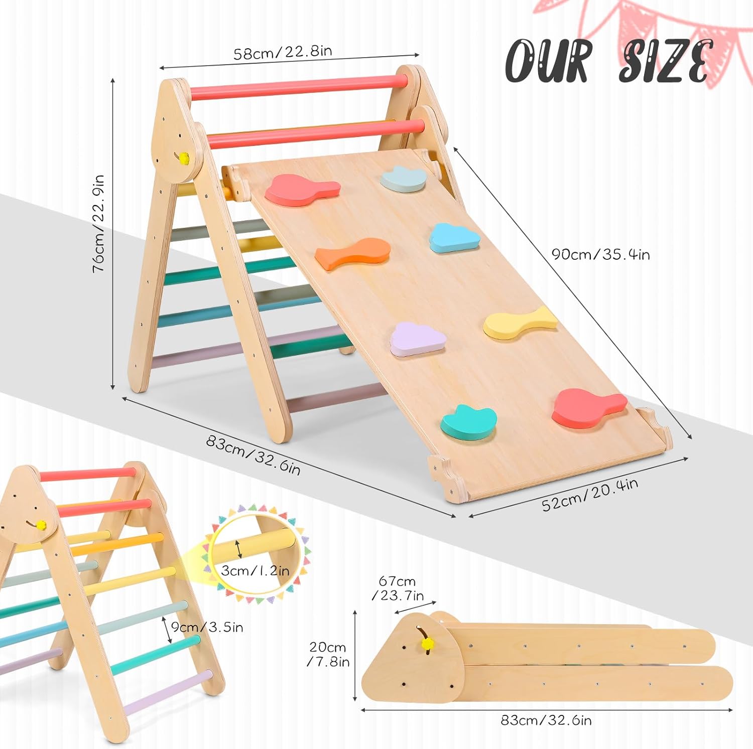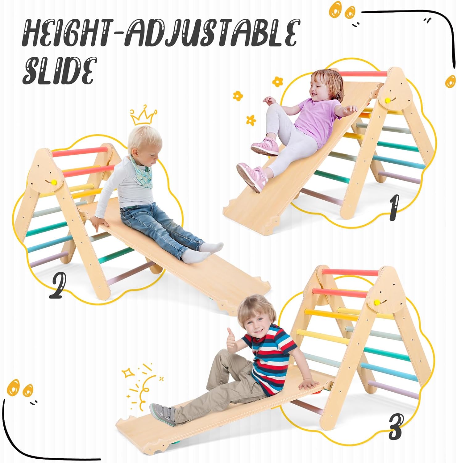 【Scivolo bifacciale con 8 blocchi da arrampicata】Dotato di uno scivolo bifacciale, i tuoi bambini potranno divertirsi scivolando da un lato e intraprendere un'emozionante avventura di arrampicata dall'altro. Gli 8 blocchi da arrampicata aumentano ulteriormente le possibilità di gioco. Puoi anche regolare l'altezza di scorrimento. 【Design pieghevole per riporlo facilmente】Questo scalatore triangolare 3 in 1 presenta un design pieghevole che ti consente di riporlo quando non in uso. La dimensione piegata è 83×67×20 cm. Massimizza il tuo spazio e mantieni organizzata la tua area giochi senza compromettere il divertimento e l'avventura del bambino. 【Vantaggi di sviluppo】Il nostro scalatore triangolare è costituito da uno scivolo per arrampicata e scorrimento 2 in 1 e una struttura da arrampicata triangolare. Più che un semplice intrattenimento, promuove anche lo sviluppo di abilità vitali, tra cui la coordinazione, l'equilibrio e le capacità motorie. E i colori vivaci aiutano il riconoscimento dei colori dei bambini. 【La sicurezza prima di tutto】La sicurezza è la nostra priorità. Questo scalatore per bambini è realizzato in legno di pino ecologico, garantendo un'esperienza di gioco sicura e duratura. Anche la vernice utilizzata è atossica e adatta ai bambini. Con una presa comoda, garantisce sicurezza durante le avventure di arrampicata e scivolamento. 【Capacità di carico stabile di 50 kg】Lo scalatore ha una solida struttura triangolare e i giunti sono tenuti saldamente in posizione, garantendo stabilità. Può sostenere fino a 50 kg e permette a due bambini di giocare insieme. Il rinforzo dei chiodi irrobustisce ulteriormente la struttura, garantendo una lunga durata.