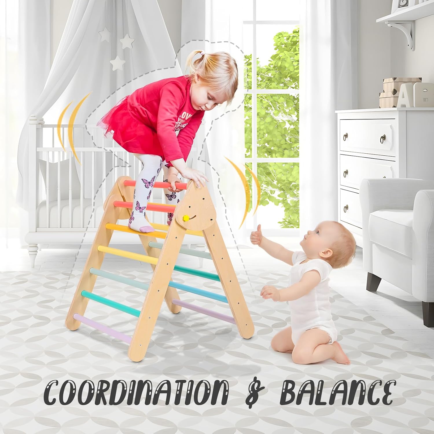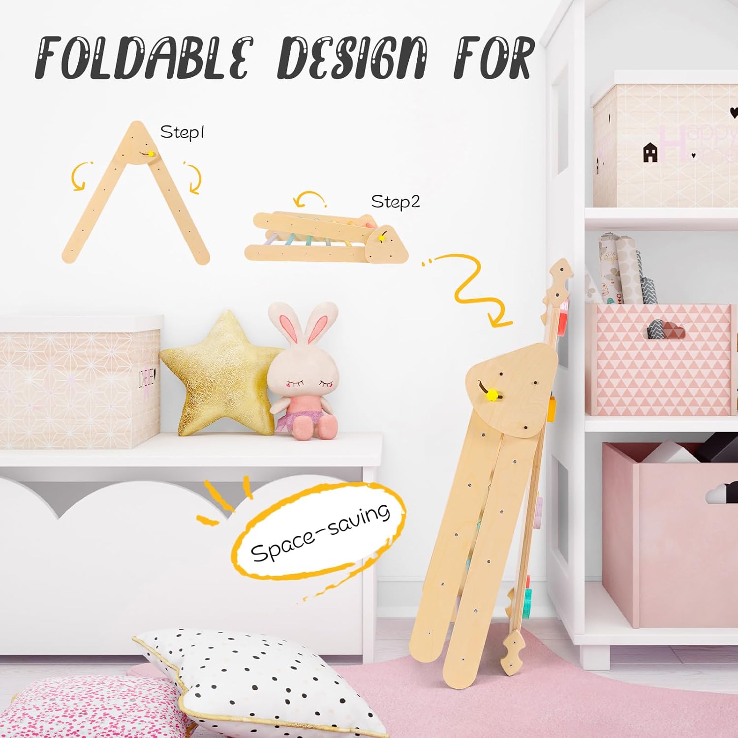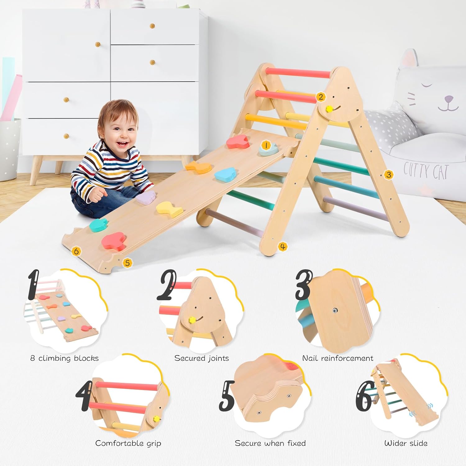 【Scivolo bifacciale con 8 blocchi da arrampicata】Dotato di uno scivolo bifacciale, i tuoi bambini potranno divertirsi scivolando da un lato e intraprendere un'emozionante avventura di arrampicata dall'altro. Gli 8 blocchi da arrampicata aumentano ulteriormente le possibilità di gioco. Puoi anche regolare l'altezza di scorrimento. 【Design pieghevole per riporlo facilmente】Questo scalatore triangolare 3 in 1 presenta un design pieghevole che ti consente di riporlo quando non in uso. La dimensione piegata è 83×67×20 cm. Massimizza il tuo spazio e mantieni organizzata la tua area giochi senza compromettere il divertimento e l'avventura del bambino. 【Vantaggi di sviluppo】Il nostro scalatore triangolare è costituito da uno scivolo per arrampicata e scorrimento 2 in 1 e una struttura da arrampicata triangolare. Più che un semplice intrattenimento, promuove anche lo sviluppo di abilità vitali, tra cui la coordinazione, l'equilibrio e le capacità motorie. E i colori vivaci aiutano il riconoscimento dei colori dei bambini. 【La sicurezza prima di tutto】La sicurezza è la nostra priorità. Questo scalatore per bambini è realizzato in legno di pino ecologico, garantendo un'esperienza di gioco sicura e duratura. Anche la vernice utilizzata è atossica e adatta ai bambini. Con una presa comoda, garantisce sicurezza durante le avventure di arrampicata e scivolamento. 【Capacità di carico stabile di 50 kg】Lo scalatore ha una solida struttura triangolare e i giunti sono tenuti saldamente in posizione, garantendo stabilità. Può sostenere fino a 50 kg e permette a due bambini di giocare insieme. Il rinforzo dei chiodi irrobustisce ulteriormente la struttura, garantendo una lunga durata.