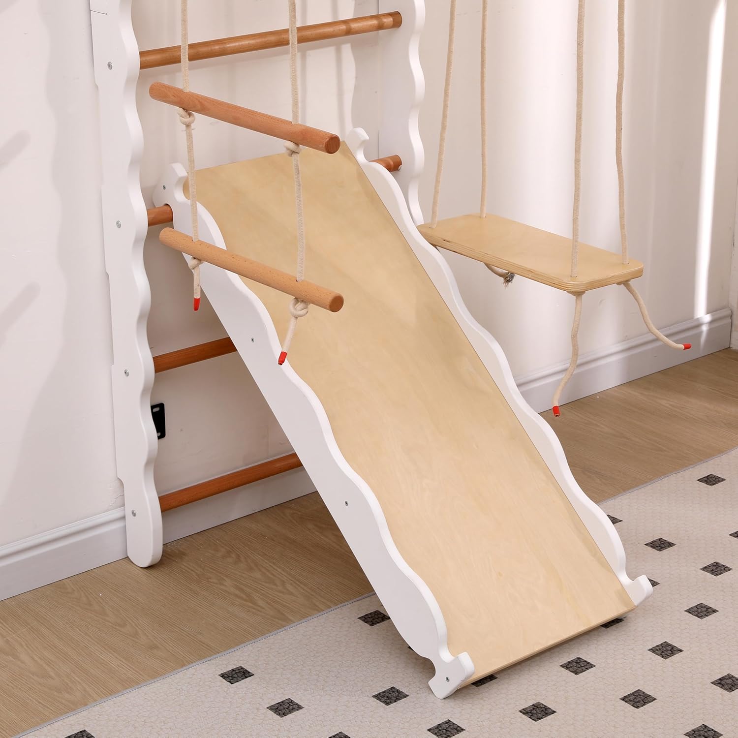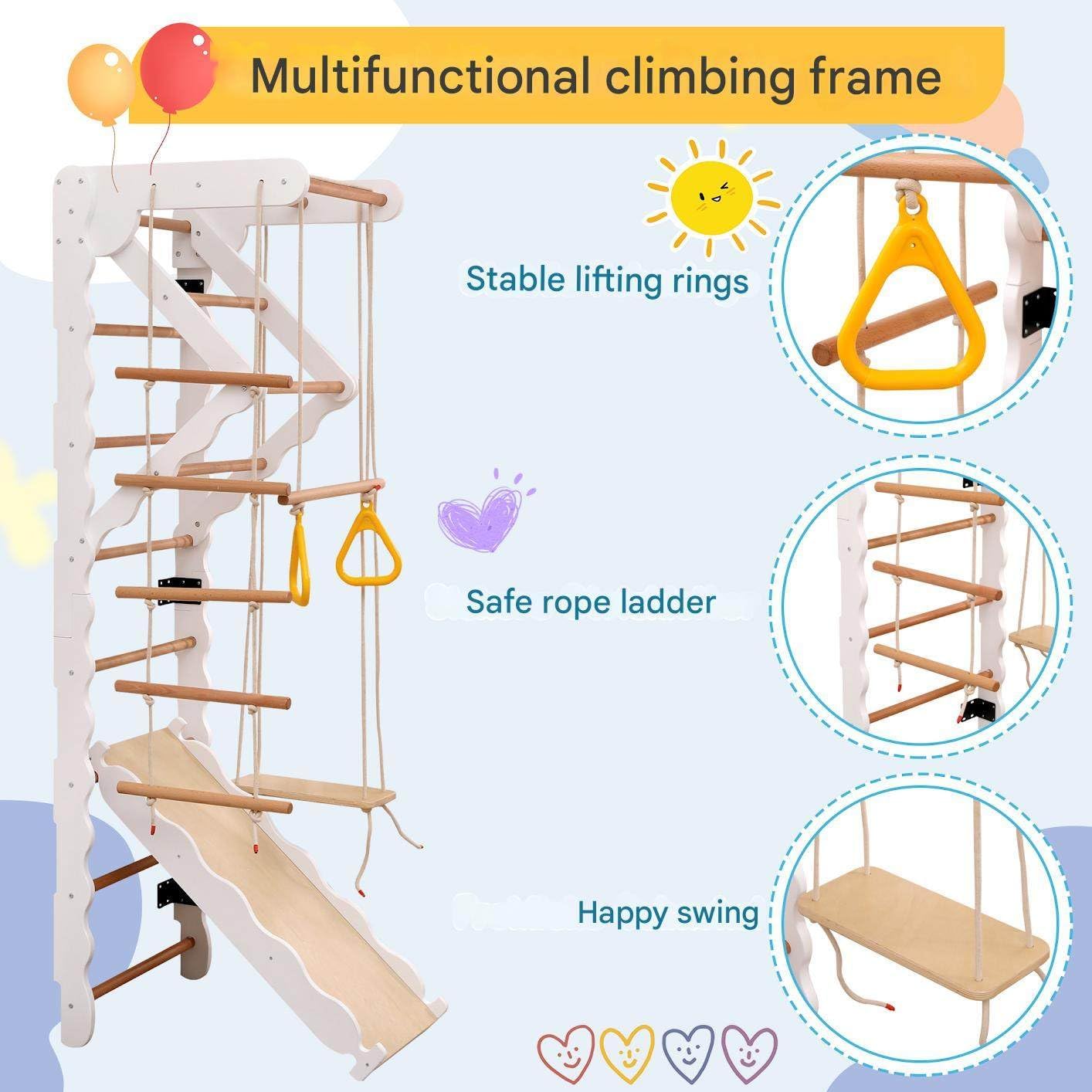 【PIANO DI ARRAMPICATA 6 IN 1】: Essendo un piano di arrampicata multifunzionale per bambini, questo piano di arrampicata in legno 6 in 1 offre sei diverse funzioni, tra cui un'altalena, un paio di anelli, una scaletta per gattonare, uno scivolo, un piano di arrampicata verticale e una struttura rettangolare per la giungla. Questo piano di arrampicata combinato non occupa molto spazio laterale, indipendentemente dalle dimensioni dello spazio, può essere facilmente sistemato. 【DESIGN SICURO E ROBUSTO】: Realizzato in legno massello, faggio e compensato resistente, tutti i componenti sono progettati per garantire stabilità e sicurezza. La squisita fattura di questo prodotto, senza sbavature sulla superficie, garantisce un ambiente di gioco sicuro e divertente per bambini dai 2 ai 12 anni. 【SVILUPPA MOLTEPLICI ABILITÀ】: Con questo piano di arrampicata in legno 6 in 1, due bambini possono giocare insieme, poiché la capacità di carico massima è di 50 kg. I bambini possono giocare insieme e praticare vari sport, sviluppando equilibrio, coordinazione e capacità motorie. 【FACILE DA ASSEMBLARE】Questo prodotto con corpo principale in legno presenta una venatura ondulata simile a una nuvola, che richiede il montaggio da parte degli utenti. Le illustrazioni chiare e le istruzioni logiche contenute nella confezione garantiscono un processo di assemblaggio fluido. È necessario un solo attrezzo: un trapano elettrico. 【GARANZIA DI SICUREZZA】Una delle caratteristiche più importanti di tutti i prodotti per bambini è la sicurezza, e questo non fa eccezione. Questo prodotto ha una struttura razionale e utilizza vernice ecologica. È inodore e adatto ai bambini. Non ci sono viti sporgenti nell'area di arrampicata dello scivolo. Questo prodotto ha superato la certificazione EN71.