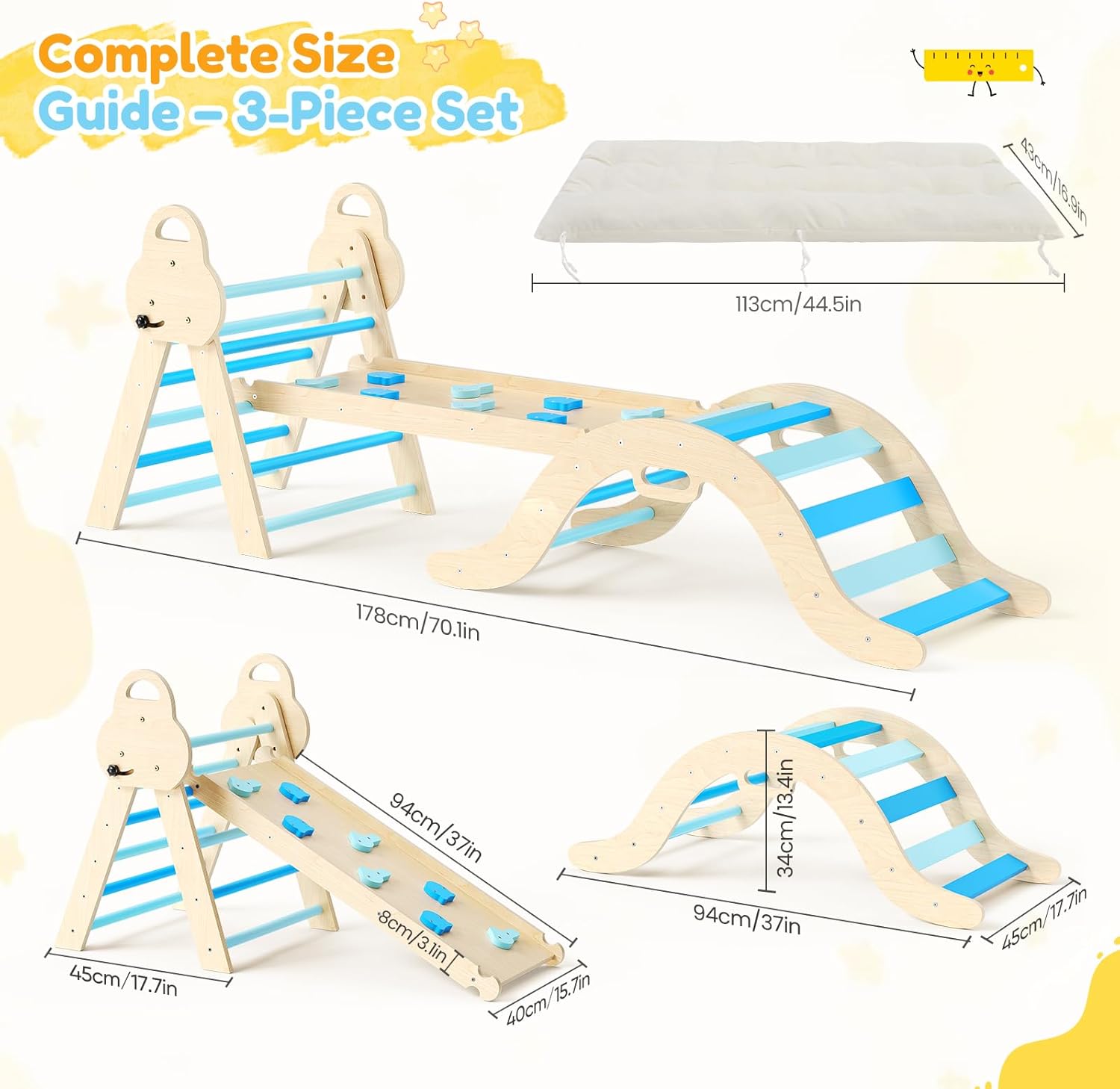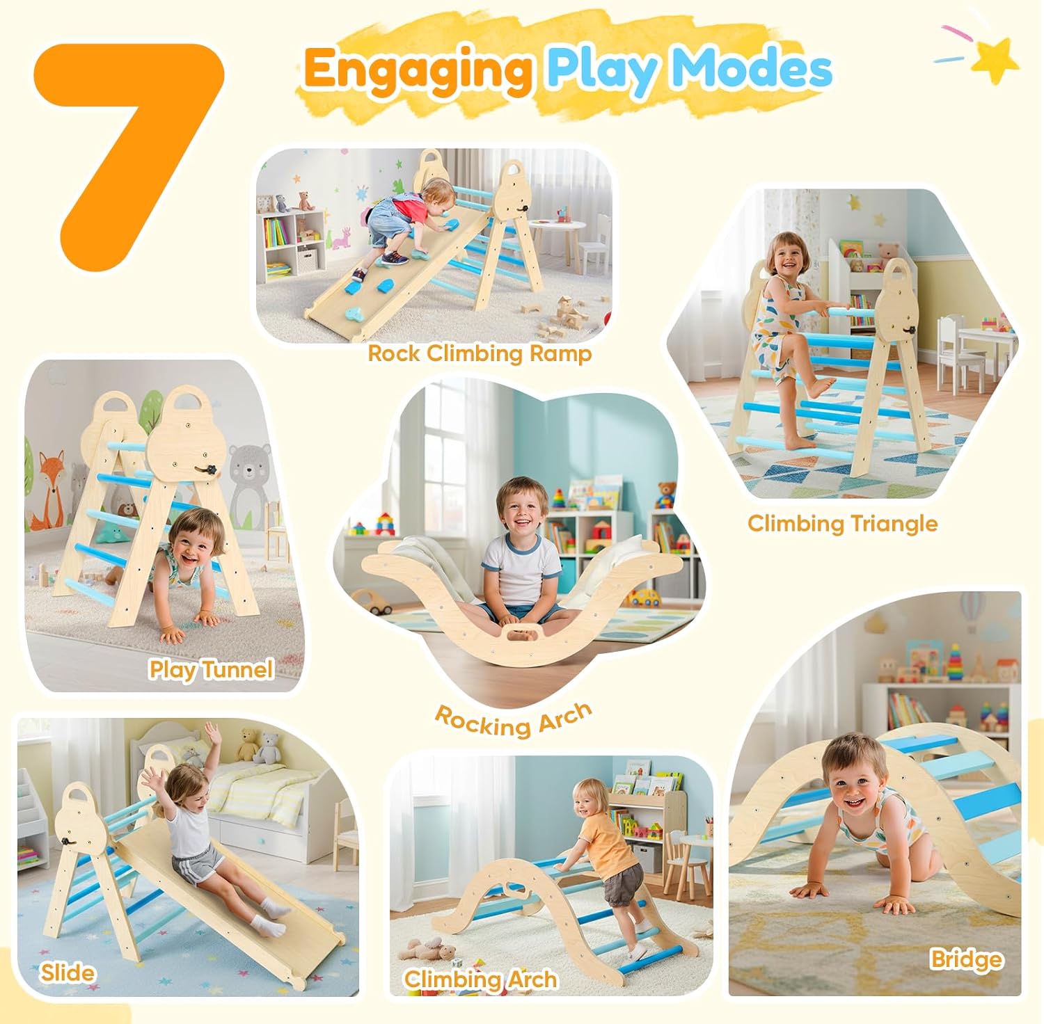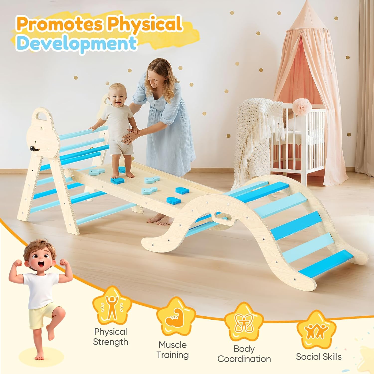 Modalità di gioco 7 in 1: il set di giocattoli da arrampicata migliorato nel 2025 include una scala triangolare, una scala ad arco e una tavola da arrampicata e offre sette diverse opzioni di gioco che stimolano l'immaginazione e l'impulso di esplorare i bambini. Materiali ecologici e resistenti: realizzato in legno massello di tiglio, è inodore e privo di sbavature, ha una superficie liscia e sicura e una capacità di carico di 50 kg per un gioco sicuro. Sistema di regolazione migliorato: la testa della vite allargata e i fori preforati garantiscono una regolazione più stabile e sicura ed evitano i potenziali pericoli delle regolazioni scorrevoli tradizionali. Facile da montare e riporre: il prodotto viene fornito con istruzioni dettagliate (lingua italiana non garantita), è facile da montare e può essere riposto per risparmiare spazio. Promuovere lo sviluppo del bambino: promuove la forza fisica, la coordinazione e la creatività dei bambini e promuove la crescita generale attraverso giochi interattivi.