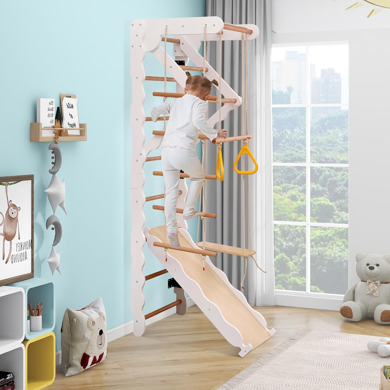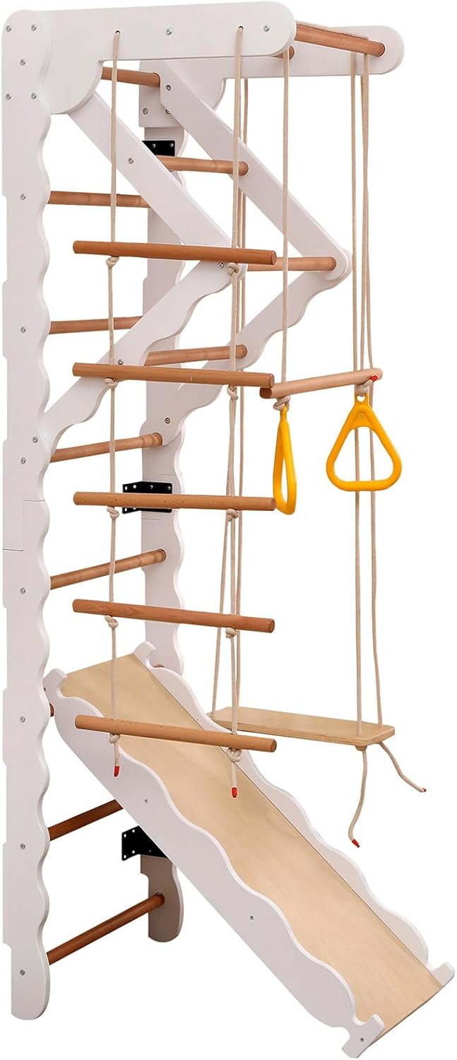 【Palestra da arrampicata 6 in 1】Questa struttura da arrampicata in legno 6 in 1 è una struttura da arrampicata multifunzionale per bambini, dotata di 6 diverse funzioni, tra cui un'altalena, un paio di anelli, una scaletta per gattonare, uno scivolo, una struttura da arrampicata verticale e una struttura da giungla ad angolo retto. Questa struttura da arrampicata combinata non occupa molto spazio laterale. 【Sviluppa molteplici abilità】Con questa struttura da arrampicata in legno 6 in 1, 2 bambini possono giocare insieme, poiché la capacità di carico massima è di 50 kg. I bambini possono giocare insieme e praticare vari sport. Può allenare la loro coordinazione, la forza fisica, le capacità di equilibrio, le abilità sociali e la creatività. 【Legno di qualità】 Realizzato in legno, faggio e compensato resistente, questi materiali certificati garantiscono stabilità. La lavorazione di questo prodotto è squisita, senza sbavature per evitare che i bambini si feriscano accidentalmente durante il gioco. 【Design di sicurezza】Questo prodotto ha una struttura e una verniciatura adeguate. Non ci sono viti sporgenti nell'area di arrampicata dello scivolo. Garantisce ai bambini di giocare in sicurezza. 【Facile da montare】Questo prodotto con corpo principale in legno presenta una venatura ondulata simile a una nuvola che richiede il montaggio da parte dell'utente. Le illustrazioni chiare e le istruzioni logiche nella confezione garantiscono un montaggio agevole per gli utenti.