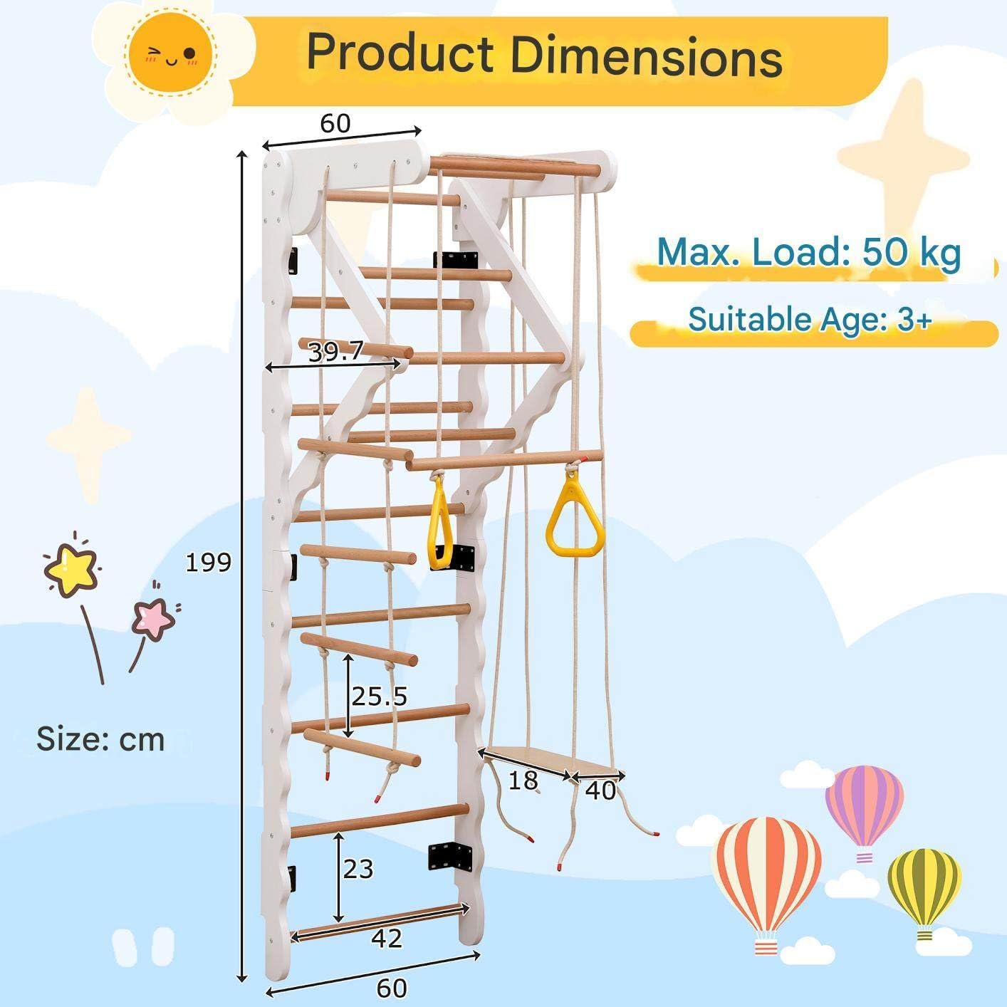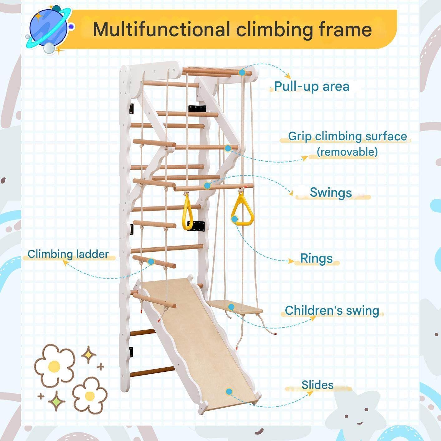 【Design multifunzionale】 - La struttura da arrampicata 6 in 1 combina altalena, anelli, scala a pioli, scivolo, parete da arrampicata e area di trazione in un design compatto. Offre un divertimento vario in una piccola area e aiuta i bambini a sviluppare importanti capacità motorie e attività sportive nella vita di tutti i giorni, perfetto per gli interni. 【Allenamento e divertimento per le capacità motorie】 - Giocare su questa parete da gioco promuove l'equilibrio, il controllo del corpo e la coordinazione. Che si tratti di dondolarsi, arrampicarsi o scivolare, il design variegato risveglia la gioia della scoperta e la voglia di muoversi nei bambini dai 3 anni in su, supportando il loro sviluppo olistico in un ambiente sicuro. 【Materiali di alta qualità】 - Realizzata in resistente legno massello, legno di faggio e compensato resistente, la struttura da arrampicata offre una base stabile per un utilizzo duraturo. La finitura liscia con bordi arrotondati riduce il rischio di lesioni e garantisce un'esperienza di gioco sicura per i bambini, per una costruzione durevole e ben studiata. 【Sicurezza certificata】 - Questo dispositivo di gioco per interni è certificato secondo la norma EN71 e soddisfa quindi i rigorosi standard di sicurezza europei. Le vernici a base d'acqua sono inodori e adatte ai bambini. La struttura sofisticata, senza viti sporgenti, riduce al minimo i rischi: un dispositivo di gioco sicuro e di qualità testata. 【Comodo da usare in interni】 - Il design salvaspazio ne consente il montaggio nelle camerette dei bambini o nelle aree gioco. Non richiede un ingombro elevato e può essere integrato perfettamente in ambienti già esistenti, per un divertimento in casa indipendentemente dalle condizioni meteorologiche, tutto l'anno.