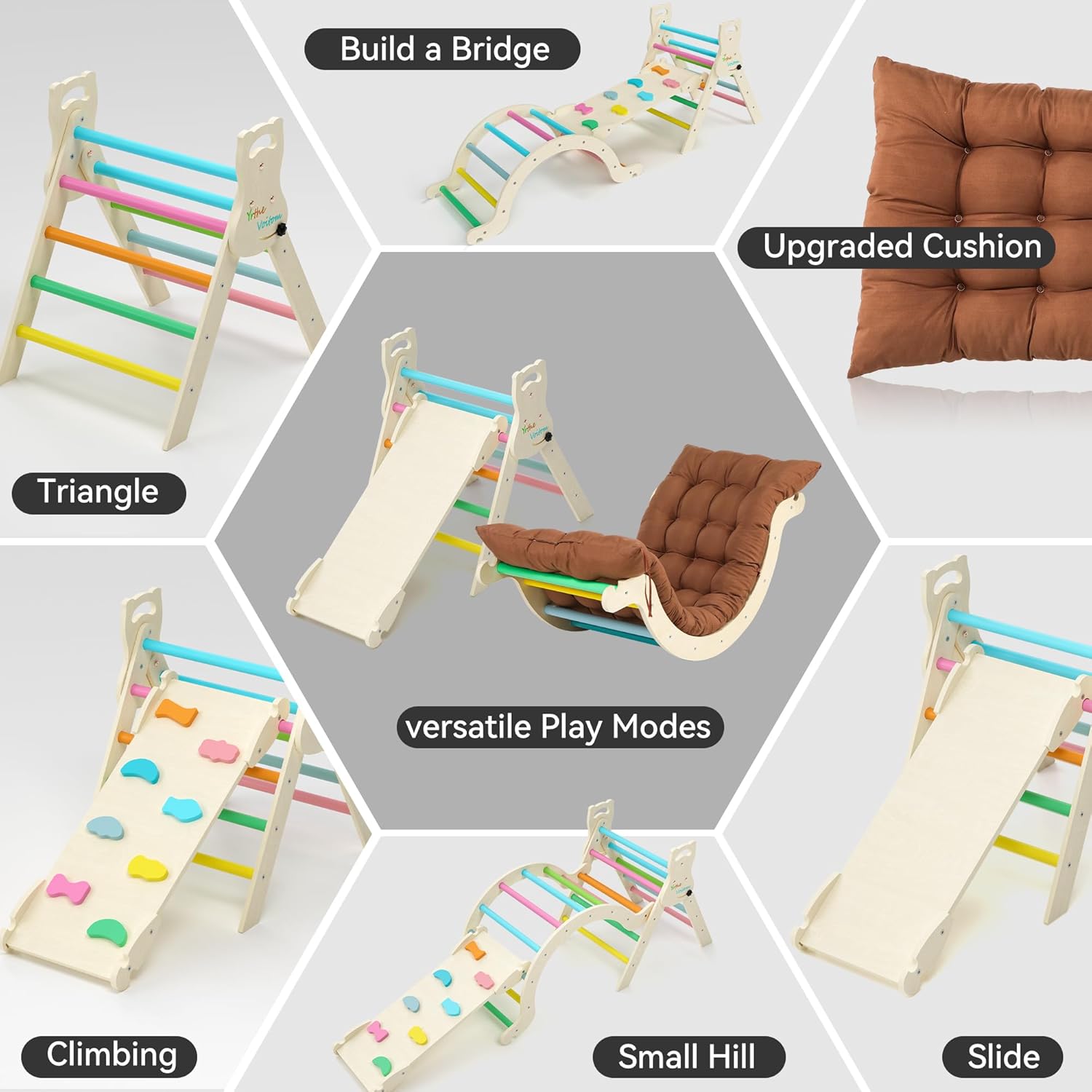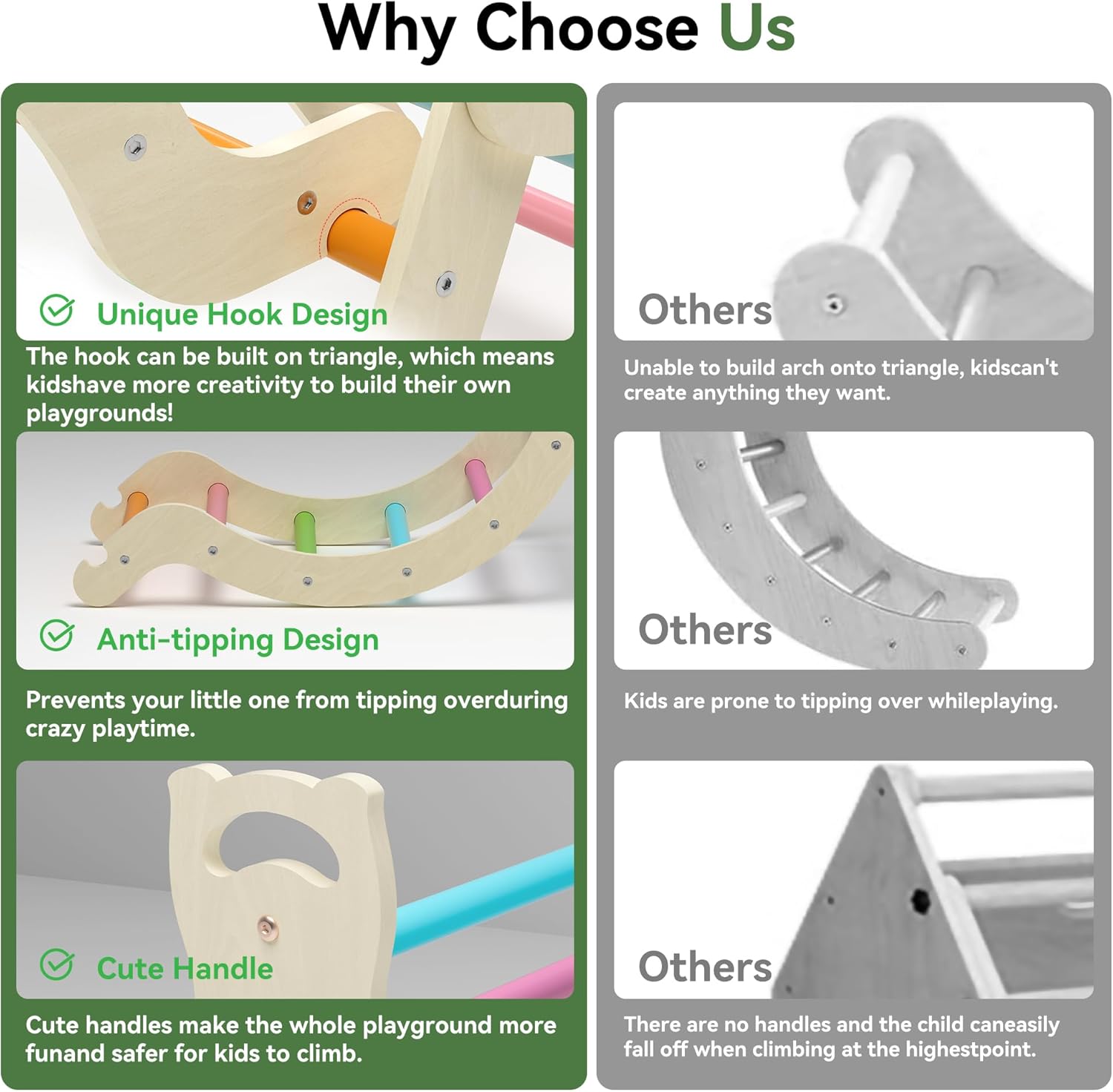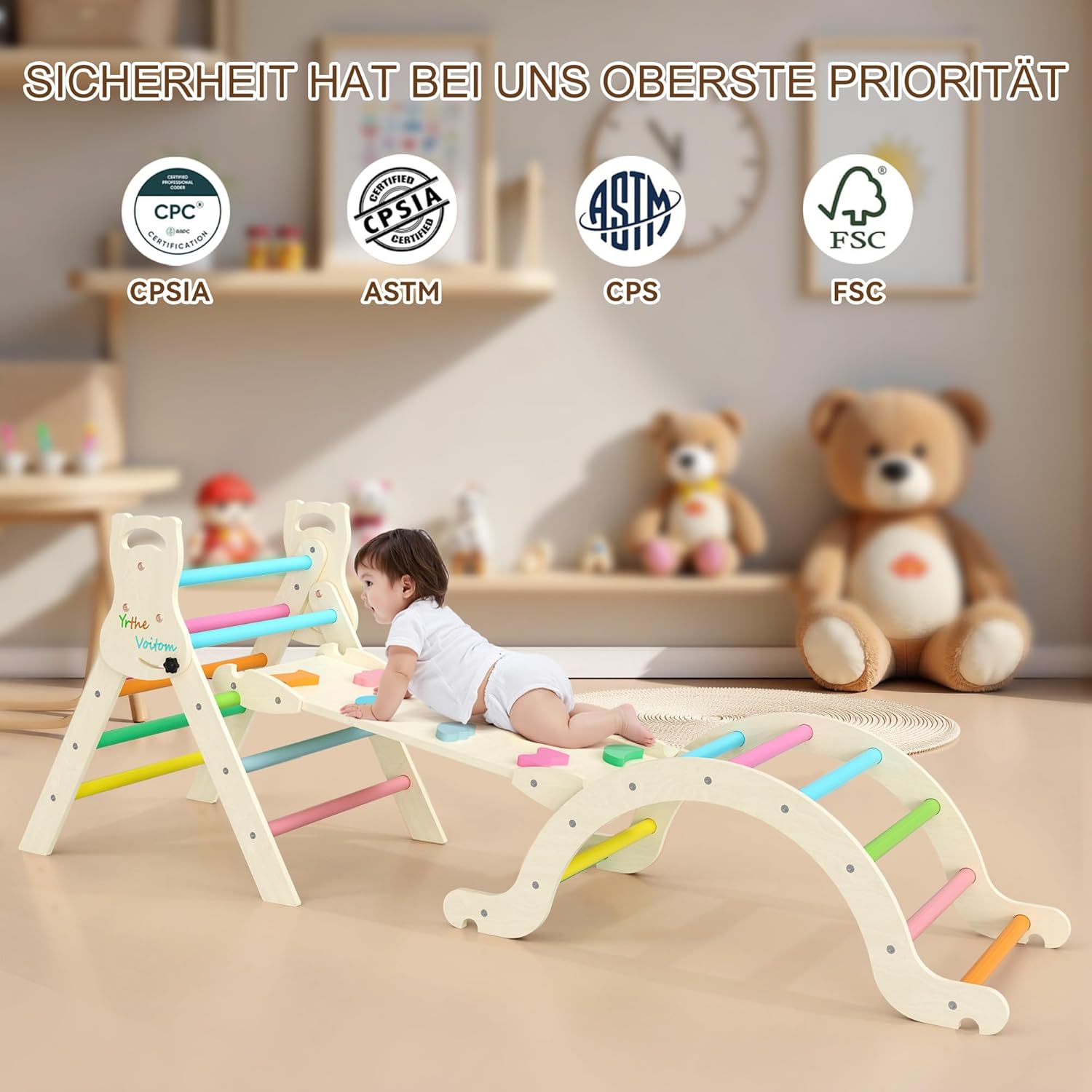 I bambini sono al primo posto. Triangolo da arrampicata Yrthe Voitom Upgrade certificato secondo gli standard ASTM e CPSC. Tutti i pezzi sono realizzati in legno naturale al 100%, atossico e inodore. Il legno è accuratamente lucidato e verniciato, liscio e senza sbavature, per creare un sicuro e divertente gioco per i vostri bambini ✅ 7 possibilità di combinazione: questo triangolo da arrampicata è composto da strutture da arrampicata, uno scivolo, un arco e un cuscino ad arco. La struttura da arrampicata presenta uno scivolo a doppia faccia, un lato con struttura rocciosa per l"arrampicata e l"altro liscio lucido per lo scorrimento, l"arco da arrampicata può anche essere capovolto e utilizzato come barca a dondolo e molte altre opzioni di gioco. Per stimolare le capacità motorie, la coordinazione del corpo, l'equilibrio e lo sviluppo del cervello dei bambini ✅ Progettata per le prospettive dei bambini: i colori vivaci della struttura da arrampicata favoriscono la percezione dei colori dei bambini, le avventure con gli amici; i morbidi cuscini con curvatura creano una comoda sedia a dondolo; la struttura unica del gancio per i bambini crea il proprio parco giochi! Le curve prolungate del fondo impediscono il ribaltamento anche durante il gioco selvaggio; le pratiche maniglie aumentano il divertimento e la sicurezza di arrampicata. È un'ottima alternativa agli smartphone! Facile da piegare e riporre: la struttura da arrampicata è facile da piegare e riporre con due bottoni sulla parte superiore per una facile piegatura. Un adulto può installarlo in 40-60 minuti. (Nota: non stringere le viti. Stringere le viti solo dopo aver completato l'installazione completata). Quindi preparatevi a dare al vostro bambino una palestra nei vostri locali senza doversi preoccupare di stoccaggio e spazio ✅ Regalo ideale e amorevole: il nostro set per parco giochi è il regalo perfetto come regalo di compleanno, Natale, San Valentino, divertente regalo di Pasqua per bambini e bambini. Abbiamo tutti talenti nascosti dentro di noi, e prima li riconosciamo, meglio è. Con il set da arrampicata Montessori, i tuoi bambini possono espandere e promuovere le loro capacità creative! ✅ Servizio clienti affidabile: il nostro obiettivo principale è la soddisfazione del cliente. Oltre alla cura per i prodotti di altissima qualità, ci impegniamo a garantire che ogni cliente sia soddisfatto dell'esperienza di acquisto. Contatta il nostro team di assistenza Amazon: accedi al tuo account Amazon > seleziona "I tuoi ordini" > trova l'ID ordine > clicca su "Contatta il venditore"