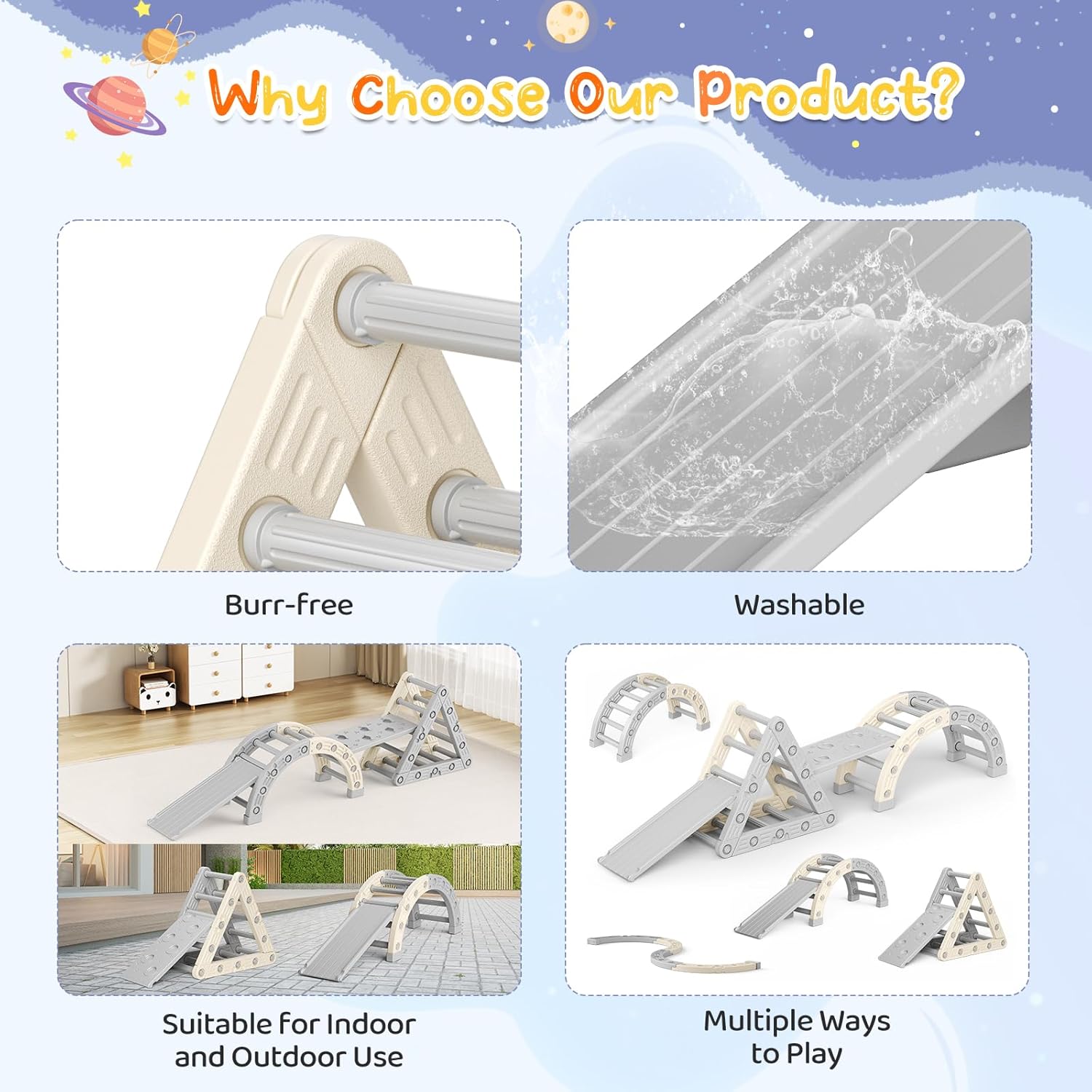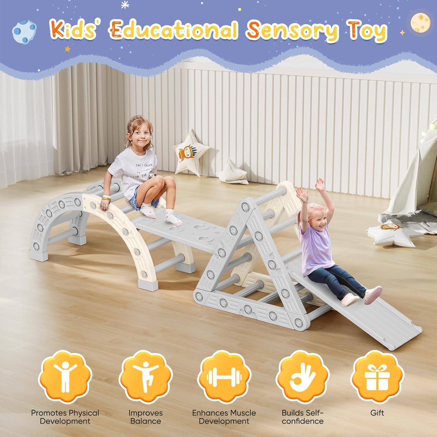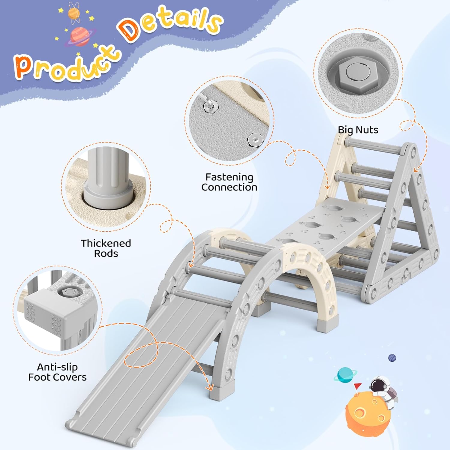 Plusieurs façons de jouer Ce cadre d'escalade en arc propose une variété de modes de jeu, y compris un pont S, un pont semi-cercle, une bascule et une arc d'escalade. Il peut être transformé en hamac ou swing en ajoutant un oreiller (non inclus) ou le couvercle du tissu fourni, en assurant des heures de jeu imaginatif et actif. Sûr et durable Fabriqué à partir de HDPE de haute qualité, sans odor et sans BPA, ce jouet d'escalade pour les tout-petits est certifié CE et construit pour durer. Chaque surface est finement poncée avec une texture mate pour une finition lisse et sans bavarde, tandis que les poignées antidérapantes et les couvercles de pied assurent la stabilité et la sécurité pendant le jeu. Robuste et sécurisé Doté de barres épaissies, de connexions renforcées et de couvertures antidérapantes, cet ensemble de châssis d'escalade peut supporter jusqu'à 50 kg sans vaciller. Sa conception robuste assure un environnement de jeu sûr et stable pour les enfants, qu'ils soient à l'intérieur ou à l'extérieur. Favorise le développement physique Conçu pour améliorer la motricité brute, ce jouet d'escalade intérieur encourage l'escalade, l'équilibrage et le balancement. Il aide à améliorer la coordination des membres, à renforcer la force musculaire et à renforcer la confiance, ce qui en fait un outil idéal pour le développement de la petite enfance. Assemblage facile avec des outils adaptés aux enfants Cette échelle d'arc est livrée avec un manuel d'instructions détaillé, tous les accessoires nécessaires et une clé à foyer pour les enfants pour une configuration sans tracas. Les parents peuvent le rassembler rapidement, permettant aux enfants de commencer à jouer et à explorer en un rien de temps.