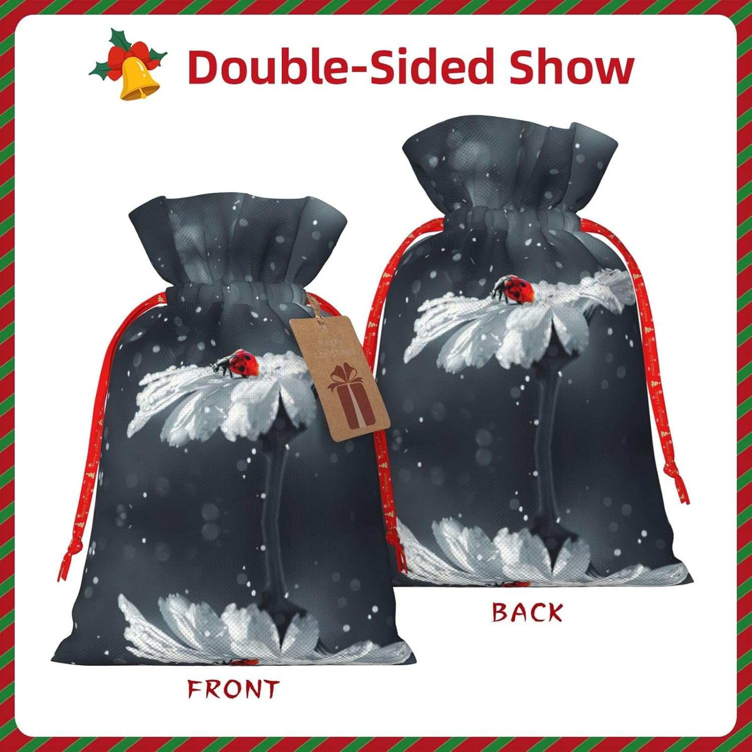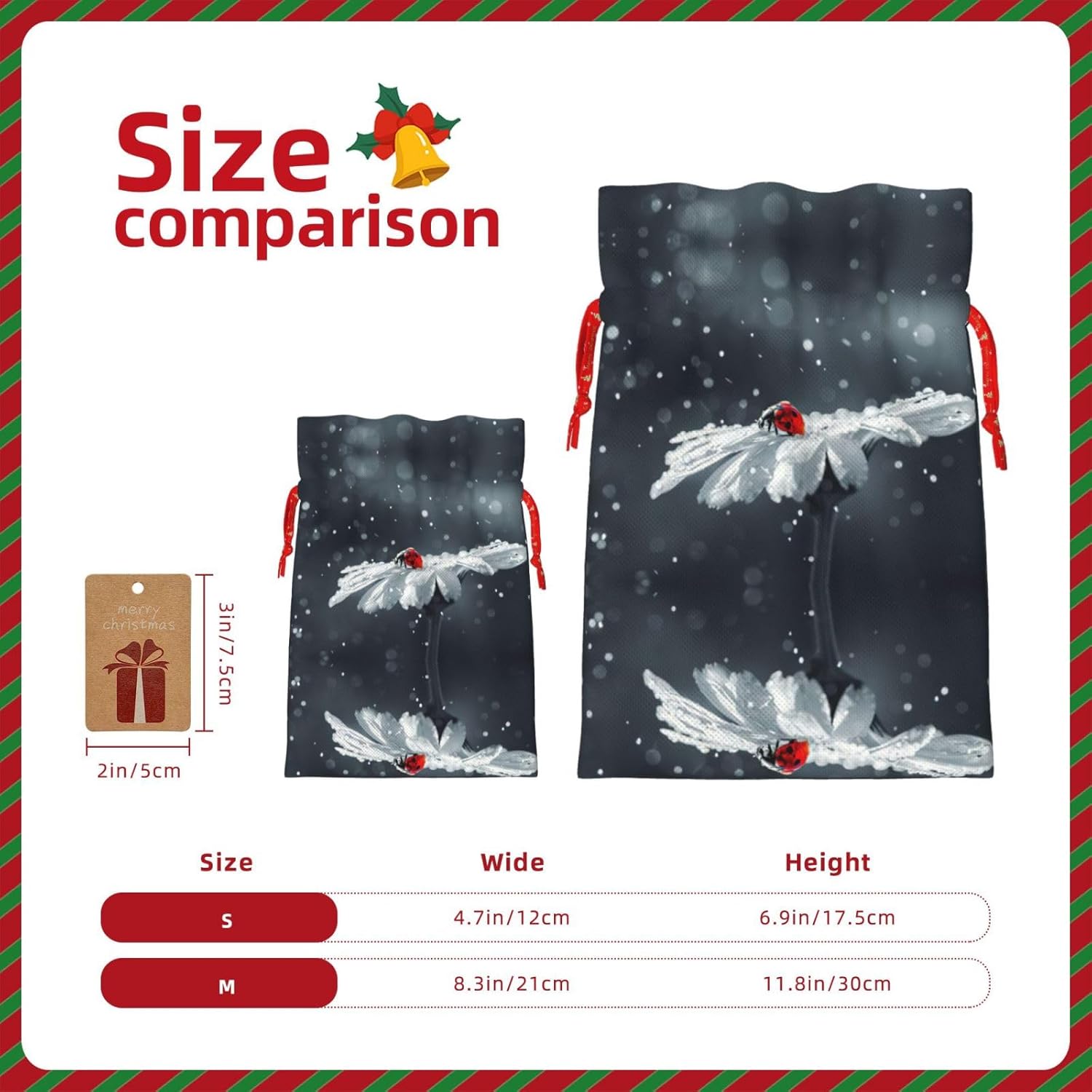 BORSE REGALO DI ALTO VALORE: la borsa con fiori Ladybug on Daisy è dotata di sacchetti regalo con cordoncini colorati ed etichette. I sacchetti regalo sono aggiornati con un design con chiusura a coulisse, sacchetti regalo realizzati in poliestere, resistenti e riutilizzabili. Non si strappano come la carta, ottimi per incartare i regali. 10 secondi per incartare un regalo: la coccinella sulla borsa a margherita per confezionare facilmente i regali, è facile da usare, basta inserire il regalo nelle buste, far scorrere l'etichetta regalo attraverso il nastro, tirare il nastro, annodare un fiocco e il gioco è fatto. Puoi evitare il fastidio associato a carta da imballaggio, forbici, nastro adesivo e nastro, risparmiare tempo e molto conveniente. Dimensioni del sacchetto regalo: i sacchetti regalo in 2 dimensioni possono soddisfare le preferenze di diverse persone e sono sufficienti per l'uso quotidiano e la festa di Natale. La S misura 12 x 17,5 cm e la M misura 12 x 30 cm. Sacchetti regalo in formati assortiti sfusi, perfetti per confezionare regali di diverse dimensioni. REGALO IDEALE: questi sacchetti regalo con coccinelle e margherite possono essere riutilizzati molte volte. Un set di sacchetti regalo riutilizzabili sarà un'aggiunta meravigliosa a qualsiasi regalo e migliorerà l'esperienza complessiva del regalo. Inoltre, abbiamo rinforzato il fondo per una maggiore stabilità e una struttura robusta con carichi pesanti. Non facile da rompere per un uso durevole e duraturo. Sacchetti regalo multifunzionali: questi sacchetti natalizi con coccinella e margherita possono essere utilizzati per conservare regali di Natale, giocattoli, bambole, cappelli natalizi, caramelle e regali durante la festa di Natale. Conservare i regali in questa borsa darà ai bambini più sorprese perché non sanno cosa c'è dentro.