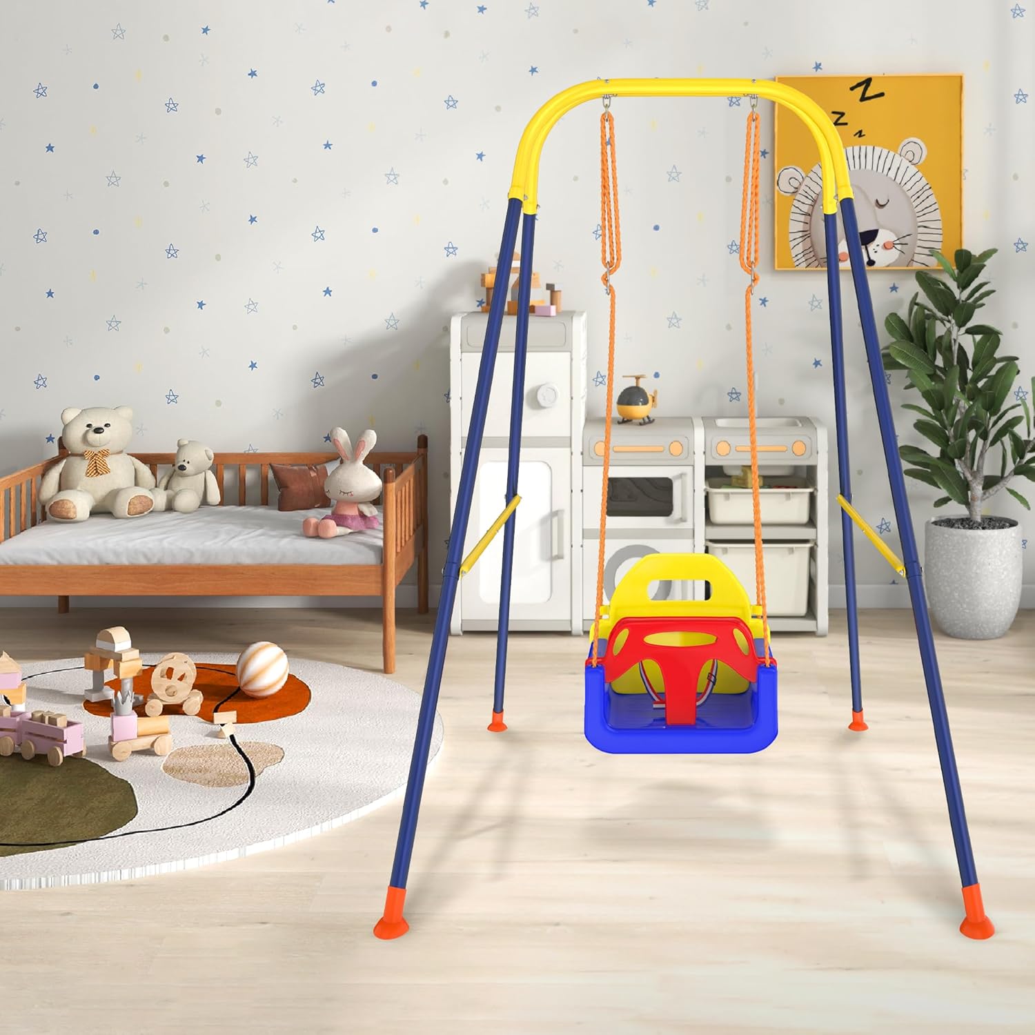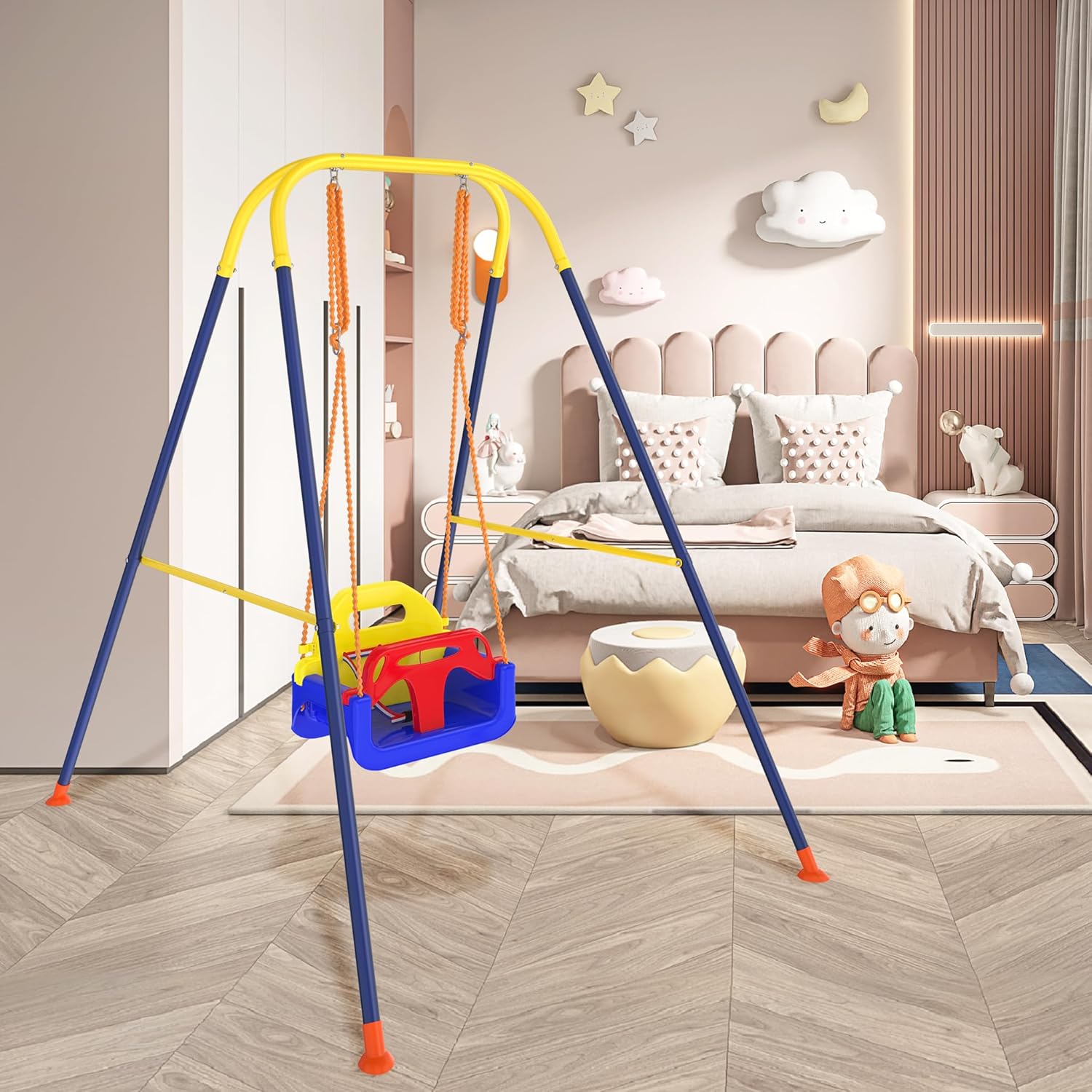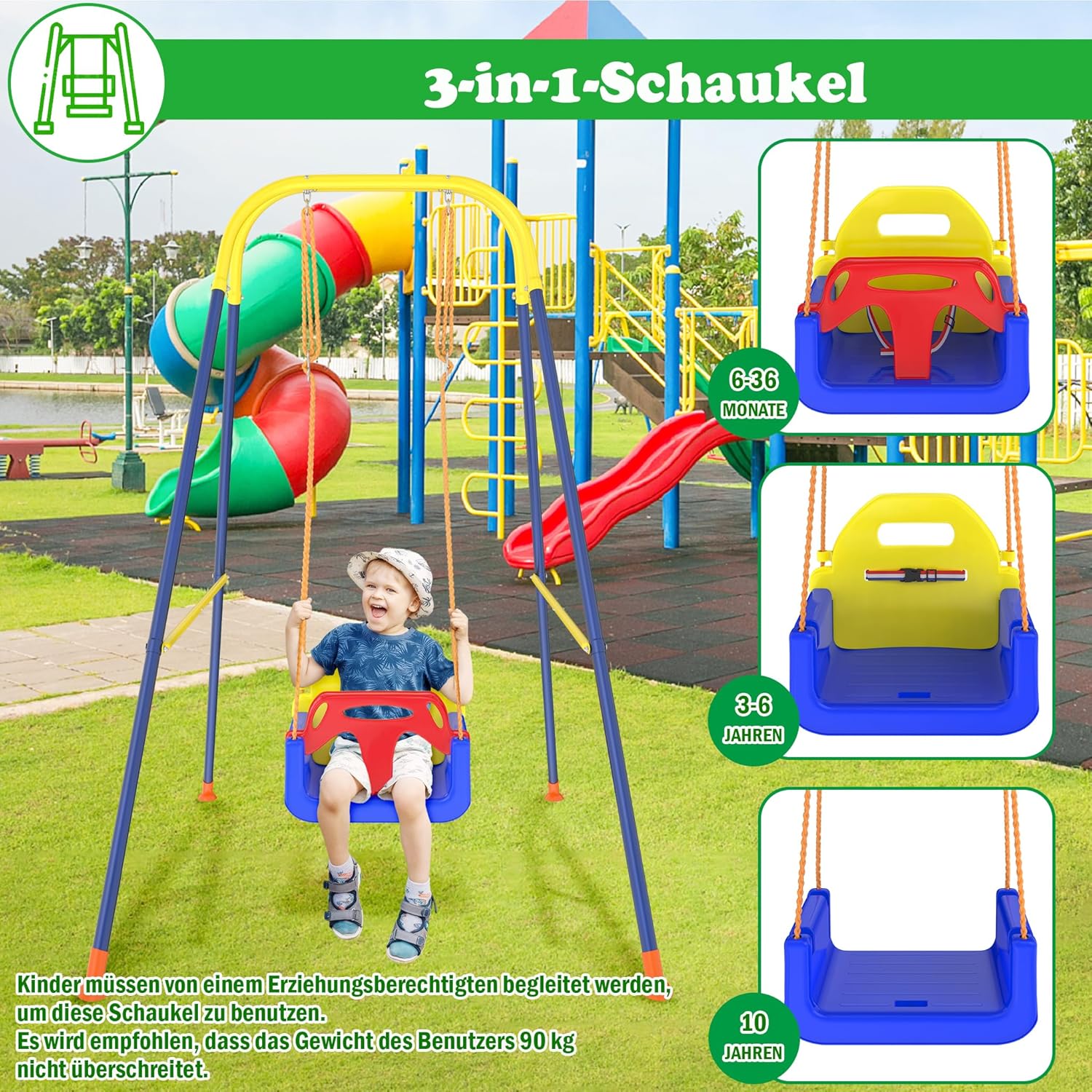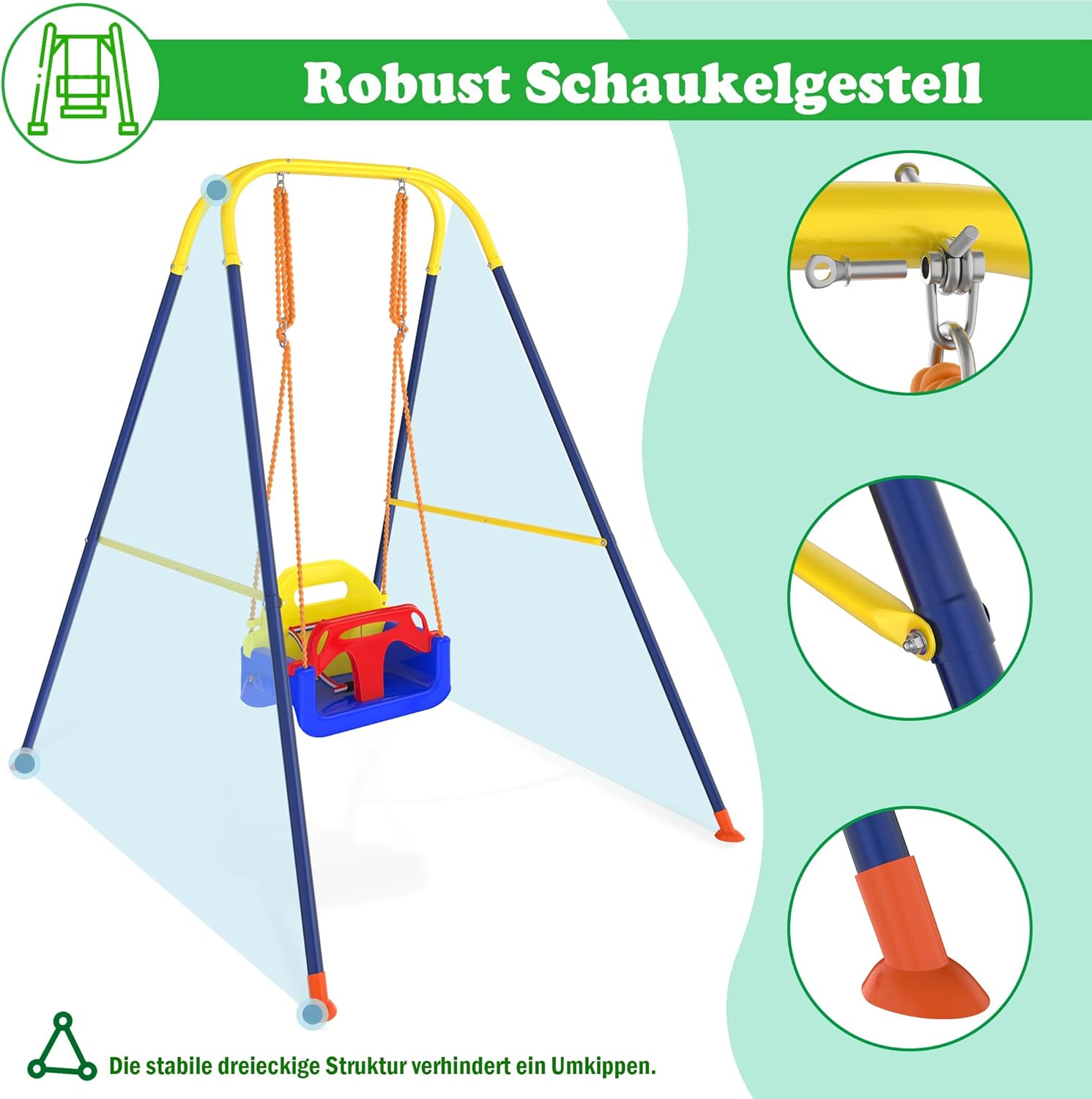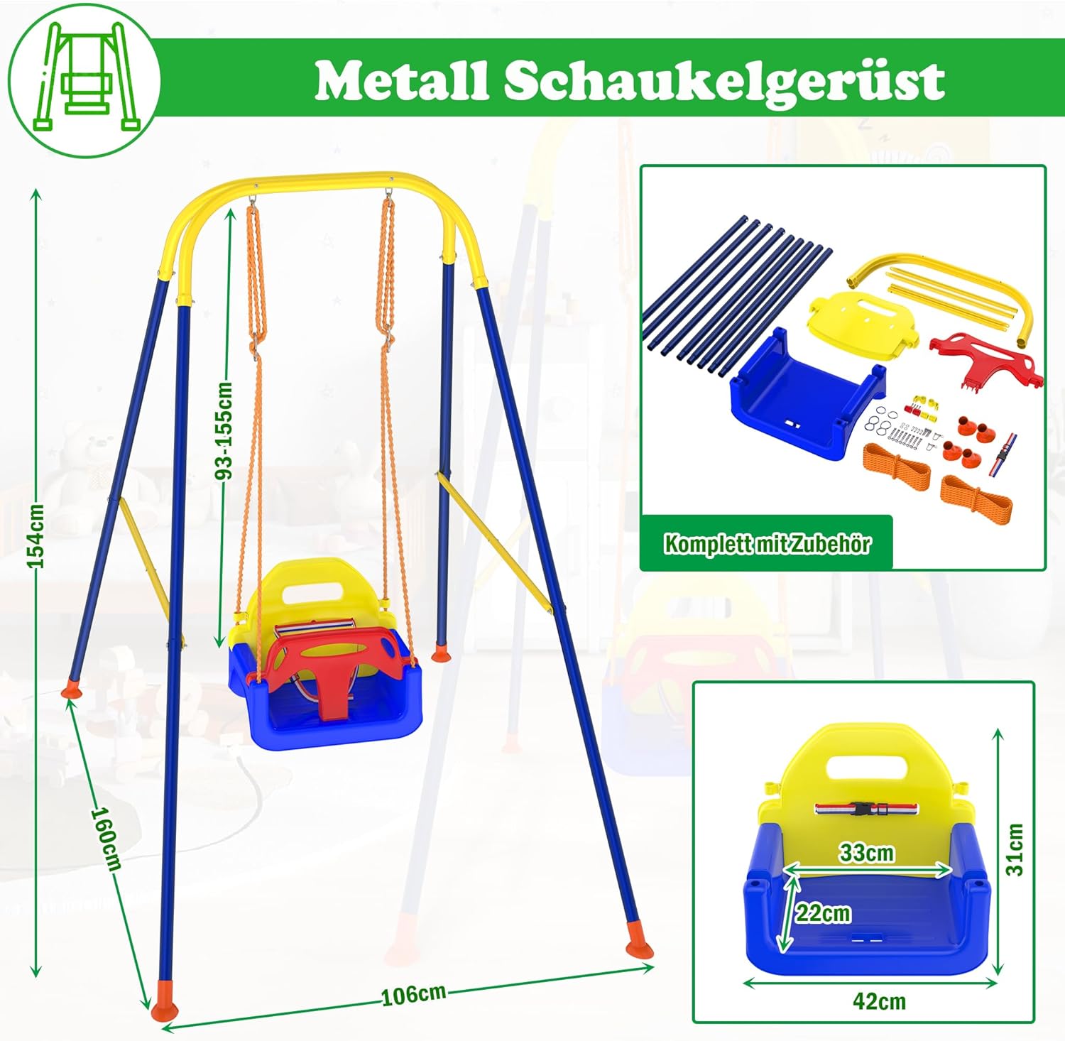 Impalcatura dell'altalena: materiale: telaio in acciaio, lunghezza della distanza della corda regolabile: 93-155 cm, capacità di carico: 90 kg, dimensioni del telaio (A x L x P): 154 x 106 x 160 cm, dimensioni del sedile dell'altalena (L x L x A): 42 x 31 x 33 cm, età consigliata: 6 mesi - 10 anni struttura dell'altalena in metallo: l'altalena è realizzata con una combinazione di tubi in acciaio massiccio espandibili di alta qualità con una superficie liscia e rivestimento antiruggine. Il set ha una stabile struttura triangolare che ne impedisce il ribaltamento e il fondo è dotato di piedini antiscivolo per aumentare la sicurezza durante l'utilizzo. Altalena per bambini pieghevole: l'altalena per bambini è pieghevole, quindi è poco ingombrante e facile da riporre. Quando assembli e riponi l'altalena con tuo figlio, alleni le abilità artigianali e il pensiero spaziale di tuo figlio mentre ti godi il tempo genitore-figlio. Altalena 3 in 1: con la corda in nylon regolabile in lunghezza, questa altalena è adatta a bambini dai 6 mesi ai 10 anni e di peso inferiore a 90 kg. E a seconda delle diverse esigenze di utilizzo, puoi anche installare diverse attrezzature aggiuntive, come: corda di sicurezza, ringhiera dell'altalena, ecc. Lettino per bambini versatile: l'altalena può essere utilizzata sia all'interno del soggiorno che all'esterno in giardino, così il tuo bambino potrà divertirsi ovunque.