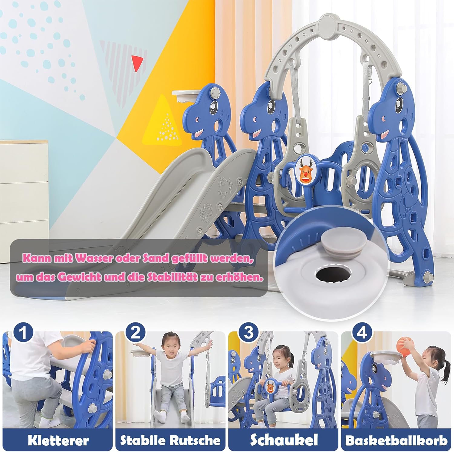 Divertimento versatile: questo scivolo per bambini 4 in 1 combina una scaletta, uno scivolo, un'altalena e un canestro da basket per offrire al bambino un divertimento infinito e allo stesso tempo promuovere le capacità motorie e la creatività. Sicuro e resistente: il nostro scivolo per bambini è realizzato in materiale PE/PP durevole, atossico ed ecologico e ha una base che può essere riempita di sabbia per aumentare il peso e garantire una maggiore stabilità. Il sedile a dondolo più ampio viene fornito con una staffa a T protettiva e una cinghia. Le fasce ammortizzanti estese aumentano l'ammortizzazione nello scivolo, in modo che i bambini non si feriscano quando escono dallo scivolo. Facile da montare: questo scivolo per bambini viene fornito con istruzioni di montaggio facili da seguire e tutti gli accessori necessari, in modo da poter trascorrere meno tempo a montare e avere più tempo a guardare il vostro bambino giocare. Giocare in interni ed esterni: sia all'interno che all'esterno, i nostri scivoli si adattano perfettamente per intrattenere i bambini energici tutto l'anno. Tempo di gioco energizzante: i nostri scivoli per bambini sono dotati di simpatiche forme di animali che stimolano l'immaginazione del vostro bambino. Che si tratti di un viaggio di scoperta da solo o con gli amici, questo scivolo garantisce ore di divertimento, risate e ricordi indimenticabili.