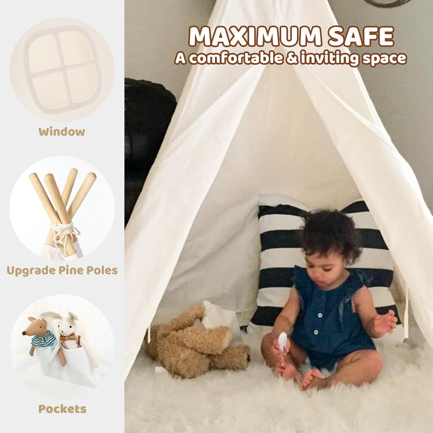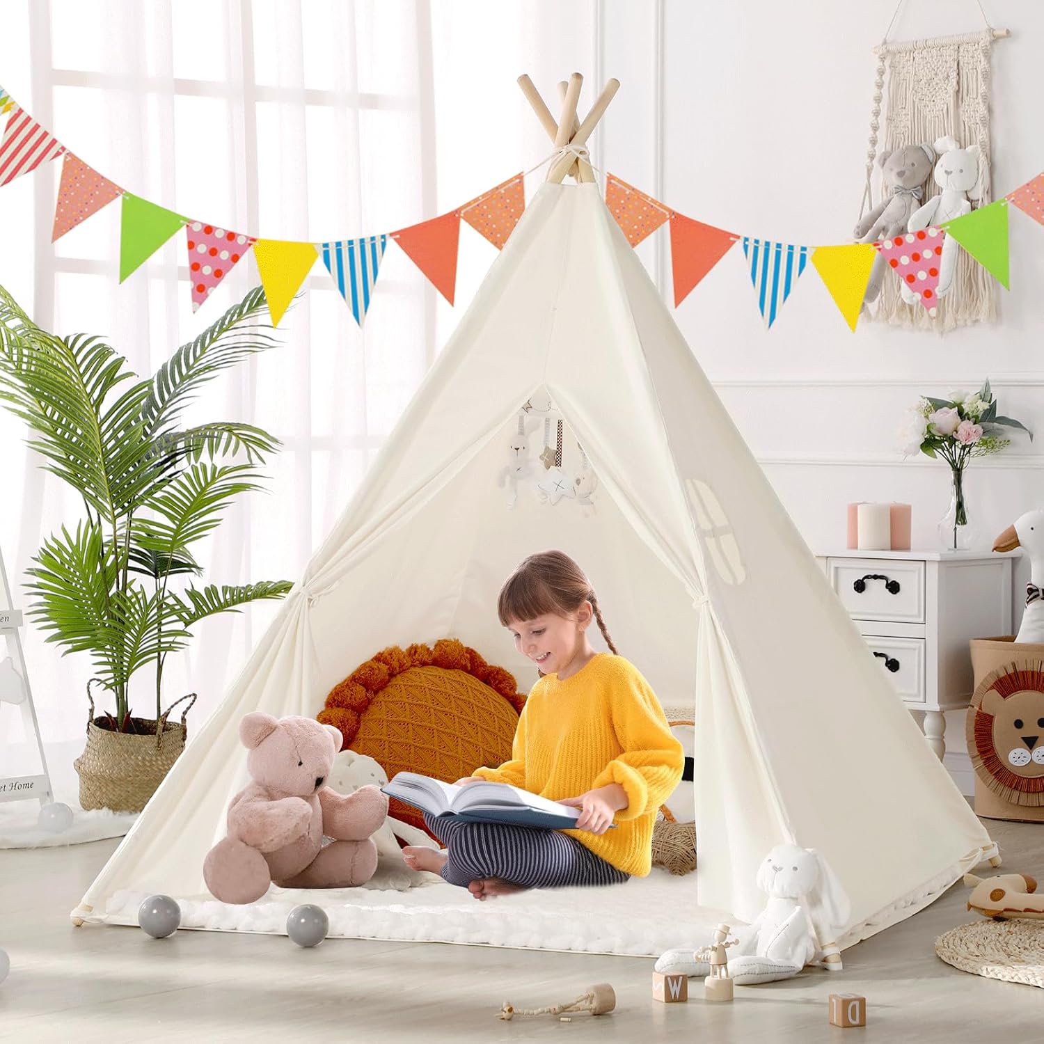 Portatile e vouwbar: la tenda per bambini viene fornita con istruzioni (lingua italiana non garantita), in modo che possa essere facilmente montata e riposta. Una volta assemblato correttamente, è molto stabile. È facile da trasportare all'interno o all'esterno e si ripiega come un ombrello in luoghi come sotto il letto, sotto il divano o nell'armadio. È perfetta anche per uso esterno, ideale per fotografia, viaggi o pic-nic Materiali atossici e stabilità: questa tenda per bambini è realizzata in tessuto di poliestere di alta qualità e legno di pino privo di formaldeide. I materiali sono spessi e stabili, il che garantisce una lunga durata. I genitori possono essere rassicurati che non si rompe mentre i bambini giocano e offrono ai piccoli esploratori uno spazio sicuro per sognare, giocare e crescere Ampio spazio e versatilità per diversi ambienti: questo tipo per bambini può contenere fino a 3 bambini. All'interno ci sono due tasche portaoggetti per libri e peluche. Funziona perfettamente in camere da letto, sale giochi, soggiorni, presepi e fotografia per bambini ed è ideale anche in ambienti esterni, come in spiaggia, per picnic o matrimoni ordinati Uno spazio privato per i bambini: la tenda anteriore di questa tenda si chiude completamente, mentre i finestrini laterali garantiscono una buona circolazione dell'aria. Lasciate che i vostri piccoli aprano la loro immaginazione in questa stanza speciale – sia i ragazzi che le ragazze possono leggere, dipingere, giocare e persino dormire in questo piccolo rifugio segreto Il regalo perfetto per i bambini: ogni bambino sogna di avere un piccolo spazio, e questa tenda per bambini porterà senza dubbio una gioia extra nella loro vita quotidiana. All'interno possono leggere, suonare storie immaginarie o godersi altre attività divertenti. Lasciate che personalizzino la vostra tenda e promuovano la loro immaginazione mentre decorano la vostra piccola casa.Nota amichevole: il prodotto non contiene catene luminose
