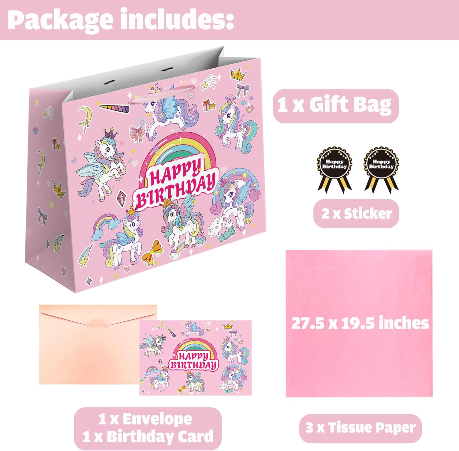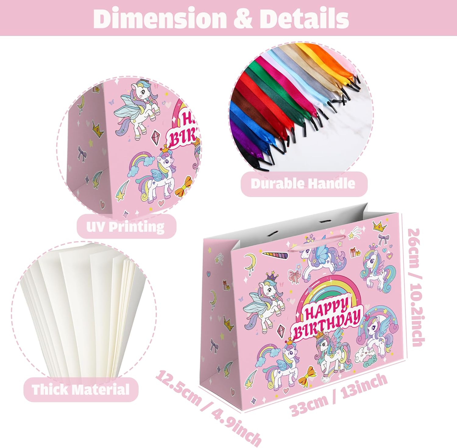 Confezione: riceverai 1 sacchetto regalo di compleanno arcobaleno + 3 carte veline rosa + 2 adesivi di compleanno + 1 biglietto di auguri con busta. Soddisfa tutte le tue esigenze di confezione regalo e lascia un'impressione profonda. Stampa UV: la stampa UV rende il colore della borsa più vivido e luminoso. Il design unico della borsa fa risaltare i tuoi regali dalla massa. Abbiamo combinato l'arcobaleno e il cavallo colorato, rendendolo più adatto ai compleanni di bambini e bambine. Materiale: la borsa regalo di compleanno è realizzata in cartone spesso 300 g/m², ha manici in nastro rosa e un fondo rinforzato, rendendo la borsa abbastanza robusta da contenere i tuoi regali di compleanno. La superficie del materiale è rivestita con pellicola in PVC trasparente, che rende la borsa impermeabile e resistente ai colori. Grandi dimensioni: la dimensione della borsa compleanno è L 33 x P 12,5 x H 26 cm, la dimensione del biglietto d'auguri è L 15 x H 10 cm quando piegato (L 15 x H 20 cm quando aperto), la dimensione dell'adesivo compleanno è H 6,6 x P 4,6 cm e la dimensione della carta velina è L 70 x P 50 cm Utilizzo: perfetto per trasportare e confezionare regali di compleanno come giocattoli, libri, puzzle, giochi da tavolo, materiale artistico, attrezzature sportive e dispositivi elettronici. Porta più gioia alla tua festa ed esprimi pienamente il tuo amore speciale