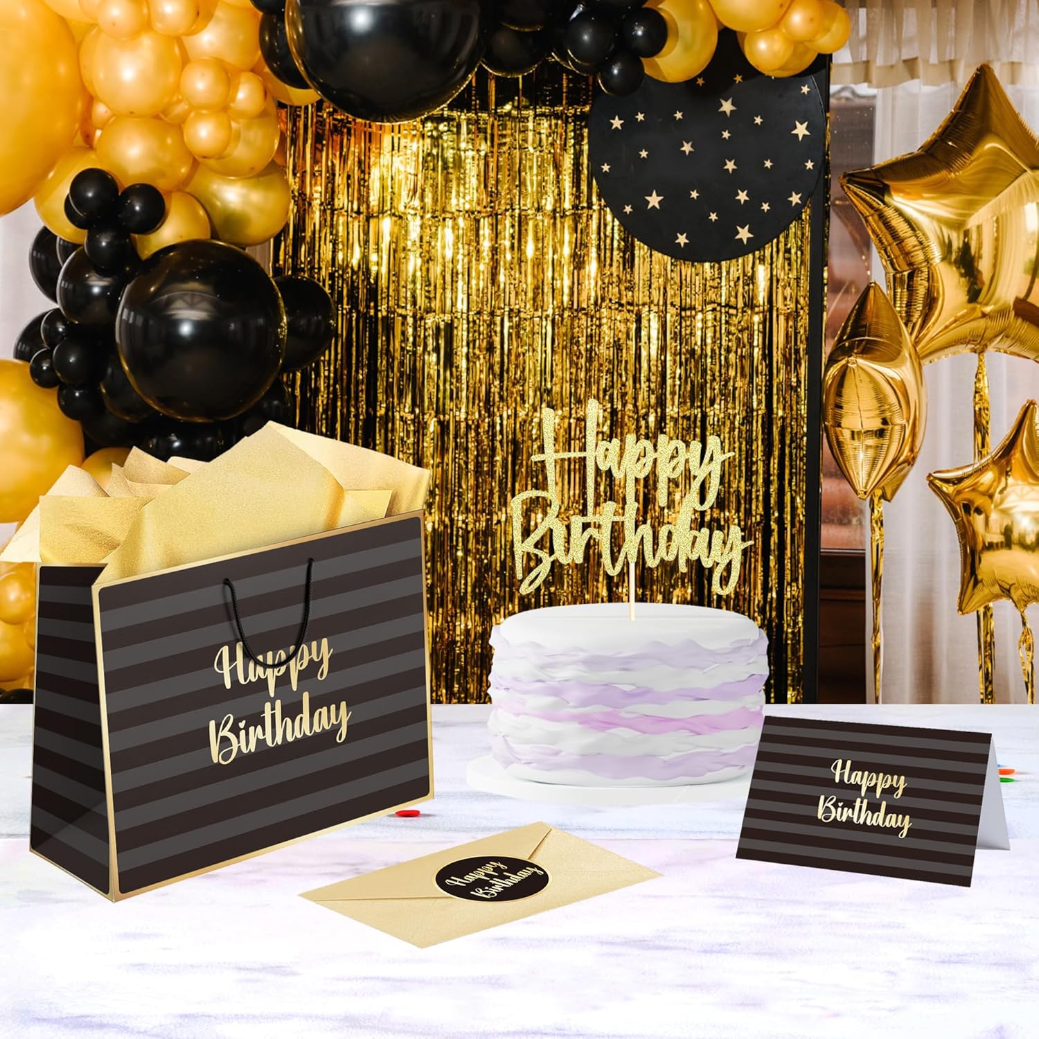 Confezione: riceverai 1 sacchetto regalo di compleanno + 3 pezzi di carta velina dorata + 2 adesivi di compleanno + 1 biglietto d'auguri con busta, soddisfa tutte le tue esigenze di confezione regalo e lascia un'impressione profonda. Sacchetto regalo di compleanno: stampa UV per le strisce nere e grigie, goffratura dorata per la scritta "Happy Birthday" e strisce sui bordi assicurano un look classico e alla moda. All'interno della borsa regalo c'è una tasca per busta e biglietto di auguri, che aggiunge un tocco celebrativo. Il retro del sacchetto regalo di compleanno è trasparente, così puoi esporre in modo ottimale i tuoi regali squisiti attraverso la finestra trasparente. Materiale: il sacchetto regalo di compleanno è realizzato in cartone da 300 g/m², ha manici in cotone nero e una base rinforzata, che lo rendono abbastanza robusto da trasportare i tuoi regali. La superficie è rivestita con pellicola in PVC trasparente, che rende la borsa impermeabile e resistente ai colori. La combinazione di nero e oro conferisce ai tuoi regali di compleanno un aspetto alla moda ed elegante ed esprime il tuo amore speciale. Grandi dimensioni: la dimensione del sacchetto regalo di compleanno è L 33 x P 12,5 x A 26 cm, abbastanza grande per trasportare regali di compleanno come giocattoli, libri, puzzle, giochi da tavolo, materiale artistico, attrezzature sportive e dispositivi elettronici. La dimensione del biglietto d'auguri è L 15 x H 10 cm quando piegato (L 15 x H 20 cm quando aperto), l'adesivo rotondo di compleanno ha un diametro di 5 cm e la dimensione della carta velina dorata è L 70 x L 50 cm Design unico: vogliamo mostrare un atteggiamento semplice ed elegante nei confronti della vita invece che abbagliante. La striscia nera e grigia rappresenta una giornata semplice, il colore oro metallizzato di "Happy Birthday" significa che dobbiamo vivere con eleganza ogni giorno anche se è semplice. Questi sono i nostri migliori auguri per ciascuno dei nostri clienti