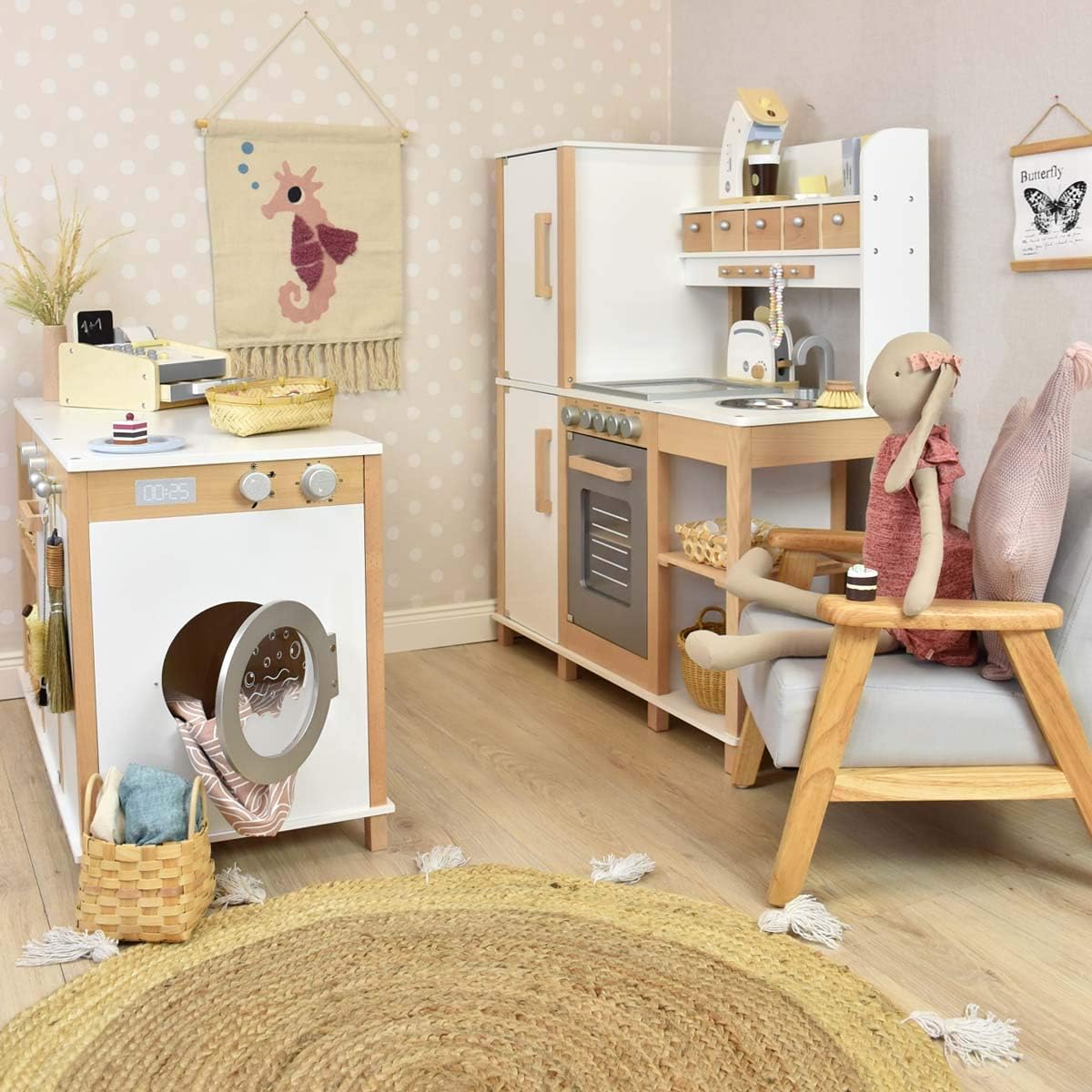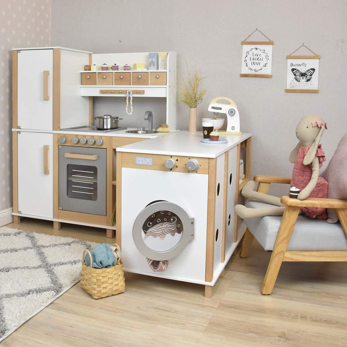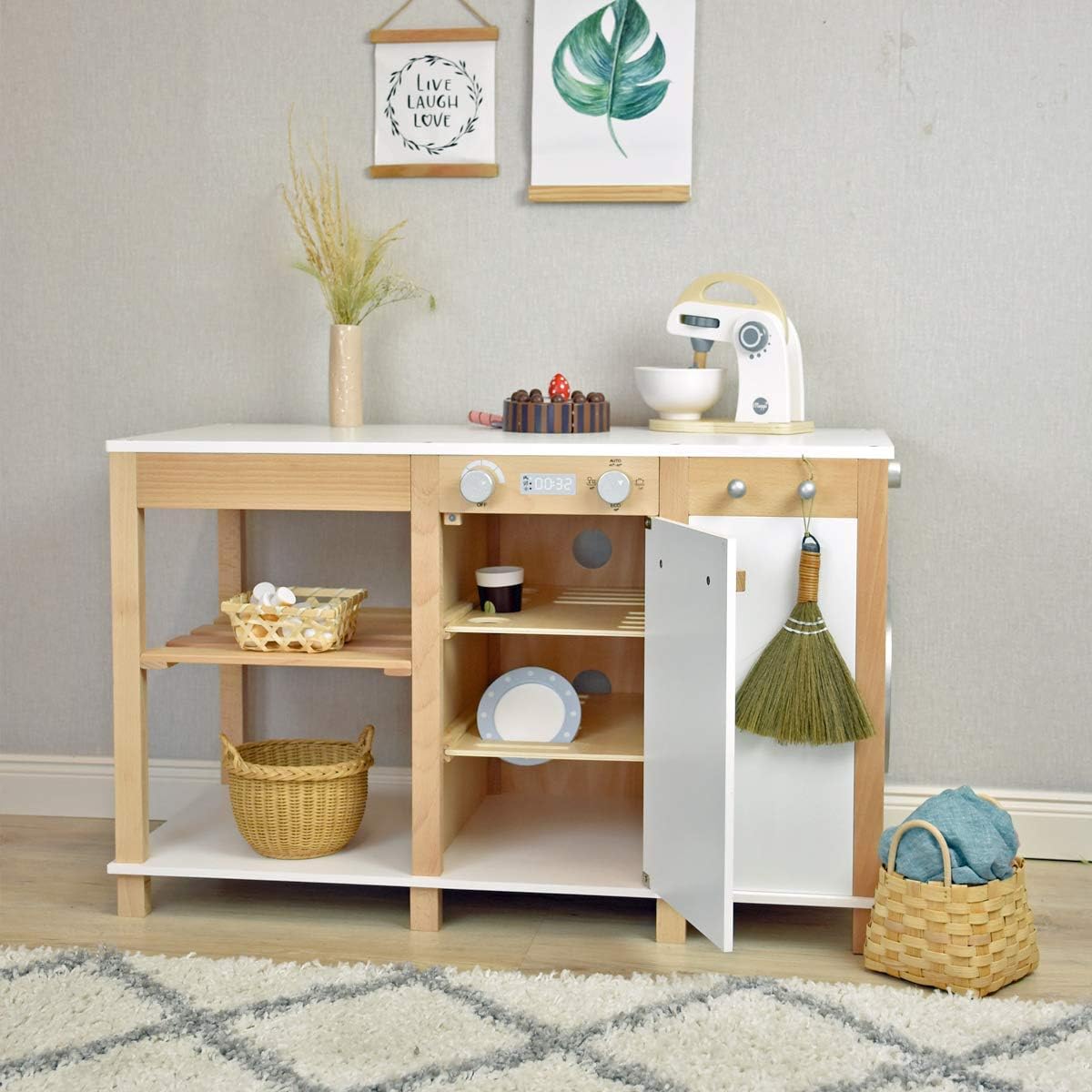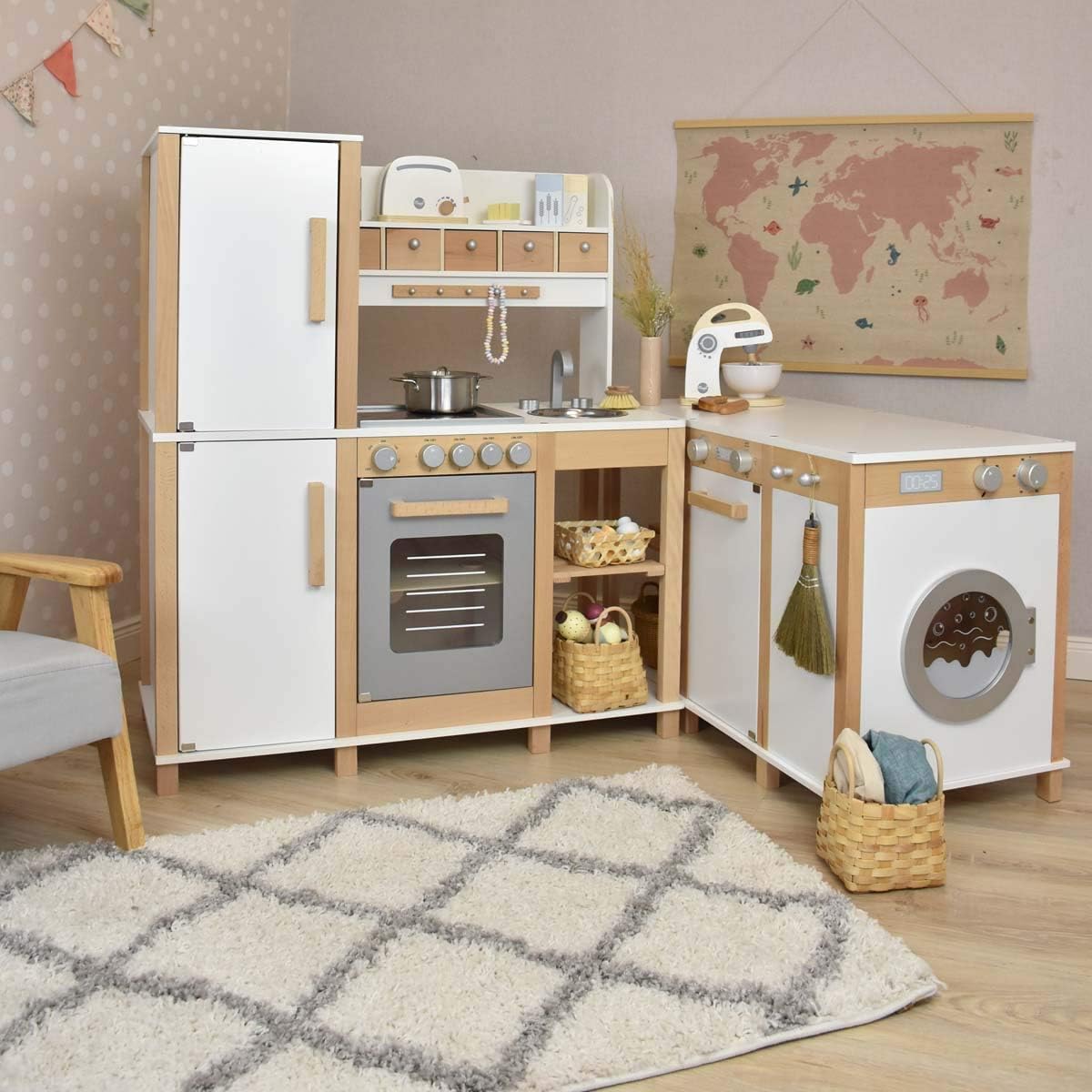 Dimensioni del prodotto in cm: Cucina: 83 x 37 x 95 Estensione: 52 x 37 x 95 Altezza del piano di lavoro in cm: 52 Con questa ampia combinazione di cucine per bambini di SUN, puoi trasformare la stanza dei bambini / soggiorno in un'entusiasmante area giochi in cui la cucina e l'ampliamento appropriato possono essere sistemati più e più volte e adattati alle esigenze individuali. Gli accessori mostrati includono: no