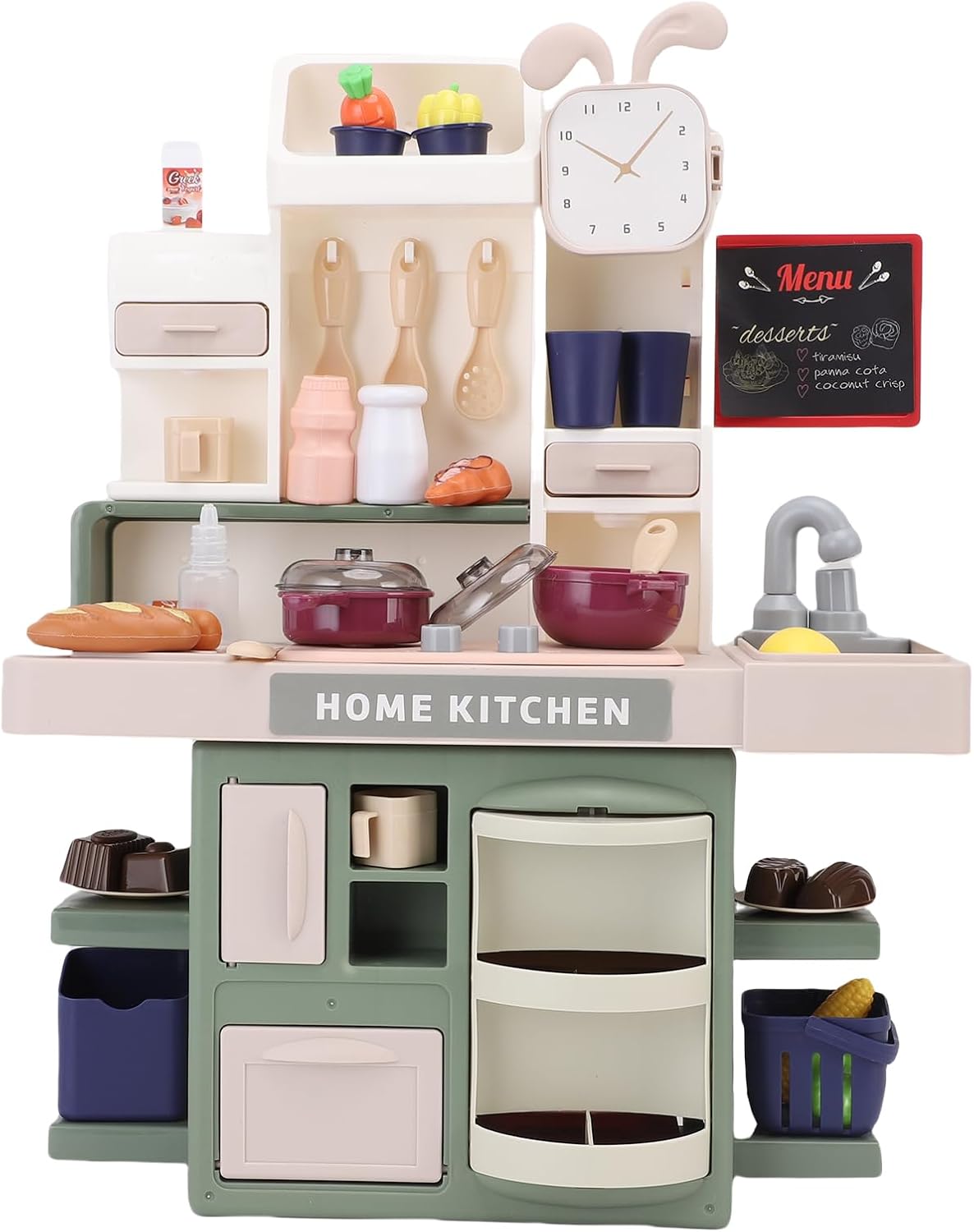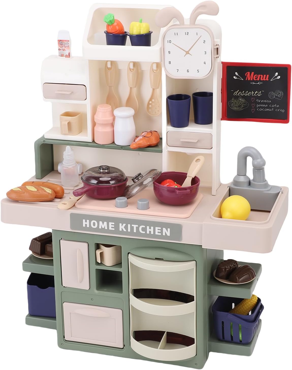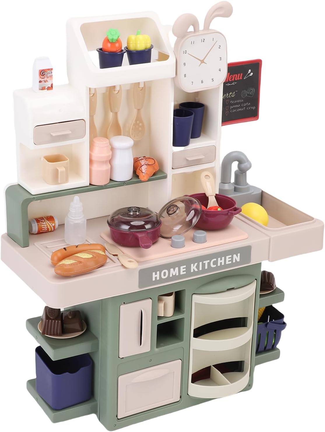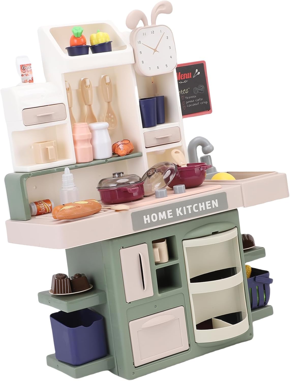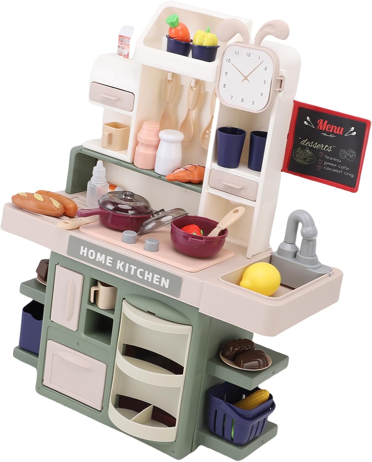 [SET DA GIOCO INTERATTIVO DA CUCINA CON SUONO E LUCE] Il set da gioco da cucina per bambini è dotato di un lavello a spruzzo con suono dell'acqua che scorre e luci del fornello fumose, che simulano azioni di taglio e cottura per coinvolgenti sessioni di gioco di ruolo. [GIOCO DI FANTASIA SICURO PER I BAMBINI] Questa cucina giocattolo vanta bordi arrotondati in plastica e pomelli in gomma, fornendo un ambiente sicuro per i più piccoli. Le luci lampeggiano durante la "cucina", aggiungendo eccitazione senza rischio di soffocamento. [ZONA DELL'ACQUA PER L'APPRENDIMENTO DELLA PULIZIA] Con un rubinetto a pompa, questo set da gioco insegna le routine di lavaggio dei piatti mentre le superfici asciutte garantiscono la pulizia nelle stanze dei giochi. [DIVERTIMENTO MULTIPLAYER] Progettato per ospitare 2-3 bambini, questo playset di colore verde promuove sessioni di gioco cooperativo della durata di oltre 40 minuti, come riportato dai genitori. [DESIGN SALVASPAZIO] Questo set da gioco compatto da cucina si ripiega per riporlo facilmente nell'armadio e pesa 3,3 libbre, rendendo facile per i nonni sollevarlo e riporlo.