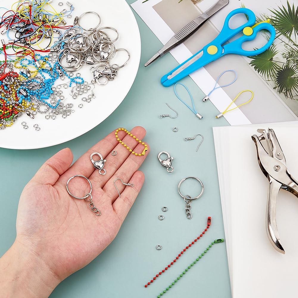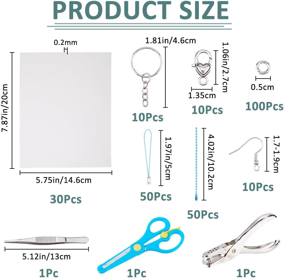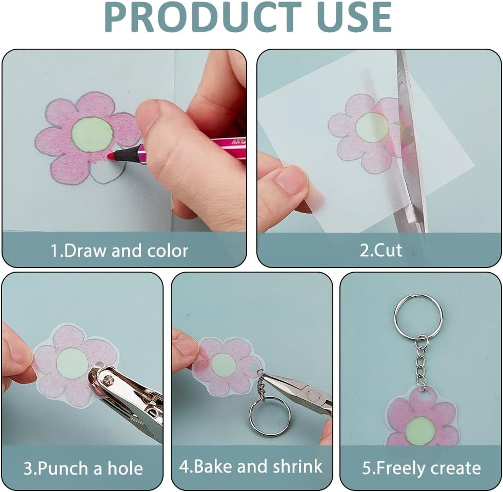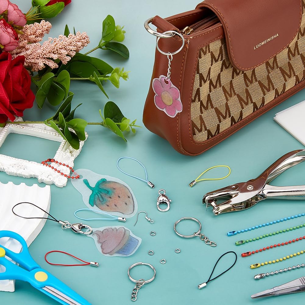 Set di pellicole termoretraibili: la confezione contiene 10 pezzi. Split - Anelli portachiavi, 10 pezzi Ganci per orecchini, 30 pezzi. Fogli termoretraibili, 50 pezzi. 1 braccialetto per cellulare. Forbici in acciaio inox e plastica ABS, 1 pezzo. Pinze per gioielli, 10 pezzi. Moschettone a forma di cuore, 10 pezzi. Catene a sfera, 100 pezzi. Anelli di collegamento aperti e 40 pezzi. Catene complete con ciondoli per decorazioni e fai da te. Creatività illimitata: schizzi e ritaglia forme libere, combinalo con uno spettro di colori diverso, per risvegliare la tua ispirazione creativa e creare accessori personalizzati unici. Accessori completi: i fogli in pellicola termoretraibile contengono un ampio assortimento di strumenti (inclusi perforatori, anelli portachiavi ecc.), in modo da poter realizzare non solo portachiavi, ma anche ciondoli, orecchini, etichette regalo e vari altri accessori. Materiale: i fogli in pellicola termoretraibile sono realizzati in plastica e vengono convertiti in una superficie stabile e liscia senza bordi taglienti. Sicuro e inodore, ideale per progetti di artigianato. Molteplici applicazioni: il regalo perfetto fatto a mano per gli amici, combina divertimento con l'apprendimento, adatto per scuole, casa e feste artigianali.