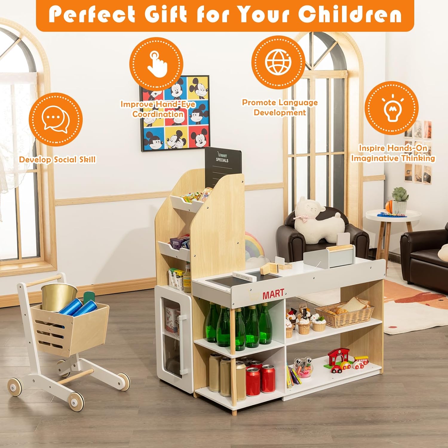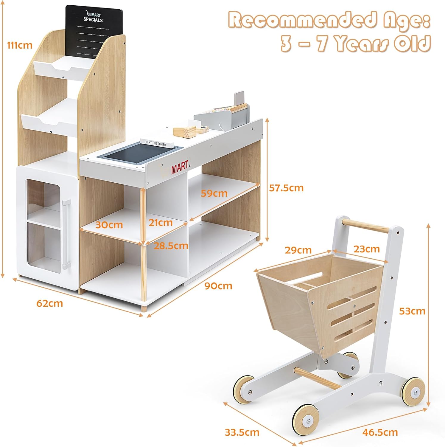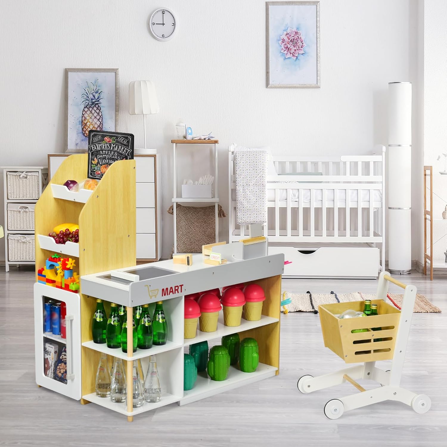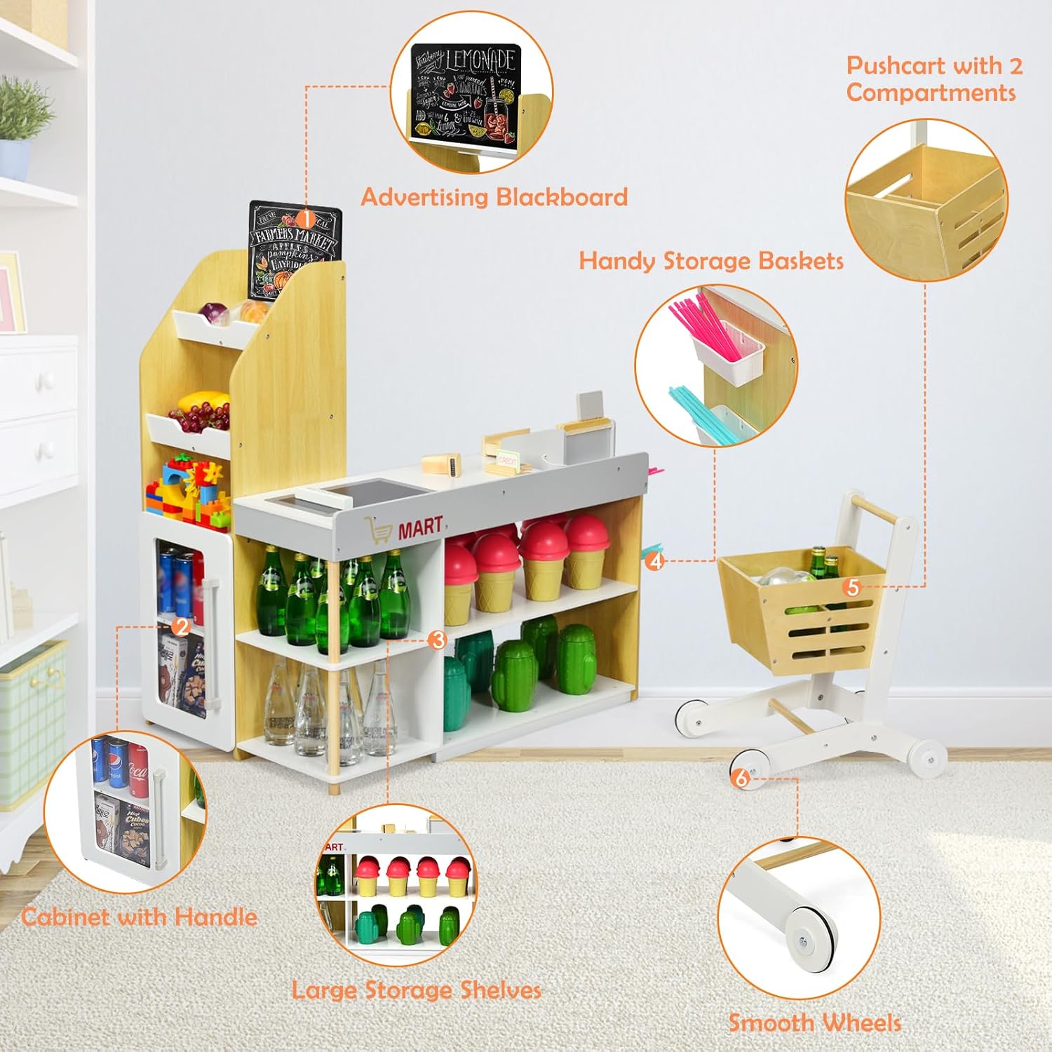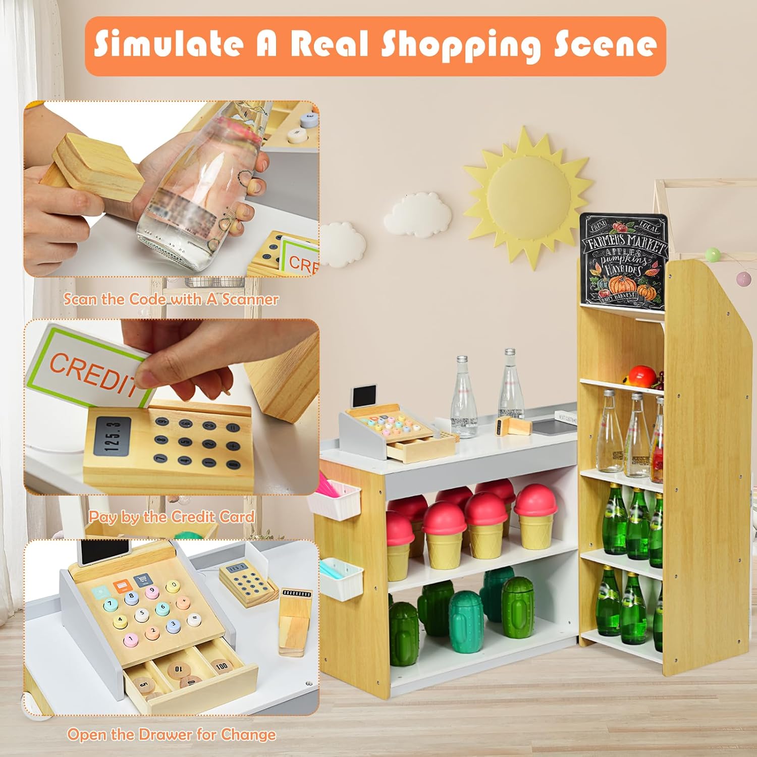 VERA ESPERIENZA INTERATTIVA: Ispirato alle situazioni reali di cassa del supermercato, questo set di giocattoli da supermercato consente ai bambini di simulare il reale processo di acquisto e pagamento e stimola la loro immaginazione e capacità di gioco di ruolo. I bambini possono scegliere i propri prodotti, curiosare tra gli scaffali e vivere la vera esperienza di acquisto con i loro amici FUNZIONE FRIGORIFERO: Questo negozio è appositamente attrezzato con un piccolo frigorifero con fermaporta e maniglia per consentire ai bambini di congelare vari alimenti. Il giocattolo non è solo divertente, ma allena anche il pensiero logico e le capacità organizzative dei bambini. GIOCO INTERATTIVO: Questo set da negozio per bambini è dotato di un carrello della spesa rimovibile, uno scanner, un lettore di carte e monete di legno con cui i bambini possono giocare a vari giochi, come: B. Selezionare prodotti, scansionare prodotti, pagare e pagare, ecc. per migliorare le loro capacità operative e il pensiero logico MATERIALI DI QUALITÀ GARANTITA: La sicurezza dei bambini è la prima priorità, questo negozio di alimentari è realizzato in MDF di alta qualità e legno di pino massiccio, che è robusto e durevole, non presenta sbavature e non danneggia la pelle dei bambini. I bordi lisci e gli angoli arrotondati garantiscono anche la sicurezza del giocattolo, così i genitori possono essere certi che i loro bambini giocheranno in sicurezza. SIGNIFICATO EDUCATIVO: questo negozio non è solo un giocattolo di intrattenimento ma anche uno strumento educativo. Simulando lo shopping e il pagamento, i bambini possono apprendere concetti relativi al denaro, metodi di calcolo e abilità sociali e coltivare il loro spirito di cooperazione, senso di responsabilità e cura di sé, rendendolo un regalo perfetto per i bambini